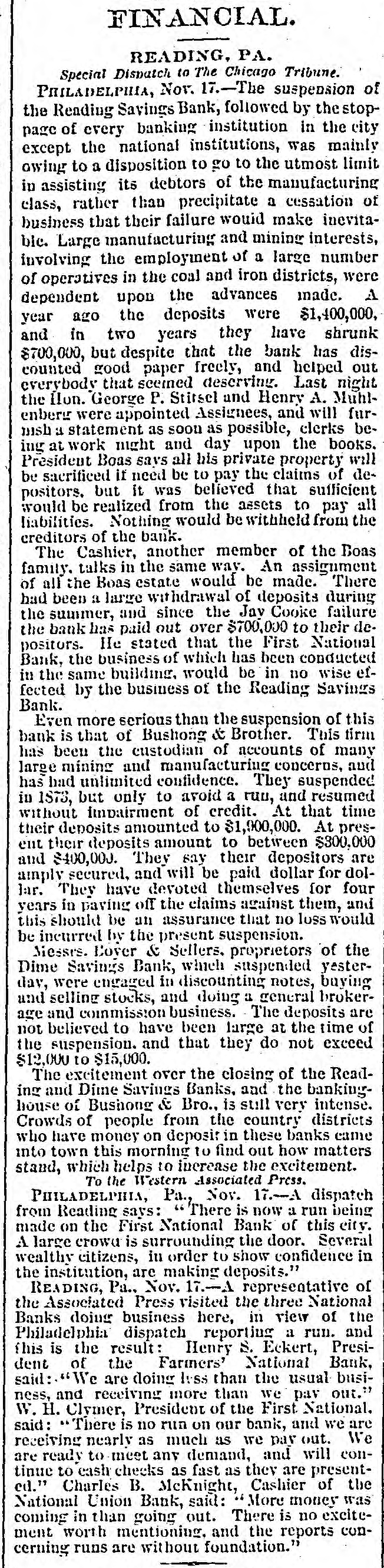 FINANCIAL. READING, PA. Special Disputch to The Chicago Tribune. PRILADELPHIA, Nov. 17.-The suspension of the Reading Savings Bank, followed by the stoppage of every banking institution in the city except the national institutions, was mainly owing to a disposition to go to the utmost limit in assisting its debtors of the manufacturing class, rather than precipitate a cessation of business that their failure would make inevitablc. Large manufacturing and mining interests, involving the employment of a large number of operatives in the coal and iron districts, were dependent upon the advances made. A year ago the deposits were $1,400,000, and in two years they have shrunk $700,000, but despite that the bank has discounted good paper freely, and helped out everybody that seemed deserving. Last night the Ilon. George P. Stirsel and Henry A. Muhlenberg were appointed Assignees, and will furmish a statement as soon as possible, clerks being at work might and day upon the books. President Boas says all his private property will be sacrificed if need be to pay the claims of depositors. but it was believed that sufficient would be realized from the assets to pay all liabilities. Nothing would be withheld from the creditors of the bank. The Cashier, another member of the Boas family. talks in the same way. An assignment of all the Boas estate would be made. There had been a large withdrawal of deposits during the summer, and since the Jav Cooke failure the bank has paid out over $700,000 to their depositors. He stated that the First National Bank, the business of which has been conducted in the same building. would be in no wise effected by the business of the Reading Savings Bank. Even more serious than the suspension of this bank is that of Bushong & Brother. This firm has been the custodian of accounts of many large mining and manufacturing concerns, and has had unlimited confidence. They suspended in 1873, but only to avoid a rull, and resumed without impairment of credit. At that time their deposits amounted to $1,900,000. At present their deposits amount to between $300,000 and $400,000. They say their depositors are amply secured, and will be paid dollar for dollar. They have devoted themselves for four years in paving off the claims against them, and this should be an assurance that no loss would be incurred by the present suspension. Messrs. Loyer & Sellers. proprietors of the Dime Savings Bank, which suspended yesterday, were engaged in discounting notes, buying and selling stocks, and doing a general brokerage and commission business. The deposits are not believed to have been large at the time of the suspension. and that they do not exceed $12,000 to $15,000. The excitement over the closing of the Reading and Dime Savings Banks, and the bankinghouse of Bushong & Bro., is still very intense. Crowds of people from the country districts who have money on deposit in these banks came into town this morning to find out how matters stand, which helps to increase the excitement. To the Western Associated Press. PHILADELPHIA, Pa., Nov. 17.-A dispatch from Reading says: " There is now a run being made on the First National Bank of this city. A large crowd is surrounding the door. Several wealthy citizens, in order to show confidence in the institution, are making deposits." READING, Pa., Nov. 17.-A representative of the Associated Press visited the three National Banks doing business here, in view of the Philadelphia dispatch reporting a run. and fhis is the result: Henry S. Eckert, President of the Farmers' National Bank, said: "We are doing less than the usual business, and receiving more than we pay out." W. H. Clymer, President of the First National. said: There is no run on our bank, and we are receiving nearly as much as we pay out. We are ready to meet any demand, and will continue to cash checks as fast as they are presented." Charles B. McKnight, Cashier of the National Union Bank, said: .. More money was coming in than going out. There is no excitement worth mentioning. and the reports concerning runs are without foundation."