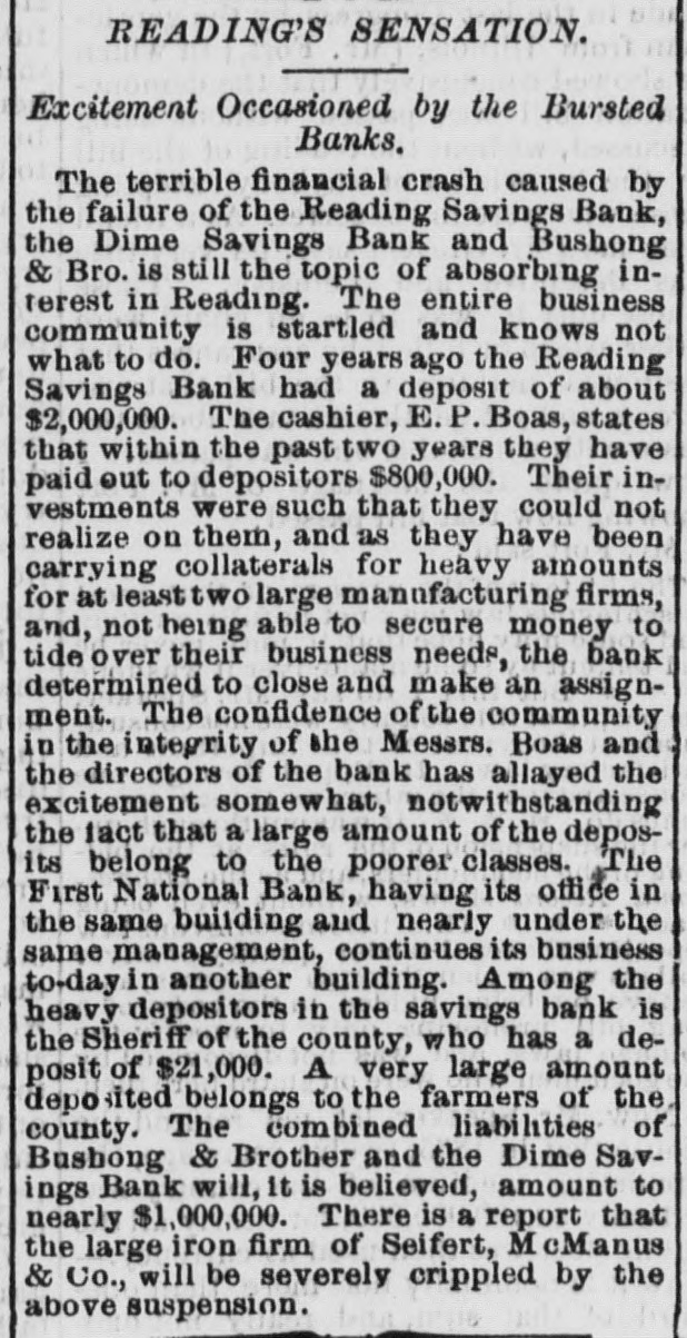 READING'S SENSATION. Excitement Occasioned by the Bursted Banks. The terrible financial crash caused by the failure of the Reading Savings Bank, the Dime Savings Bank and Bushong & Bro. is still the topic of absorbing interest in Reading. The entire business community is startled and knows not what to do. Four years ago the Reading Savings Bank had a deposit of about $2,000,000. The cashier, E. P. Boas, states that within the past two years they have paid out to depositors $800,000. Their investments were such that they could not realize on them, and as they have been carrying collaterals for heavy amounts for at leasttw large manufacturing firms, and, not being able to secure money to tide over their business needs, the bank determined to close and make an assignment. The confidence of the community in the integrity of she Messrs. Boas and the directors of the bank has allayed the excitement somewhat, notwithstanding the fact that a large amount of the deposits belong to the poorer classes. The First National Bank, having its office in the same building and nearly under the same management, continues its business to-day in another building. Among the heavy depositors in the savings bank is the Sheriff of the county, who has a deposit of $21,000. A very large amount deposited belongs to the farmers of the county. The combined liabilities of Bushong & Brother and the Dime Savings Bank will, it is believed, amount to nearly $1,000,000. There is a report that the large iron firm of Seifert, M cManus & Co., will be severely crippled by the above suspension.