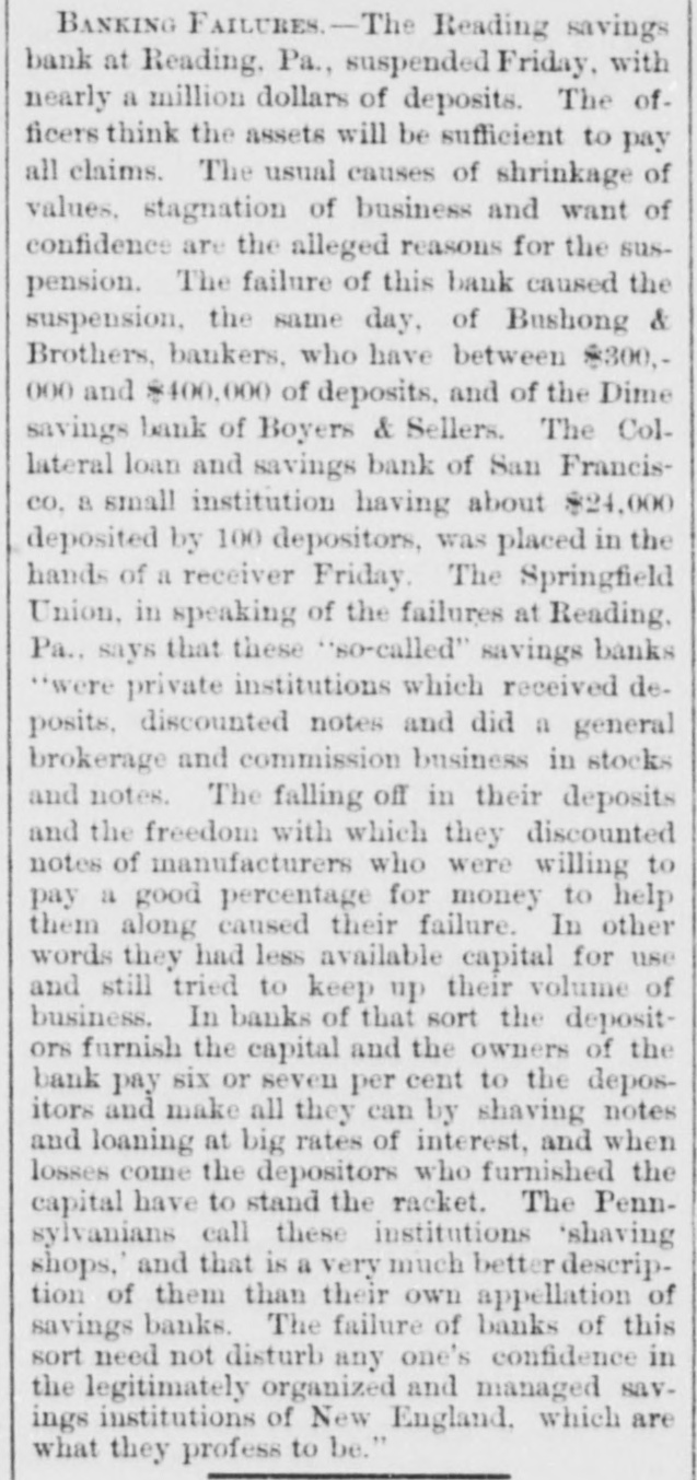 BANKING FAILURES.-The Reading savings bank at Reading, Pa., suspended Friday, with nearly a million dollars of deposits. The officers think the assets will be sufficient to pay all claims. The usual causes of shrinkage of values, stagnation of business and want of confidence are the alleged reasons for the suspension. The failure of this bank caused the suspension, the same day, of Bushong & Brothers, bankers, who have between $300,000 and $400,000 of deposits, and of the Dime savings bank of Boyers & Sellers. The Collateral loan and savings bank of San Francisco, a small institution having about $24,000 deposited by 100 depositors, was placed in the hands of a receiver Friday. The Springfield Union, in speaking of the failures at Reading. Pa., says that these "so-called" savings banks "were private institutions which received deposits, discounted notes and did a general brokerage and commission business in stocks and notes. The falling off in their deposits and the freedom with which they discounted notes of manufacturers who were willing to pay 21. good percentage for money to help them along caused their failure. In other words they had less available capital for use and still tried to keep up their volume of business. In banks of that sort the depositors furnish the capital and the owners of the bank pay six or seven per cent to the depositors and make all they can by shaving notes and loaning at big rates of interest, and when losses come the depositors who furnished the capital have to stand the racket. The Pennsylvanians call these institutions 'shaving shops,' and that is a very much better description of them than their own appellation of savings banks. The failure of banks of this sort need not disturb any one's confidence in the legitimately organized and managed savings institutions of New England, which are what they profess to be."