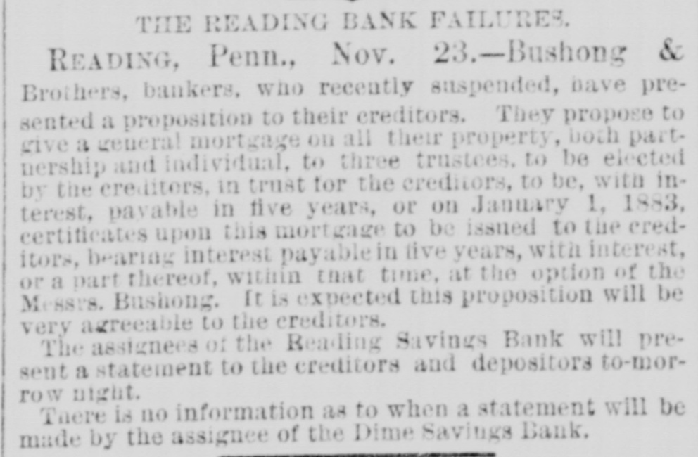 THE READING BANK FAILURES. READING, Penn., Nov. 23.-Bushong & Brothers, bankers. who recently suspended, have presented a proposition to their creditors. They propose to give a general mortgage on all their property, both partnership and individual, to three trustees. to be elected by the creditors, in trust for the creditors, to be, with interest, payable in five years, or on January 1, 1883, certificates upon this mortgage to be issued to the ereditors, bearing interest payable in live years, with interest, or a part thereof, within that time, at the option of the Messys. Bushong. It is expected this proposition will be very agreeable to the creditors. The assignees of the Reading Savings Bank will present a statement to the creditors and depositors to-morrow night. There is no information as to when a statement will be made by the assignee of the Dime Savings Bank.