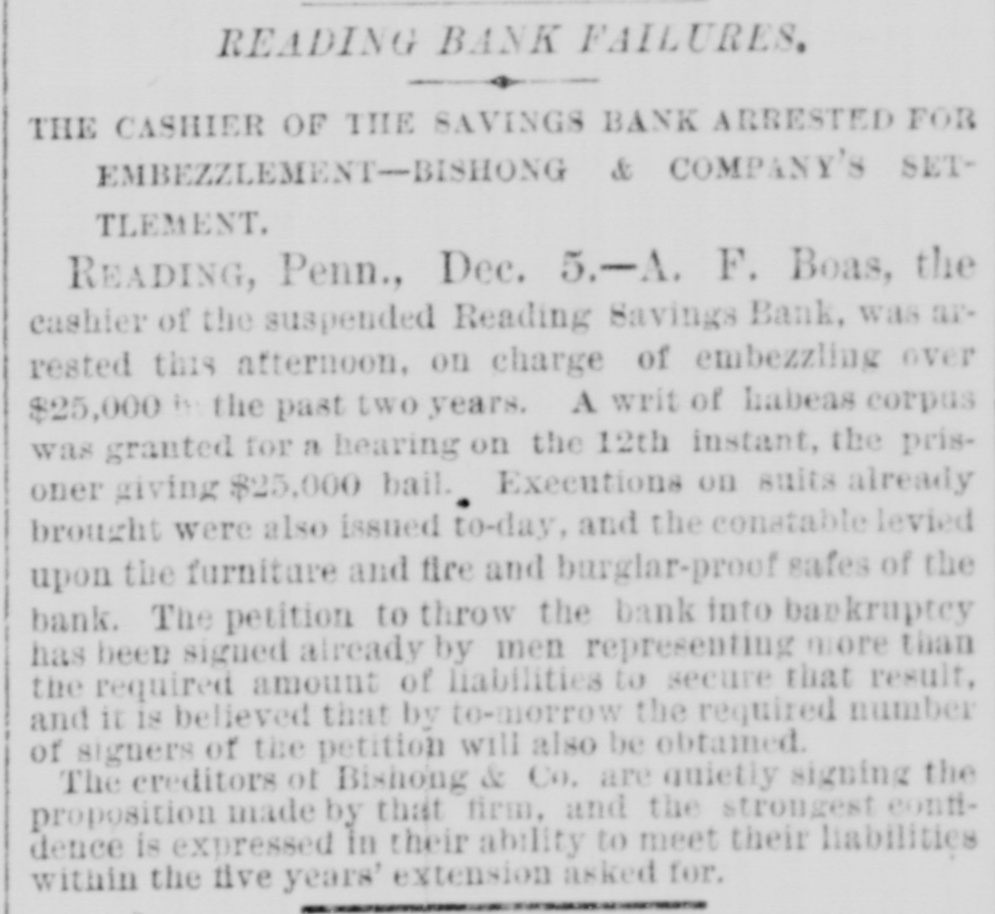 READING BANK FAILURES. THE CASHIER OF THE SAVINGS BANK ARRESTED FOR EMBEZZLEMENT-BISHONG & COMPANY'S SETTLEMENT. READING, Penn., Dec. 5.-A. F. Boas, the cashier of the suspended Reading Savings Bank, was arrested this afternoon, on charge of embezzling over $25,000 In the past two years. A writ of habeas corpus was granted for a hearing on the 12th instant, the prisoner giving $25,000 bail. Executions on suits already brought were also issued to-day, and the constable levied upon the furniture and fire and burglar-proof safes of the bank. The petition to throw the bank into bankruptcy has been signed already by men representing more than the required amount of liabilities to secure that result, and it is believed that by to-morrow the required number of signers of the petition will also be obtained. The creditors of Bishong & Co. are quietly signing the proposition made by that firm, and the strongest contidence is expressed in their ability to meet their liabilities within the five years' extension asked for.