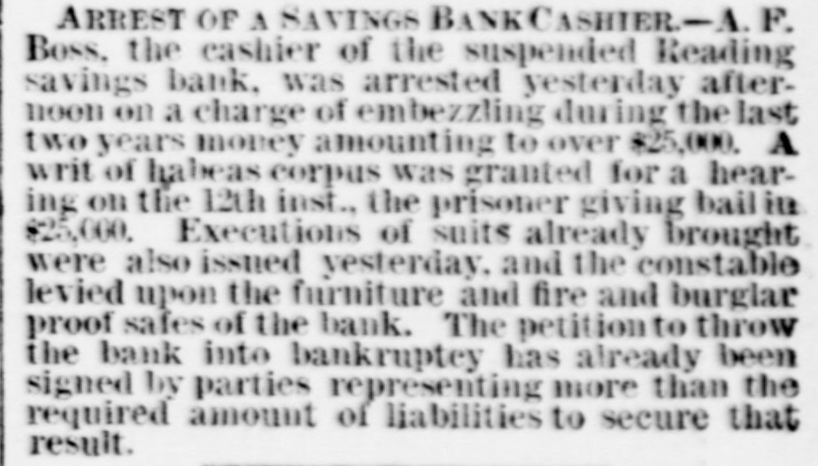 ARREST OF A SAVINGS BANK CASHIER-A F. Boss, the cashier of the suspended Reading savings bank. was arrested yesterday afternoon on a charge of embezzling during the last two years money amounting to over $25,000. A writ of habeas corpus was granted for a hearing on the 12th inst., the prisoner giving bail in $25,000. Executions of suits already brought were also issued yesterday, and the constable levied upon the furniture and fire and burglar proof safes of the bank. The petition to throw the bank into bankruptey has already been signed by parties representing more than the required amount of liabilities to secure that result.