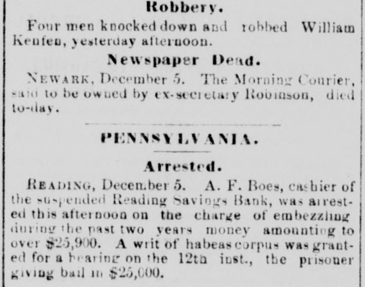 Robbery. Four men knocked down and robbed William Kenfen, yesterday afternoon. Newspaper Dead. NEWARK, December 5. The Morning Courier, said to be owned by ex-secretary Robinson, died to-day. PENNSYLVANIA. Arrested. READING, December 5. A.F. Boes, cashier of the suspended Reading Savings Bank, was airested this afternoon on the charge of embezzling during the past two years money amounting to over $25,900. A writ of habeas corpus was granted for a bearing on the 12th inst., the prisoner giving bail ID $25,000.