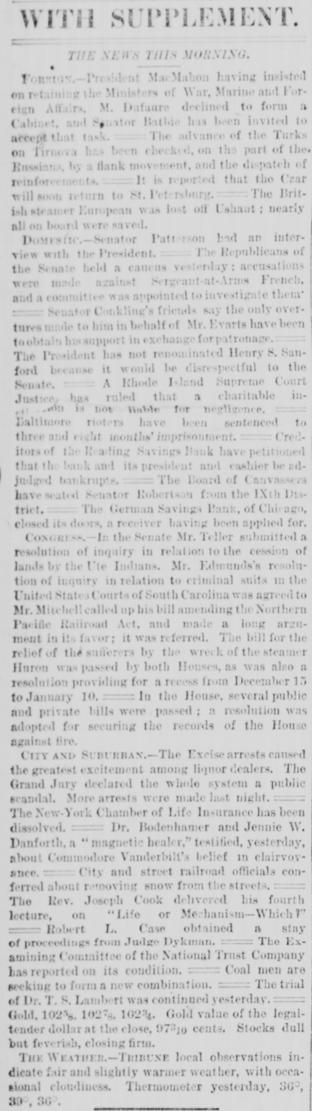 WITH SUPPLEMENT. THE NEWS THIS MORNING. Formign.-President MacMahon having insisted on retaining the Ministers of War, Marine and Foreign Affairs, M. Dufaure declined to form a Cabinet, and Senator Batbie has been invited to accept that task. The advance of the Turks on Tirnova has been checked, on the part of the. Russians, by a flank movement, and the dispatch of reinforcements. It is reported that the Czar will soon return to St. Petersburg. The British steamer European was lost off Ushant nearly all on board were saved. Domesfic.-Senator Patterson had an interview with the President. = The Republicans of the Senate held a caucus yesterday accusations were made against Sergeant-at-Arms French, and a committee was appointed to investigate them' Senator Conkling's friends say the only overtures made to him in behalf of Mr. Evarts have been toobtain his support in exchange for patronage. The President has not renominated Henry S. Sanford because it would be disrespectful to the Senate. ========================= A Rhode Island Supreme Court Justice has ruled that a charitable inof on is not liable for negligence. Baltimore rioters have been sentenced to three and eight months' imprisonment. Creditors of the Reading Savings Bank have petitioned that the bank and its president and cashier be adjudged bankrupts. The Board of Canvassers have seated Senator Robertson from the IXth District. The German Savings Bank, of Chicago, closed its doors, a receiver having been applied for. CONGRESS.-In the Senate Mr. Teller submitted a resolution of inquiry in relation to the cession of lands by the Ute Indians. Mr. Edmunds's resolution of inquiry in relation to criminal suits in the United States Courts of South Carolina was agreed to Mr. Mitchell called up his bill amending the Northern Pacific Railroad Act, and made a long argument in its favor; it was referred. The bill for the relief of the sufferers by the wreck of the steamer Huron was passed by both Houses, as was also a resolution providing for a recess from December 15 to January 10. In the House, several public and private bills were passed ; a resolution was adopted for securing the records of the House against fire. CITY AND SUBURBAN.-The Excise arrests caused the greatést excitement among liquor dealers. The Grand Jury declared the whole system a public seandal. More arrests were made last night. The New-York Chamber of Life Insurance has been dissolved. Dr. Bodenhamer and Jennie W. Danforth, a magnetic healer," testified, yesterday, about Commodore Vanderbilt's belief in clairvoyance. City and street railroad officials conferred about removing snow from the streets. The Rev. Joseph Cook delivered his fourth lecture, on "Life or Mechanism-Which ?" Robert L. Case obtained a stay of proceedings from Judge Dykman. The Examining Committee of the National Trust Company has reported on its condition. Coal men are seeking to form a new combination. The trial of Dr. T. S. Lambert was continued yesterday. Gold, 1023, 1027s, 1023. Gold value of the legaltender dollar at the close, 97³₁₀ cents. Stocks dull but feverish, closing firm. THE WEATHER.-TRIBUNE local observations indicate fair and slightly warmer weather, with occasional cloudiness. Thermometer yesterday, 36°, 39°, 36°.