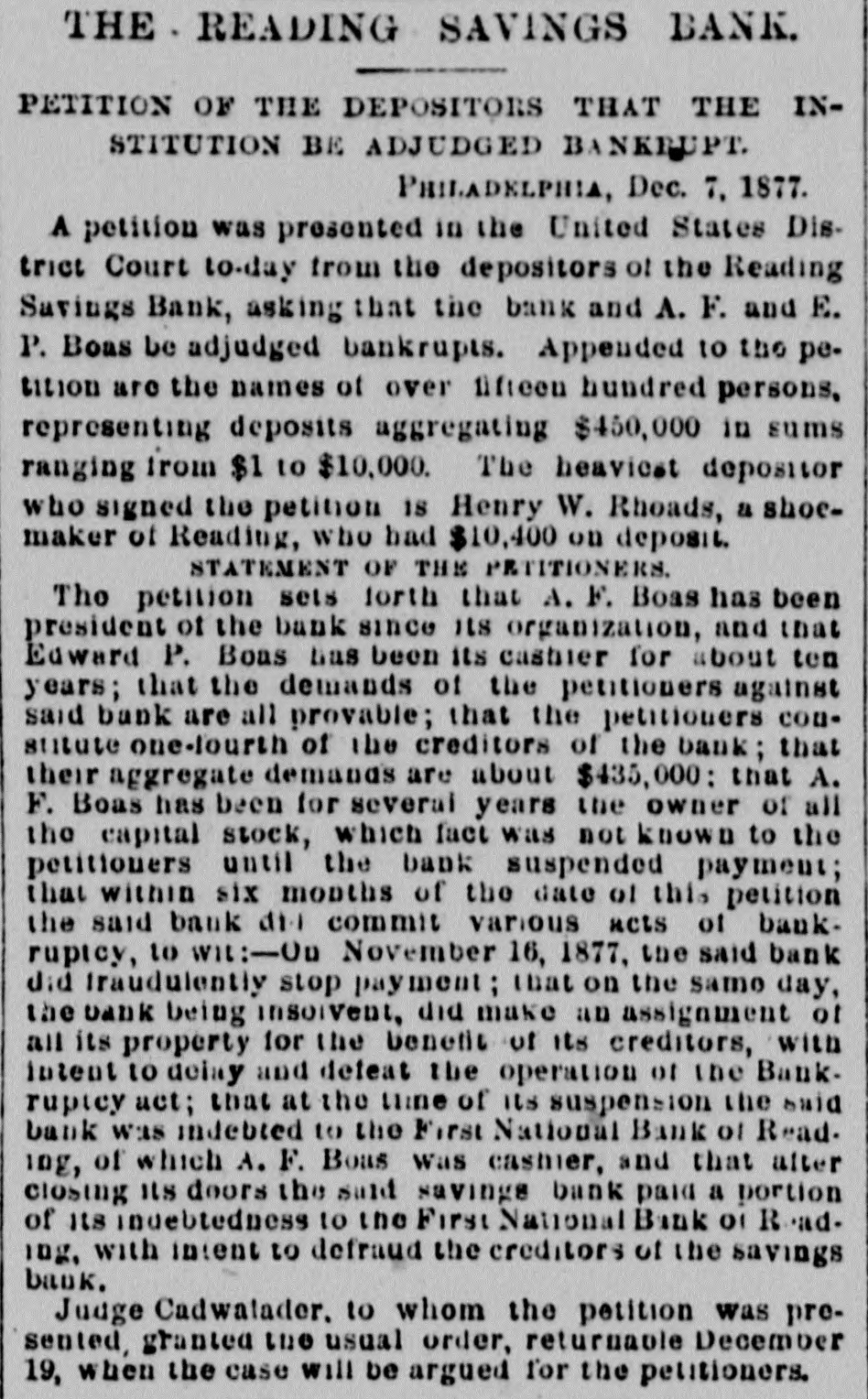 THE READING SAVINGS BANK. PETITION OF THE DEPOSITORS THAT THE INSTITUTION BE ADJUDGED BANKRUPT. PHILADELPHIA, Dec. 7. 1877. A petition was presented in the United States Dis. trict Court today from the depositors of the Reading Savings Bank, asking that the bank and A. F. and E. P. Boas be adjudged bankrupts. Appended to the petition are the names of over dfeen hundred persons, representing deposits aggregating $450,000 in sums ranging from $1 to $10,000. The heaviest depositor who signed the petition is Henry W. Rhoads, a shoemaker of Reading, who had $10,400 on deposit. STATEMENT OF THE PETITIONERS. The petition sets forth that A. F. Boas has been president of the bank since its organization, and that Edward P. Boas has been its cashier for about ten years; that the demands of the petitioners against said bank are all provable; that the petitiouers constitute one-fourth of the creditors of the bank; that their aggregate demands are about $435,000: that A. F. Boas has been for several years the owner of all the capital stock, which fact was not known to the petitiouers until the bank suspended payment; that within six months of the date of this petition the said bank di-i commit various nets of bank. rupicy, to WIL:-Ou November 16, 1877, the said bank did fraudulently stop payment; that on the same day, the bank being insolvent, did make an assignment of all its property for the benefit of its creditors, with intent to delay and deteat the operation of the Bank. ruptcy act; that at the une of its suspension the said bank was indebted to the First National Bank of Read. 10g, of which A. F. Boas was cashier, and that after closing its doors the said savings bank paid a portion of its indebtedness to the First National Bank or ead. 10g, with intent to defraud the creditors of the savings bank. Judge Cadwalader. to whom the petition was presented, granted the usual order, returnable December 19, when the case will be argued for the petitioners.