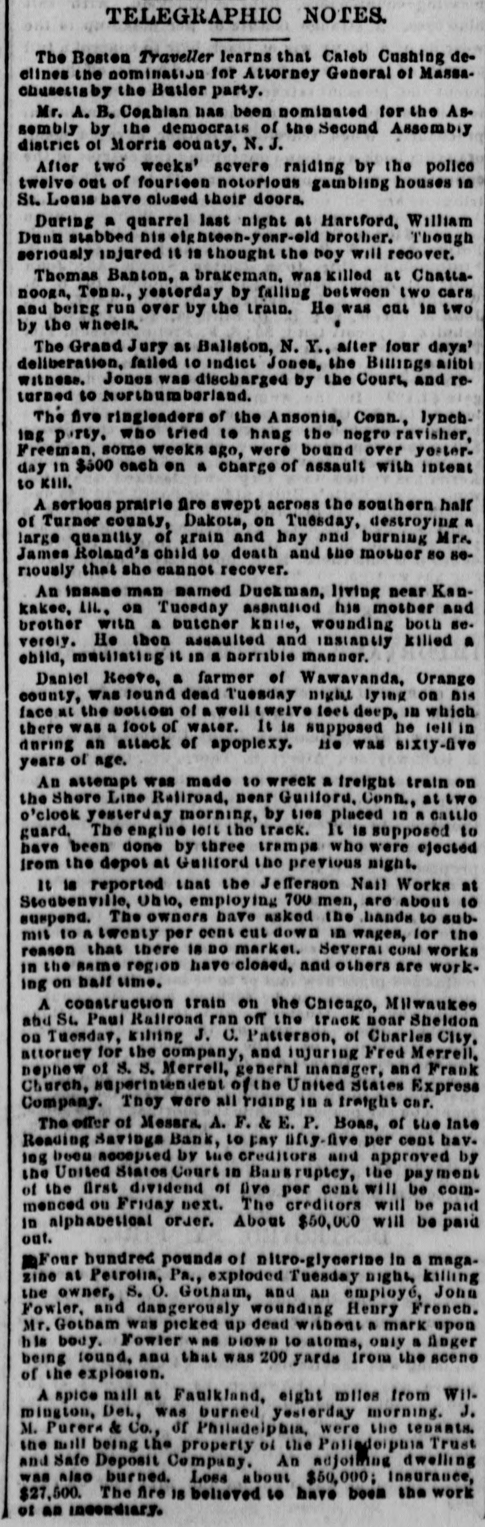 TELEGRAPHIC NOTES. The Boston Traveller learns that Caleb Cushing deelines the nomination for Attorney General of Massa. chusestaby the Busler party. Mr. A. B. Coghian has been nominated for the Assembly by the democrats of the Second Assembly district of Morris county. N. J. After two weeks' severe raiding by the police twelve out of fourieen notorious gambling houses in St. Louis have closed their doors. During a quarrel last night at Hartford, William Dunn stabbed his eighteen-yenr-old brother. Though seriously injured 18 18 thought the boy will recover. Thomas Banton, a brakeman. was killed at Chattanooga, Tenn, yesterday by falling between two cars and being run over by the train. He was cut in two by the wheels. The Grand Jury as Ballston, N. Y., after four days' deliberation, failed 10 indict Jones, the Billings alibi witness. Jones was discbarged by the Courh and returned to Nortbumberiand. The five ringleaders of the Ansonia, Coon, lynch. ing pirty. who tried to hang the negro ravisher, Freeman, some weeks ago, were bound over yorter. day in $500 each on a charge of assault with intent to Kill. A serious prairie are swept across the southern half of Turnor county, Dakota, on Tuesday, destroying a large quantity of urain and hay and burning Mrs. James Roland's child to death and the mother so seriously that she cannot recover. An insane man named Duckman, living near Kankakee, III. on Tuesday assumited his mother and brother with a butcher knile, wounding both se. verely. He then assaulted and instantly killed a child, macliating 16 in a norrible manner. Daniel Reeve, a farmer of Wawavanda, Orange county, was tound dead Tuesday night lying on his face ac the wollow of a well twelve feet deep. in which there was a foot of water. It is supposed he tell in during an allack of apoplexy. He was sixty-live years of age. An accempt was made to wreck a freight train on the Shore Line Retiroad, near Guilford. Conn., at two o'clock yesterday morning, by ties placed 10 a cattle guard, The engine leit the track. It is supposed to have been done by three tramps who were ejected from the depot at Gulltord the previous night. It is reported that the Jefferson Nail Works at Steabenville, Ohio, employing 700 men, are about 10 suspend. The owners have asked the hands to submit to a twenty per cent cut down in wages, for the reason that there 18 no market. Several coal works in the same region have closed. and others are work. ing on half sime. A construction train on she Chicago, Milwaukee and St. Paul Railroad ran off the track near Sheldon on Tuesday, killing J. C. Patterson, of Cbarles City. attorney for the company, and injuring Fred Merrell. nephew of 8. S. Merrell, general manager, and Frank Church, superintendent of the United States Express Company. They were all riding in a treight car. The offer of Messra. A. F. & E. P. Boas, of the late Reading Savings Bank, to pay Untry-live per cent hav. leg been accepted by we creditors and approved by the United States Court in Bankruptcy, the payment of the first dividend of live per cent will be commenced ou Friday next. The creditors will be paid in alphabetical order. About $50,000 will be paid out. Four hundred pounds of nitro-glycerine In a magazine at Petrolla, Pa., exploded Tuesday night killing the owner, S. O. Gotham, and an employé, John Fowler, and dangerously wounding Henry French. Mr. Gotham was picked up dead WILDOUS a mark upon his body. Fowler was blown to atoms, only a Anger being found. and that was 200 yards from the scene of the explosion. A spice mill at Faulkland, eight miles from Wilmington, Del, was burned yesterday morning. J. M. Purera & Co., of Philadelphia, were the tenants. the mill being the property of the Poliedeiphia Trust and Safe Deposit Company. An adjoiming dwelling was also burned. Loss about $50,000; Insurance, $27,500. The Are is believed to have been the work of an incondiary.