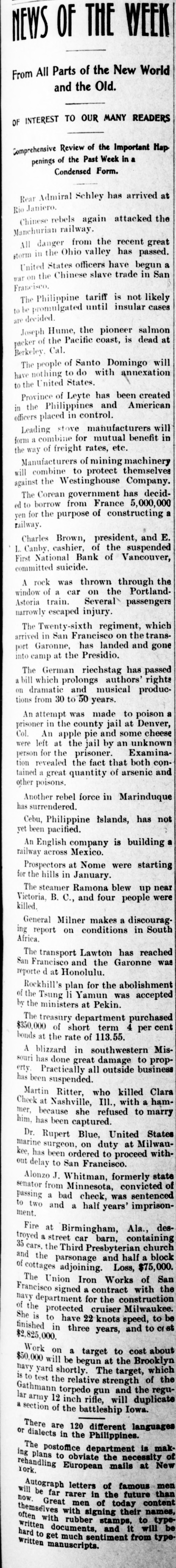 NEWS OF THE WEEK From All Parts of the New World and the Old. OF INTEREST TO OUR MANY READERS Comprehensive Review of the Important Hap penings of the Past Week in a Condensed Form. Rear Admiral Schley has arrived at Rio Janiero. Chinese rebels again attacked the Manchurian railway. All danger from the recent great storm in the Ohio valley has passed. United States officers have begun a war on the Chinese slave trade in San Francisco The Philippine tariff is not likely to be promulgated until insular cases are decided Joseph Hume, the pioneer salmon packer of the Pacific coast, is dead at Berkeley, Cal. The people of Santo Domingo will have nothing to do with annexation to the United States. Province of Leyte has been created in the Philippines and American officers placed in control. Leading stove manufacturers will form combine for mutual benefit in the way of freight rates, etc. Manufacturers of mining machinery will combine to protect themselves against the Westinghouse Company. The Corean government has decided to borrow from France 5,000,000 yen for the purpose of constructing railway. Charles Brown, president, and E. I. Canby, cashier, of the suspended First National Bank of Vancouver, committed suicide. A rock was thrown through the window of a car on the PortlandAstoria train. Several passengers narrowly escaped injury. The Twenty-sixth regiment, which arrived in San Francisco on the transport Garonne, has landed and gone into camp at the Presidio. The German riechstag has passed a bill which prolongs authors' rights on dramatic and musical productions from 30 to 50 years. An attempt was made to poison a prisoner in the county jail at Denver, Col. An apple pie and some cheese were left at the jail by an unknown person for the prisoner. Examination revealed the fact that both contained great quantity of arsenic and other poisons, Another rebel force in Marinduque has surrendered, Cebu, Philippine Islands, has not yet been pacified. An English company is building railway across Mexico. Prospectors at Nome were starting for the hills in January. The steamer Ramona blew up near Victoria, B. C., and four people were killed. General Milner makes a discouraging report on conditions in South Africa, The transport Lawton has reached San Francisco and the Garonne was reporte at Honolulu. Rockhill's plan for the abolishment of the Tsung li Yamun was accepted by the ministers at Pekin. The treasury department purchased $350,000 of short term 4 per cent bonds at the rate of 113.55. A blizzard in southwestern Missouri has done great damage to property. Practically all outside business has been suspended. Ritter, who killed Clara at Ill., with a mer, Cheek Martin because Nashville, hamshe refused to marry him, has been captured. Dr. Rupert Blue, United States marine surgeon, on duty at Milwaukee. has been ordered to proceed without delay to San Francisco. Alonzo J. Whitman, formerly state a bad was passing senator to two from Minnesota, check, convicted sentenced of and a half years' imprisonment. Fire at Birmingham, Ala., destroyed street car barn, containing the Third and half a of 35 and cottages cars the parsonage adjoining. Presbyterian Loss, $75,000. church block Iron signed a contract with navy Francisco The department Union Works of San the for the construction protected Milwaukee. to have 22 knots to in three and to cr st of finished She the is cruiser years, speed, be $2,825,000. Work on a target to cost about $50,000 will be at the shortly. The relative of the navy Gathmann is lar army test yard the 12 torpedo begun gun strength and target, Brooklyn which regu- the inch rifle, will duplicate section of the battleship Iowa. or There are 120 different languages in the postoffice is to obviate the of ing The dialects plans department Philippines. necessity mak rehandling York, European mails at New Autograph letters of famous men rarer in the than men of with their names, now. will often with themselves be Great far signing today future content written rubber stamps, to type documents, and it will be much sentiment hard written to get from type manuscripts.