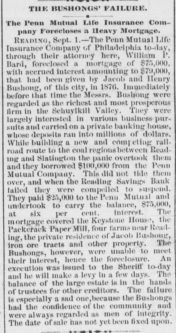 THE BUSHONGS' FAILURE. The Penn Mutual Life Insurance Company Forecloses a Heavy Mortgage. READING, Sept. 1.-The Penn Mutual Life Insurance Company of Philadelphia to-day, through their attorney here, William P. Bard, foreclosed a mortgage of $75,000, with accrued interest amounting to $79,000, that had been given by Jacob and Henry Bushong, of this city, in 1876. Immediately before that time the Messrs. Bushong were regarded as the richest and most prosperous firm in the Schuylkill Valley. They were largely interested in various business pursuits and carried on a private banking house, whose deposits ran into millions of dollars. While building a new and competing railroad route to the coal regions between Reading and Slatington the panic overtook them and they borrowed $100,000 from the Penn Mutual Company. This did not tide them over, and when the Reading Savings Bank failed they were compelled to suspend. They paid $25,000 to the Penn Mutual and undertook to carry the balance, $75,000, at six per cent. interest. The mortgage covered the Keystone House, the Packcrack Paper Mill, four farms near Reading, the private residence of Jacob Bushong, iron ore tracts and other property. The Bushongs, however, were unable to meet their interest, hence the foreclosure. An execution was issued to the Sheriff to-day and he will make a levy in a few days. The balance of the large estate is in the hands of trustees for other creditors. The failure is especially a sad one, because the Bushongs had the confidence of the community and were always regarded as men of integrity. The date of sale has not yet been fixed upon.
