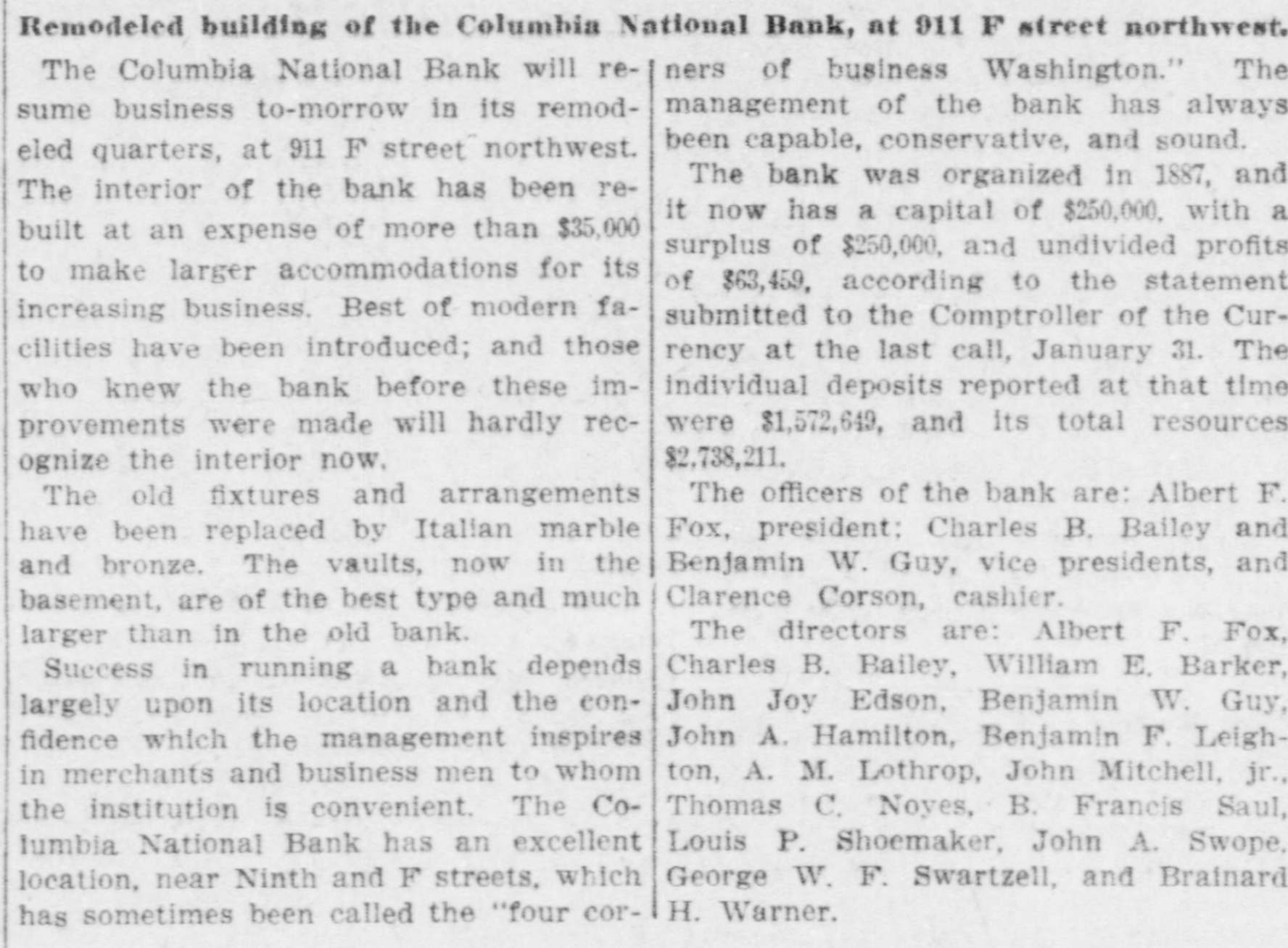 Remodeled building of the Columbia National Bank, at 911 F street northwest. The Columbia National Bank will reners of business Washington." The management of the bank has always sume business to-morrow in its remodbeen capable, conservative, and sound. eled quarters, at 911 F street northwest. The bank was organized in 1887, and The interior of the bank has been reit now has a capital of $250,000. with a built at an expense of more than $35,000 surplus of $250,000, and undivided profits to make larger accommodations for its of $63,459, according to the statement increasing business. Best of modern fasubmitted to the Comptroller of the Curcilities have been introduced; and those rency at the last call, January 31. The who knew the bank before these imindividual deposits reported at that time were $1,572,649, and its total resources provements were made will hardly rec$2,738,211. ognize the interior now. The officers of the bank are: Albert F. The old fixtures and arrangements Fox, president: Charles B. Bailey and have been replaced by Italian marble and bronze. The vaults, now in the Benjamin W. Guy, vice presidents, and Clarence Corson, cashier. basement, are of the best type and much The directors are: Albert F. Fox, larger than in the old bank. Charles B. Bailey, William E. Barker, Success in running a bank depends John Joy Edson, Benjamin W. Guy, largely upon its location and the conJohn A. Hamilton, Benjamin F. Leighfidence which the management inspires in merchants and business men to whom ton, A. M. Lothrop, John Mitchell, jr., the institution is convenient. The CoThomas C. Noyes, B. Francis Saul, lumbia National Bank has an excellent Louis P. Shoemaker, John A. Swope, George W. F. Swartzell, and Brainard location, near Ninth and F streets, which H. Warner. has sometimes been called the "four cor-