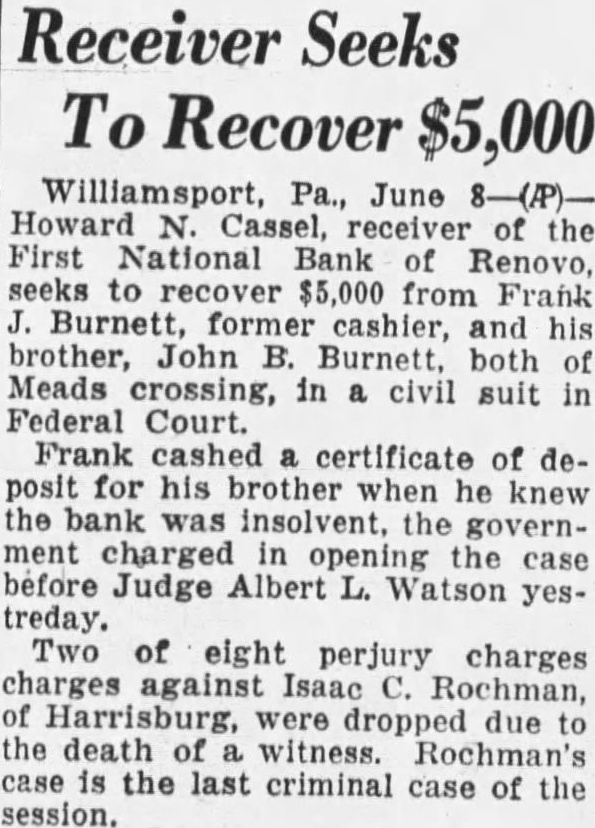 Receiver Seeks To Recover $5,000 Williamsport, Pa., June 8-(/P)Howard N. Cassel, receiver of the First National Bank of Renovo, seeks to recover $5,000 from Frank J. Burnett, former cashier, and his brother, John B. Burnett. both of Meads crossing, in a civil suit in Federal Court. Frank cashed certificate of deposit for his brother when he knew the bank was insolvent, the government charged in opening the case before Judge Albert L. Watson yestreday. Two of eight perjury charges charges against Isaac Rochman, of Harrisburg, were dropped due to the death of witness. Rochman's case is the last criminal case of the session.