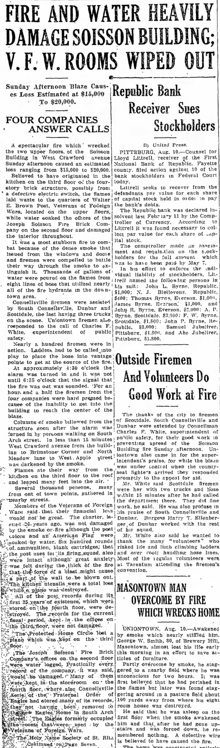HEAVILY FIRE AND WATER BUILDING; ROOMS WIPED OUT Sunday Afternoon Blaze Causes Loss Estimated at $15,000 $20,000. FOUR COMPANIES ANSWER CALLS spectacular fire which wrecked United upper floors. the Soisson Aug. for Building in West Crawford avenue Lloyd Littrell, receiver of the First Sunday afternoon caused an estimated National Bank of Republic. Fayette ranging from $15,000 to $20,000. county. filed action against 10 of the Believed have originated in the bank stockholders in Federal Court kitchen the third floor the four- today. story brick structure. possibly from Littrell seeks to recover from the defective electric switch, the flames defendants par value for each share laid waste to the quarters of Walter capital stock held in order pay the bank's debts. Brown Post, of Fodeign The Republic bank was declared inWare, located on the upper floors. solvent last by the Compwhile water soaked the offices of the troller of Currency. According Joseph Soisson Fire Brick ComLittrell was found necessary colpany the second floor and damaged par value for each share of the throughout. ital stock. was most fire to comThe comptroller made bat the dense smoke that ment and on the issued from the windows and doore holders for the full amount which and were compelled battle been paid by May their way through the smoke to In his effort enforce the tinguish it. Thousands of gallons of vidual liability stockholders, water were poured on the flames from named the persons eight lines of hose that utilized nearly suit: John Byrne. Republic. all of the fire hydrants in the downtown $400: Thomas Byrne. Everson. Connellsville firemen were assisted James Byrne. $1,000. and by South Connellsville. Dunbar and John Scottdale, the last having three trucks on the scene. Uniontown firemen Scottdale. $1,800: John Byrne. responded the call of Charles public. $3,000: Samuel Jubelirer. superintendent of public and Abe safety. Nearly hundred firemen were in action. Ladders to be called play to place the hose into vantage Outside Firemen points get the of the fire. At o'clock the turned and was not And Volunteers Do until 6:35 o'clock that the signal that the fire out was sounded. For hour half the firemen from the Good Work at Fire four companies were hard pressed cause the inability get into the building to reach the center of the The thanks of the city to firemen blaze. Scottdale. South and Columns of smoke billowed from the Dunbar by structure soon after the alarm Charles White, by walking South persons public for their good work Arch street. In less than 15 minutes of West Crawford avenue from the buildBuilding fire Sunday Unto Brimstone Corner and North lontown also came for the superMeadow lane West Apple street intendent's praise, for while the blaze darkened by the smoke. under control when the countyFlames ate their way from the fighters they responded kitchen the third floor to roof the appeal for leaped many feet into the air. Mr. White Scottdale firemen Several thousand persons, many her with two trucks and hose from out of town points, gathered in within minutes he had the there. They did fine Members of the Veterans of Foreign also Ware said that their financial loss his praise South would not be great. The charter, Dunbar. Ellenberwas not damaged Dunbar worked with the rest sued ago, smoke although the post his by the and American Flag were Mr. White also sald he wanted to by water. Six hundred rounds thank the many who ammunition, blank cartridges; that risked life and limb climbing ladders its and over hose lines. post uses although anxiety Most of the negular were great of the Tarentum attending the firemen's during blast might cause convention. the wall blown out. utensils were total MASONTOWN MAN All the post records during its OVERCOME BY FIRE which were fourth floor, were WRECKS estroyed. records for the current period, kept. offices were not damaged. Aug. Protected Home Circle lost by smoke which nearly stiffled on the third which George Smith, 80, of Brewery Hill, Masontown, almost lost his life early Joseph Fire Brick this morning in an effort to save Company's offices on second floor ticles of furniture. water logged. Practically every Partly overcome by smoke, he stagof the said, gered to nearby field where he was damaged. Many of them for two hours. was the storeroom the first believed that he had perished fourth floor where Connellsville the flames but later was found stagFraternal Order of gering around pasture field about had of its records, 100 yards his eight room house destroyed. having been South Arch He said that he asleep on the first floor when the smoke Eagles formerly occupied by the him and that after he had gone upstairs forced down, Wars. membered nothing. defective Society of St. is believed to have caused the fire. Seven.