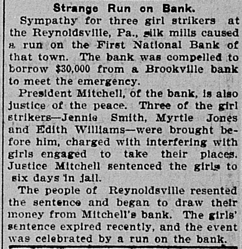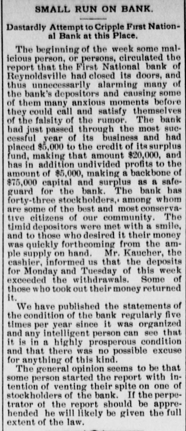 SMALL RUN ON BANK. Dastardly Attempt to Cripple First National Bank at this Place. The beginning of the week some malicious person, or persons, circulated the report that the First National bank of Reynoldsville had closed its doors, and thus unnecessarily alarming many of the bank's depositors and causing some of them many anxious moments before they could call and satisfy themselves of the falsity of the rumor. The bank had just passed through the most successful year of its business and had placed $5,000 to the credit of its surplus fund, making that amount $20,000, and has in addition undivided profits to the amount of $5,000, making a backbone of $75,000 capital and surplus as a safeguard for the bank. The bank has forty-three stockholders, among whom are some of the best and most conservative citizens of our community. The timid depositors were met with a smile, and to those who desired it their money was quickly forthcoming from the ample supply on hand. Mr. Kaucher, the cashier, informed us that the deposits for Monday and Tuesday of this week exceeded the withdrawals. Some of those who took out their money returned it. We have published the statements of the condition of the bank regularly five times per year since it was organized and any intelligent person can see that it is in a highly prosperous condition and that there was no possible excuse for anything of this kind. The general opinion seems to be that some person started the report with intention of venting their spite on one of stockholders of the bank. If the perpetrator of the report should be apprehended he will likely be given the full extent of the law.