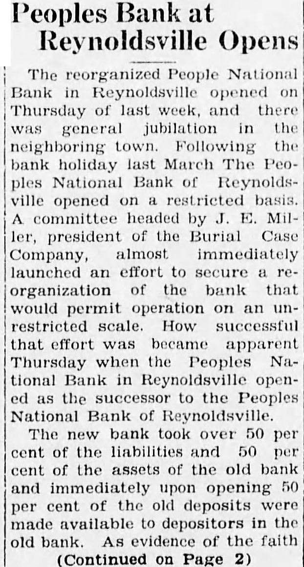 Peoples Bank at Opens The reorganized People Bank in Reynoldsville opened Thursday of last week, and there general jubilation in the neighboring town. Following the bank holiday last March The ples National Bank of Reynoldsopened restricted basis. committee headed by E. president of the Burial Case Company, almost immediately launched effort to secure organization of the bank that would permit operation an restricted scale. How successful that effort was became apparent Thursday when the Peoples National Bank in Reynoldsville opensuccessor to the Peoples National Bank of Reynoldsville. The bank took over 50 per cent the liabilities and 50 cent of the assets of the old bank and immediately upon opening cent of the old deposits made available depositors in the bank. As evidence of the faith (Continued on Page