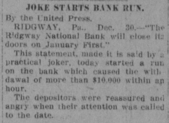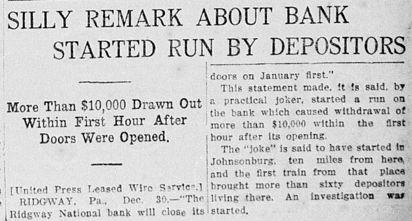 SILLY REMARK ABOUT BANK STARTED RUN BY DEPOSITORS doors on January first." This statement made, it is said. by a practical joker, started a run on More Than $10,000 Drawn Out the bank which caused withdrawal of Within First Hour After more than $10,000 within the first hour after its opening. Doors Were Opened. The "foke" is said to have started in Johnsonburg, ten miles from here, and the first train from that place brought more than sixty depositors [United Press Leased Wire Service. RIDGWAY, Pa., Dec. 30.-"The living there. An investigation was Ridgway National bank will close its started,