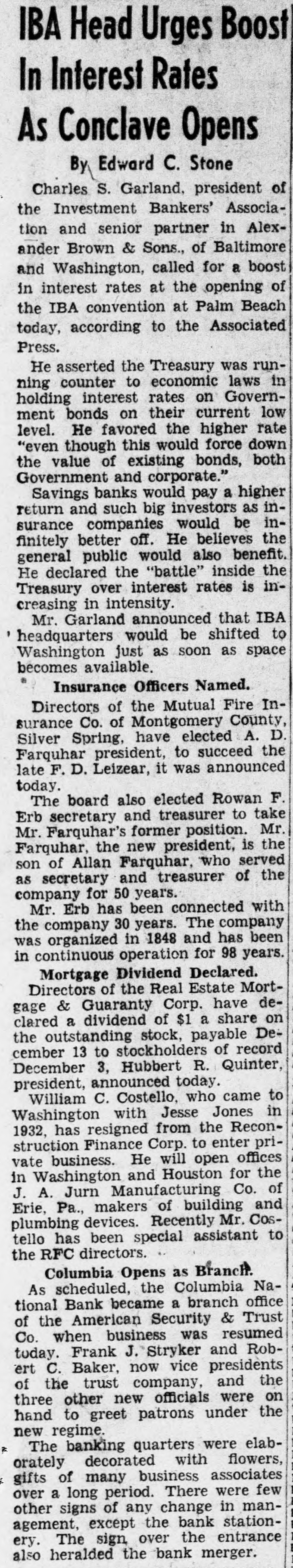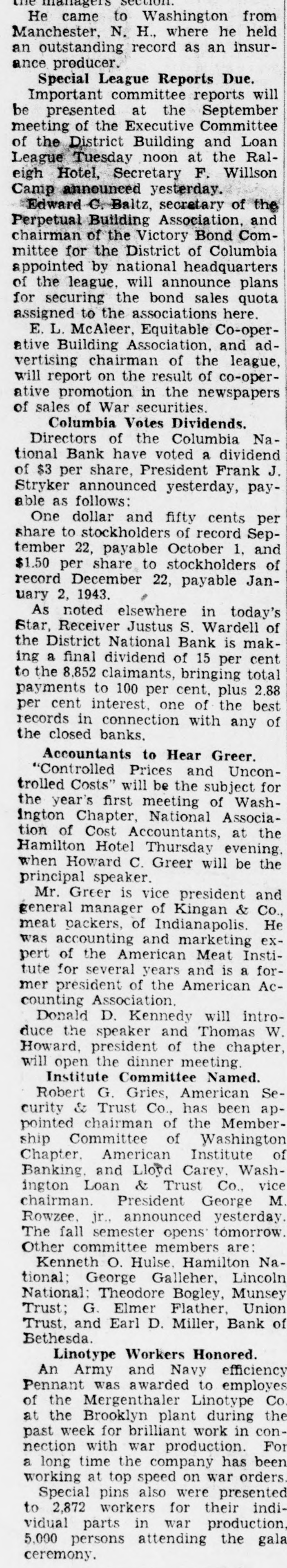 the managers section. He came to Washington from Manchester, N. H., where he held an outstanding record as an insurance producer. Special League Reports Due. Important committee reports will be presented at the September meeting of the Executive Committee of the District Building and Loan Tuesday noon at Secretary announced C. Baltz, League Camp eigh Edward Hotel, yesterday. secretary F. the Willson of Ral- and the Building Association, of the Victory the District of by national Perpetual chairman mittee appointed for headquarters Bond Columbia Comwill announce for the bond to the of assigned the E.L. securing league, McAleer, associations Equitable sales Co-oper- here. quota plans Association, chairman of will on the result ative vertising report Building the newspapers of co-oper- and league, adative promotion in the of sales of War securities. Columbia Votes Dividends. Directors of the Columbia National Bank have voted a dividend of $3 per share, President Frank J. Stryker announced yesterday, payable as follows: One dollar and fifty cents per share to stockholders of record September 22, payable October 1, and $1.50 per share to stockholders of record December 22, payable January 2, 1943. As noted elsewhere in today's Star, Receiver Justus S. Wardell of the District National Bank is making a final dividend of 15 per cent to 8,852 claimants, bringing total to 100 per cent, payments the plus the best 2.88 per cent interest, one of records in connection with any of the closed banks. Accountants to Hear Greer. Prices and Uncon"Controlled Costs" subject trolled will be the for the year's first meeting of Washington Chapter, National Association of Cost Accountants, at the Hamilton Hotel Thursday evening, when Howard C. Greer will be the principal speaker. Mr. Greer is vice president and general manager of Kingan & Co., meat packers, of Indianapolis. He was accounting and marketing expert of the American Meat Institute for several years and is a former president of the American Accounting Association. Donald D. Kennedy will introthe speaker and duce the Thomas chapter, W. Howard, president of will open the dinner meeting. Institute Committee Named. Robert G. Gries, American Security & Trust Co., has been appointed chairman of the Membership Committee of Washington of Chapter. American Institute Banking, and Lloyd Carey, Washington Loan & Trust Co., vice M chairman. President George Rowzee, jr., announced yesterday The fall semester opens tomorrow. Other committee members are: Kenneth O. Hulse, Hamilton National; George Galleher, Lincoln National: Theodore Bogley, Munsey Trust; G. Elmer Flather, Union Trust, and Earl D. Miller, Bank of Bethesda. Linotype Workers Honored. An Army and Navy efficiency Pennant was awarded to employes of the Mergenthaler Linotype Co at the Brooklyn plant during the past week for brilliant work in connection with war production. For a long time the company has been working at top speed on war orders pins also were presented workers for to Special 2,872 their production, individual parts in war 5,000 persons attending the gala ceremony.