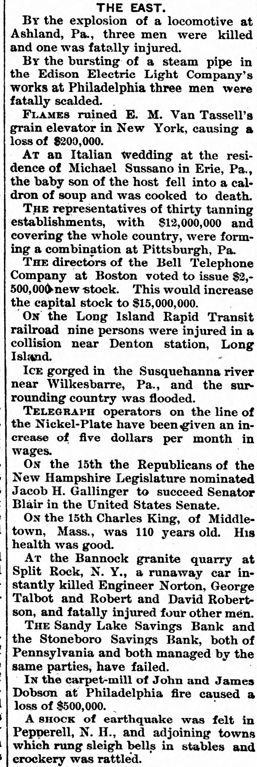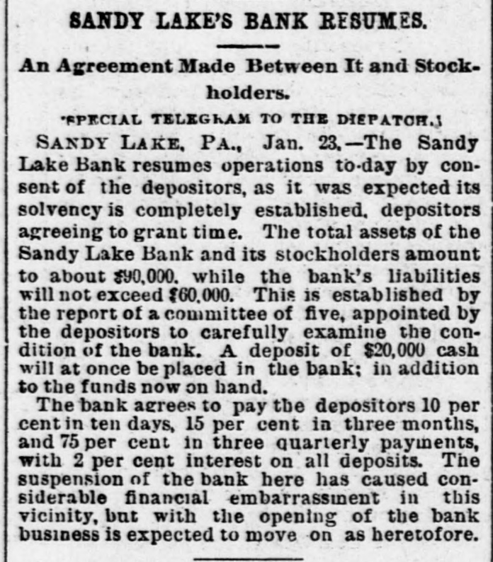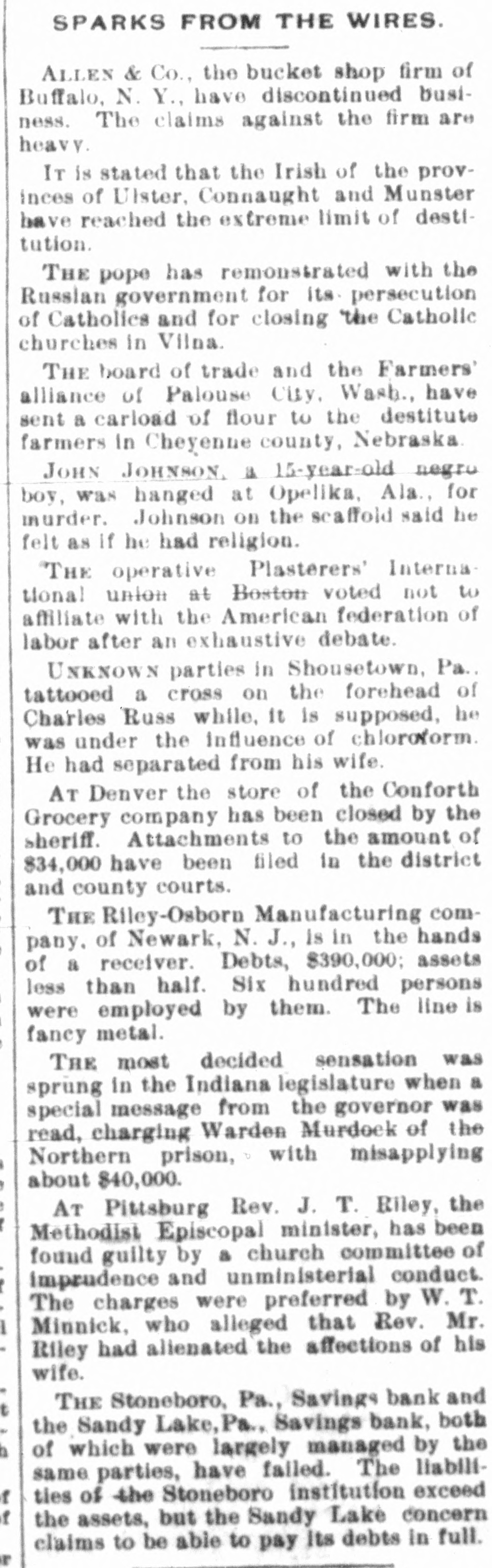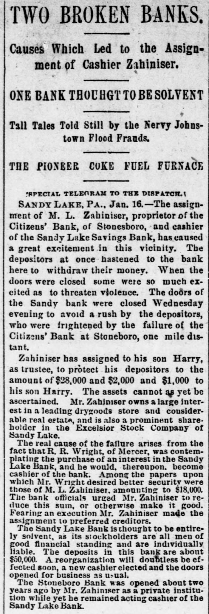 TWO BROKEN BANKS. Causes Which Led to the Assignment of Cashier Zahiniser. ONE BANK THOUHGT TO SOLVENT Tall Tales Told Still by the Nervy Johnstown Flood Frauds. THE PIONEER COKE FUEL FURNACE 'SPECIAL TELEGRAM TO THE DISPATCH.1 SANDY LAKE, PA., Jan. 16.-The assignment of M. L. Zabiniser, proprietor of the Citizens' Bank, of Stonesboro, and cashier of the Sandy Lake Savings Bank, has caused a great excitement in this vicinity. The depositors at once hastened to the bank here to withdraw their money. When the doors were closed some were so much excited as to threaten violence. The doors of the Sandy bank were closed Wednesday evening to avoid a rush by the depositors, who were frightened by the failure of the Citizens' Bank at Stoneboro, one mile distant. Zahiniser has assigned to his son Harry, as trustee, to protect his depositors to the amount of $28,000 and $2,000 and $1,000 to his son Harry. The assets cannot as yet be ascertained. Mr. Zahiniser owns a large interest in a leading drygoods store and considerable real estate, and is also a prominent shareholder in the Excelsior Stock Company of Sandy Lake. The real cause of the failure arises from the fact that R. R. Wright, of Mercer, was contemplating the purchase of an interest in the Sandy Lake Bank, and he would. thereupon. become cashier of the bank. Among the papers upon which Mr. Wright desired better security were those of M. L. Zahiniser. amounting to $18,000. The bank officials urged Mr. Zahiniser to reduce this sum, or otherwise make it good. Fearing an execution Mr. Zahiniser made the assignment to preferred creditors. The Sandy Lake Bank is thought to be entirely solvent, as its stockholders are all men of good financial standing and are individually liable. The deposits in this bank are about $50,000. A reorganization will doubtless be effected soon, a new cashier elected and the doors opened for business as usual. The Stoneboro Bank was opened about two years ago by Mr. Zahiniser as a private institution while yet he remained acting cashier of the Sandy Lake Bank.
