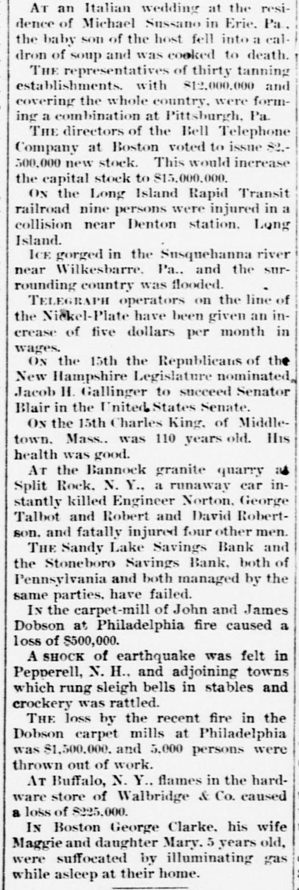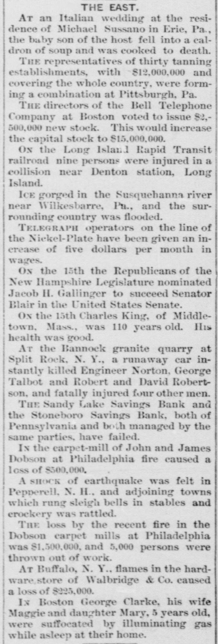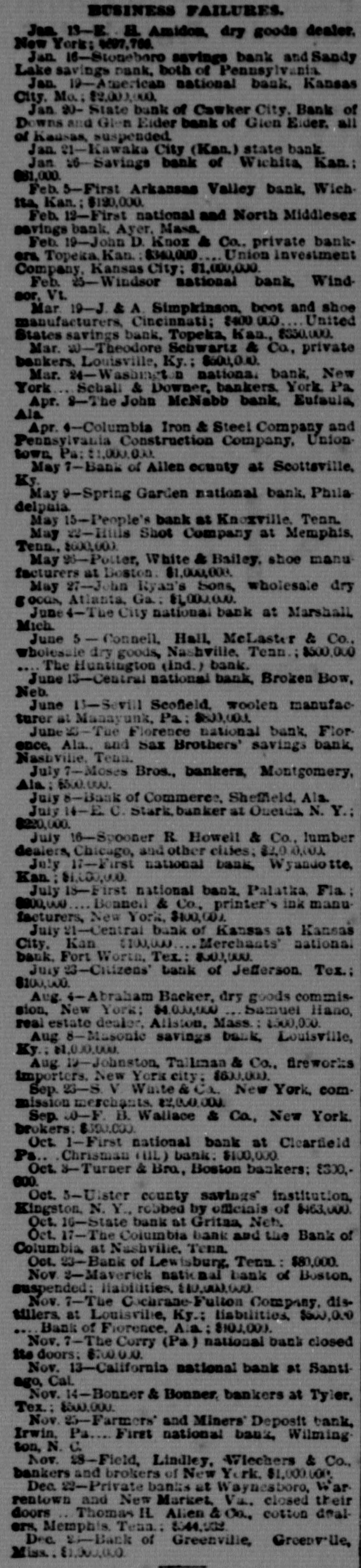 TWO BROKEN BANKS. Causes Which Led to the Assignment of Cashier Zahiniser. ONE BANK THOUHGT TO SOLVENT Tall Tales Told Still by the Nervy Johnstown Flood Frauds. THE PIONEER COKE FUEL FURNACE 'SPECIAL TELEGRAM TO THE DISPATCH.1 SANDY LAKE, PA., Jan. 16.-The assignment of M. L. Zabiniser, proprietor of the Citizens' Bank, of Stonesboro, and cashier of the Sandy Lake Savings Bank, has caused a great excitement in this vicinity. The depositors at once hastened to the bank here to withdraw their money. When the doors were closed some were so much excited as to threaten violence. The doors of the Sandy bank were closed Wednesday evening to avoid a rush by the depositors, who were frightened by the failure of the Citizens' Bank at Stoneboro, one mile distant. Zahiniser has assigned to his son Harry, as trustee, to protect his depositors to the amount of $28,000 and $2,000 and $1,000 to his son Harry. The assets cannot as yet be ascertained. Mr. Zahiniser owns a large interest in a leading drygoods store and considerable real estate, and is also a prominent shareholder in the Excelsior Stock Company of Sandy Lake. The real cause of the failure arises from the fact that R. R. Wright, of Mercer, was contemplating the purchase of an interest in the Sandy Lake Bank, and he would. thereupon. become cashier of the bank. Among the papers upon which Mr. Wright desired better security were those of M. L. Zahiniser. amounting to $18,000. The bank officials urged Mr. Zahiniser to reduce this sum, or otherwise make it good. Fearing an execution Mr. Zahiniser made the assignment to preferred creditors. The Sandy Lake Bank is thought to be entirely solvent, as its stockholders are all men of good financial standing and are individually liable. The deposits in this bank are about $50,000. A reorganization will doubtless be effected soon, a new cashier elected and the doors opened for business as usual. The Stoneboro Bank was opened about two years ago by Mr. Zahiniser as a private institution while yet he remained acting cashier of the Sandy Lake Bank.
