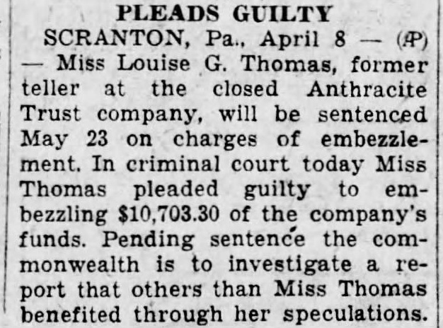 Miss Louise Thomas, former teller the closed Anthracite Trust company, will be sentenced May 23 on charges of embezzlement... pleaded guilty to embezzling $10,703.30 of the company's funds.