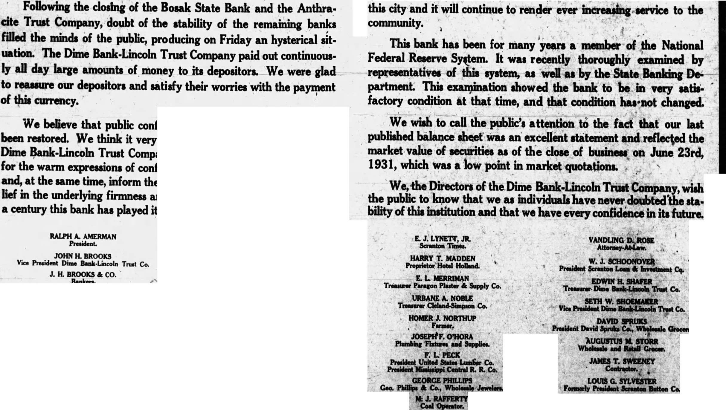 Following the closing of the Bosak State Bank and the Anthracite Trust Company, doubt of the stability of the remaining banks filled the minds of the public, producing on Friday an hysterical situation. The Dime Bank-Lincoln Trust Company paid out continuously all day large amounts of money to its depositors. We were glad to reassure our depositors and satisfy their worries with the payment of this currency. this city and it will continue to render ever increasing service to the community. This bank has been for many years a member of the National Federal Reserve System. It was recently thoroughly examined by representatives of this system, as well as by the State Banking Department. This examination showed the bank to be in very satisfactory condition at that time, and that condition has not changed. We wish to call the public's attention to the fact that our last published balance sheet was an excellent statement and reflected the market value of securities as of the close of business on June 23rd, 1931, which was a low point in market quotations. We, the Directors of the Dime Bank-Lincoln Trust Company, wish the public to know that we as individuals have never doubted the stability of this institution and that we have every confidence in its future. E. L. MERRIMAN Treasurer Paragon Plaster & Supply Co. URBANE A. NOBLE Treasurer Co. HOMER J. NORTHUP Farmer. JOSEPH'F. O'HORA Plumbing Fixtures and Supplies. F. L. PECK President United States Lumber Co. President Mississippi Central R. R. Co. GEORGE PHILLIPS Geo. Phillips & Co., Wholesale Jewelers. M: J. RAFFERTY Coal Operator. EDWIN H. SHAFER Treasurer Dime Bank-Lincoln Trust Co. SETH W. SHOEMAKER Vice President Dime Bank-Lincoln Trust Co. DAVID SPRUKS President David Spruks Co., Wholesale Grocers. AUGUSTUS M. STORR Wholesale and Retail Grocer. JAMES T. SWEENEY Contractor. LOUIS G. SYLVESTER Formerly President Scranton Button Co.