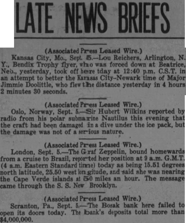 LATE NEWS BRIEFS (Associated Press Leased Wire.) Kansas City, Sept. Reichers, Arlington, N. Bendix Trophy who was forced down at Beatrice, Neb., yesterday, took off here tday at 12:40 p.m. C.S.T. in an attempt to better the Karasas time of Major Jimmie Doolittle, who distance yesterday in hours minutes 30 seconds. Leased Wire.) Oslo, Norway, Sept. Hubert Wilkins reported by radio from his polar submarine Nautilus this evening that the craft had been damaged in dive under the ice pack, but the damage was not of a serious nature. (Associated Press Leased Wire.) London, Zeppelin, bound homewards Sept. from cruise to Brazil, her position at a.m. Eastern Standard time) today as being 15.51 degrees north west gitude, and said she was nearing the Verde islands at 50 miles an hour. The message Cape came through the New Brooklyn. Press Leased Wire.) Bosak bank here failed to Scranton, Sept. open its doors today. The bank's deposits total more than $4,000,000.