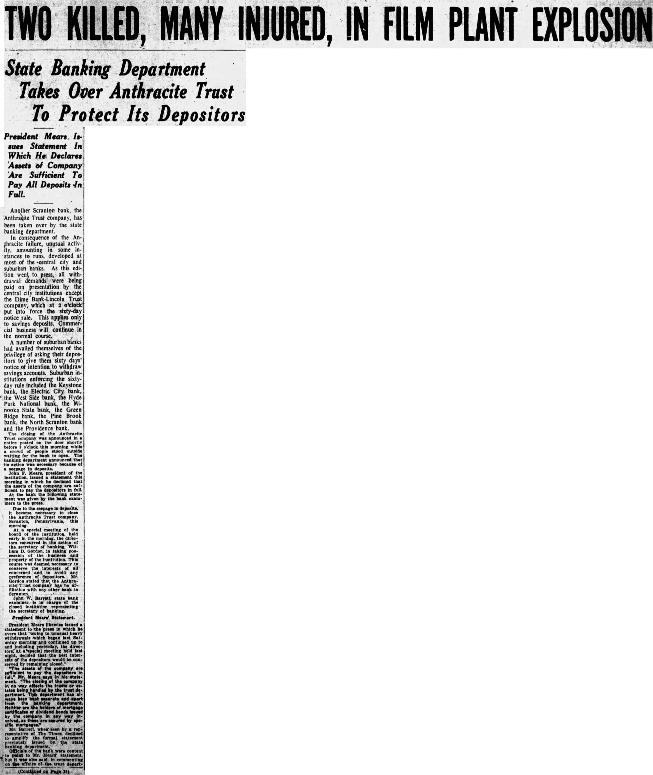 TWO KILLED, MANY INJURED, IN FILM PLANT EXPLOSION State Banking Department Takes Over Anthracite Trust To Protect Its Depositors President Mears Issues Statement In Which He Declares Assets of Company Are Sufficient To Pay All Deposits In Full. Another Scranton bank, the Anthracite Trust company, has been taken over by the state banking department. In consequence of the Anthracite failure, unusual activity, amounting in some instances to runs, developed at most of the central city and suburban banks. As this edition went to press, all withdrawal demands were being paid on presentation by the central city institutions except the Dime Bank-Lincoln Trust company, which at 2 o'clock put into force the sixty-day notice rule. This applies only to savings deposits. Commercial business will continue in the normal course. A number of suburban banks had availed themselves of the privilege of asking their depositors to give them sixty days' notice of intention to withdraw savings accounts. Suburban institutions enforcing the sixtyday rule included the Keystone bank, the Electric City bank, the West Side bank, the Hyde Park National bank, the Minooka State bank, the Green Ridge bank, the Pine Brook bank, the North Scranton bank and the Providence bank. The closing of the Anthracite Trust company was announced in notice posted on the door shortly before while stood outside waiting for the bank to open. The banking department that its action was necessary because of a seepage in deposits. president of the institution, issued statement this morning in which he declared that the assets of the company are ficient pay the depositors in At the bank the following statement was given by the bank examiners to the press. Due to the seepage in deposits, became to the Trust company. Pennsy this special meeting of the board of the institution. held early in the morning, the direcconcurred in the action the secretary of liam in taking possession of business property of the This course was deemed necessary to conserve the interests all concerned and avoid preference depositors. Gorden stated that the AnthraTrust has no affiliation with any other bank in John W. state bank in charge of the closed the secretary of banking President Mears' Statement. President Mears likewise issued statement to the press in which he avers that "owing unusual heavy which began urday up to and yesterday, the directors, at held last night, decided that the best of the depositors would be served by remaining assets of the company sufficient to the depositors full," Mears his state. ment. the way affects the trusts or tates being handled by the trust partment. This has kept and apart from the department. Neither are the holders of or dividend by the in any way as are by Mr. seen by The declined the formal statement issued by the of the content point to Mr. affairs of the trust depart(Continued on Page 35)