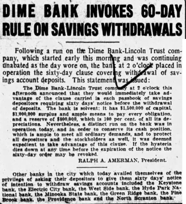 DIME BANK INVOKES 60-DAY RULE ON SAVINGS WITHDRAWALS Following a run on the Dime Bank-Lincoln Trust company, which started early this morning and was continuing unabated as the day wore on, the bank at 2 o'clock placed in operation the sixty-day clause covering withdrawal of savings account deposits. This statement was issued: The Dime Lincoln Trust at 2 o'clock this afternoon that they would take advantage of the carried in each passbook savings depositors requiring sixty notice before the withdrawal of The bank is solvent: It has of surplus and ample means to pay every obligation. and reserve of which 100 per cent. of all its preciations. distinct run on the bank was in operation today. in order to conserve its position. which ample to meet all ordinary demands, and to protect all and as was deemed expedient to take advantage of this clause. the hysteria dies any time before the expiration of the notice the sixty-day order may be RALPH A. which today availed themselves of the Other banks the city their depositors to give days' notice privilege of asking withdraw accounts included the Keystone of intention savings the West the Hyde Park Nabank. the Electric City State Ridge bank, the Pine the Minooka Brook tional bank. bank. the Providence bank and the North Scranton bank.