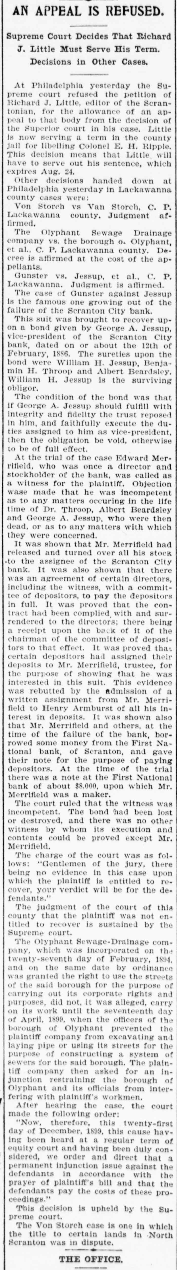 # AN APPEAL IS REFUSED. Supreme Court Decides That Richard J. Little Must Serve His Term. Decisions in Other Cases, At Philadelphia yesterday the Su- preme court refused the petition of Richard J. Little, editor of the Scran- tonian, for the allowance of an ap- peal to that body from the decision of the Superior court in his case. Little is now serving a term in the county jail for libelling Colonel E. H. Ripple. This decision means that Little will have to serve out his sentence, which expires Aug. 24. Other decisions handed down at Philadelphia yesterday in Lackawanna county cases were: Von Storch vs Van Storch, C. P. Lackawanna county. Judgment af- firmed. The Olyphant Sewage Drainage company vs. the borough o. Olyphant, et al., C. P. Lackawanna county. De- cree is affirmed at the cost of the ap- pellants. Gunster vs. Jessup, et al., C. P. Lackawanna. Judgment is affirmed. The case of Gunster against Jessup Is the famous one growing out of the failure of the Scranton City bank. This suit was brought to recover up- on a bond given by George A. Jessup, vice-president of the Scranton City bank, dated on or about the 12th of February, 1886. The sureties upon the bond were William H. Jessup, Benja- min H. Throop and Albert Beardsley. William H. Jessup is the surviving obligor. The condition of the bond was that if George A. Jessup should fulfill with integrity and fidelity the trust reposed in him, and faithfully execute the du- ties assigned to him as vice-president, then the obligation be void, otherwise to be of full effect. At the trial of the case Edward Mer- rifield, who was once a director and stockholder of the bank, was called as a witness for the plaintiff. Objection wase made that he was incompetent as to any matters occuring in the life time of Dr. Throop, Albert Beardsley and George A. Jessup, who were then dead, or as to any matters with which they were concerned. It was shown that Mr. Merrifield had released and turned over all his stock to the assignee of the Scranton City bank. It was also shown that there was an agreement of certain directors, including the witness, with a commit- tee of depositors, to pay the depositors in full. It was proved that the con- tract had been complied with and sur- rendered to the directors; there being a receipt upon the back of it of the chairman of the committee of deposi- tors to that effect. It was proved that certain depositors had assigned their deposits to Mr. Merrifield, trustee, for the purpose of showing that he was interested in this suit. This evidence was rebutted by the admission of a written assignment from Mr. Merri- field to Henry Armburst of all his in- terest in deposits. It was shown also that Mr. Merrifield and others, at the time of the failure of the bank, bor- rowed some money from the First Na- tional bank, of Scranton, and gave their note for the purpose of paying depositors. At the time of the trial there was a note at the First National bank of about $8,000, upon which Mr. Merrifield was a maker. The court ruled that the witness was incompetent. The bond had been lost or destroyed, and there was no other witness by whom its execution and contents could be proved except Mr. Merrifield. The charge of the court was as fol- lows: "Gentlemen of the jury, there being no evidence in this case upon which the plaintiff is entitled to re- cover, your verdict will be for the de- fendants." The judgment of the court of this county that the plaintiff was not en- titled to recover is sustained by the Supreme court. The Olyphant Sewage-Drainage com- pany, which was incorporated on the twenty-seventh day of February, 1894, and on the same date by ordinance was granted the right to use the streets of the said borough for the purpose of carrying out its corporate rights and purposes, did not, it was alleged, carry on its work until the seventeenth day of April, 1899, when the officers of the borough of Olyphant prevented the plaintiff company from excavating and laying pipe or using its streets for the purpose of constructing a system of sewers for the said borough. The plain- tiff company then asked for an in- junction restraining the borough of Olyphant and its officials from inter- fering with plaintiff's workmen. After hearing the case, the court made the following order: "Now, therefore, this twenty-first day of Deecmber, 1899, this cause hav- ing been heard at a regular term of equity court and having been duly con- sidered, we order and direct that a permanent injunction issue against the defendants in accordance with the prayer of plaintiff's bill and that the defendants pay the costs of these pro- ceedings." This decision is upheld by the Su- preme court. The Von Storch case is one in which the title to certain lands in North Scranton was in dispute. THE OFFICE.