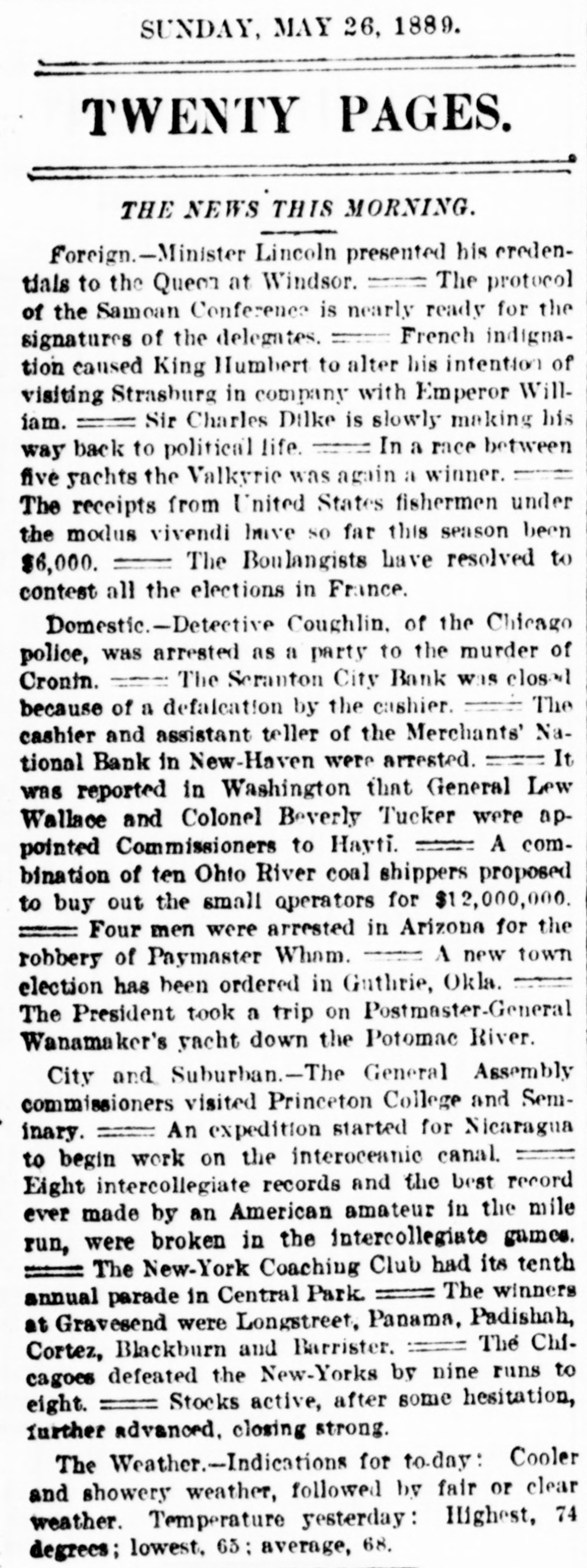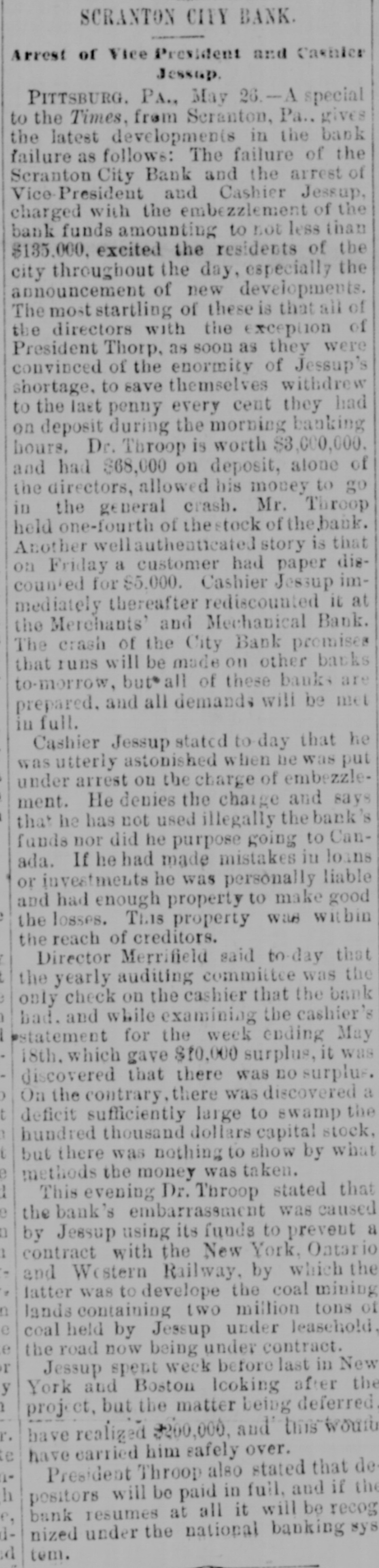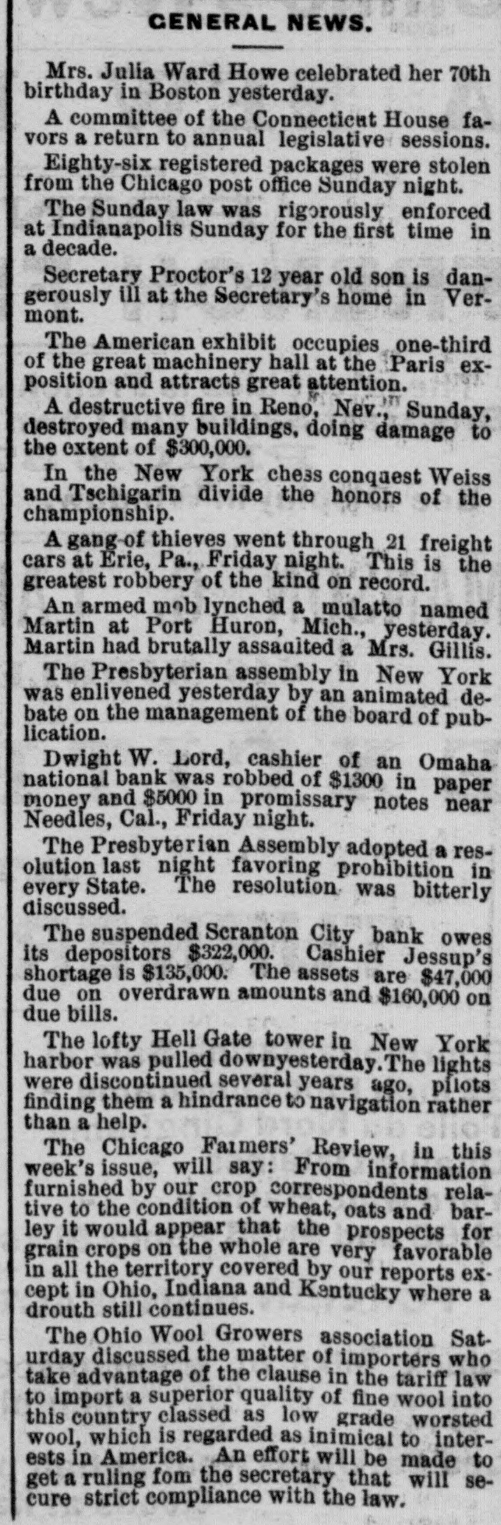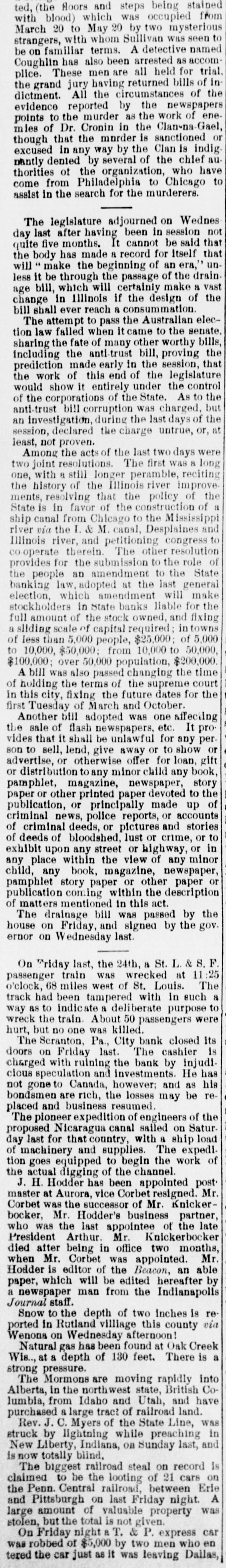 the body has made a record for itself the will make the beginning of an era," un less it be through the passage of the drain age bill, which will certainly make a vas change in Illinois if the design of th bill shall ever reach a consummation. The attempt to pass the Australian elec tion law failed when it came to the senate sharing the fate of many other worthy bills including the anti-trust bill, proving th prediction made early in the session, the the work of this end of the legislatur would show it entirely under the contro of the corporations of the State. As to th anti-trust bill corruption was charged, bu an investigation, during the last days of th session, declared the charge untrue, or, a least, not proven. Among the acts of the last two days were two joint resolutions. The first was a long one, with a still longer peramble, reciting the history of the Illinois river improve ments, resolving that the policy of the State is in favor of the construction of : ship canal from Chicago to the Mississipp river via the I. & M. canal, Desplaines and Illinois river, and petitioning congress to CO operate therein. The other resolution provides for the submission to the role o people an amendment to the State banking law, adopted at the last genera election, which amendment will make stockholders in State banks liable for the full amount of the stock owned, and fixing sliding scale of capital required; in towns less than 5,000 people, $25,000; of 5,000 10,000, $50,000: from 10,000 to 50,000 $100,000; over 50,000 population, $200,000 A bill was also passed changing the time holding the terms of the supreme court this city, fixing the future dates for the Tuesday of March and October. Another bill adopted was one affecting sale of flash newspapers, etc. It proIdes that it shall be unlawful for any perto sell, lend, give away or to show or dvertise, or otherwise offer for loan, gift distribution to any minor child any book amphlet, magazine, newspaper, story aper or other printed paper devoted to the ublication, or principally made up of riminal news, police reports, or accounts criminal deeds, or pictures and stories deeds of bloodshed, lust or crime, or to xhibit upon any street or highway, or in place within the view of any minor hild, any book, magazine, newspaper amphlet story paper or other paper or ublication coming within the description matters mentioned in this act. The drainage bill was passed by the ouse on Friday, and signed by the gov on Wednesday last. On Triday last, the 24th, a St. L. & S. F assenger train was wrecked at 11:25 'clock, 68 miles west of St. Louis. The rack had been tampered with in such 8 ay as to indicate a deliberate purpose to reck the train. About 50 passengers were but no one was killed. The Scranton, Pa., City bank closed Its oors on Friday last. The cashier is harged with ruining the bank by injudi ious speculation and investments. He has gone to Canada, however; and as his ondsmen are rich, the losses may be relaced and business resumed. The pioneer expedition of engineers of the roposed Nicaragua canal sailed on Satur last for that country, with a ship load machinery and supplies. The expedi goes equipped to begin the work of actual digging of the channel. J. H. Hodder has been appointed post naster at Aurora, vice Corbet resigned. Mr Corbet was the successor of Mr. Knickerocker, Mr. Hodder's business partner who was the last appointee of the late President Arthur. Mr. Knickerbocke lied after being in office two months when Mr. Corbet was appointed. Mr Hodder is editor of the Beacon, an able aper, which will be edited hereafter by newspaper man from the Indianapolis ournal staff. Snow to the depth of two Inches is re orted in Rutland villiage this county via Venona on Wednesday afternoon! Natural gas has been found at Oak Creek Vis.., at a depth of 130 feet. There is a trong pressure. The Mormons are moving rapidly into Alberta, in the northwest state, British Co umbia, from Idaho and Utah, and have urchased a large tract of railroad land. Rev. J. C. Myers of the State Line, was truck by lightning while preaching in New Liberty, Indiana, on Sunday last, and now totally blind, The biggest railroad steal on record I laimed to be the looting of 21 cars or