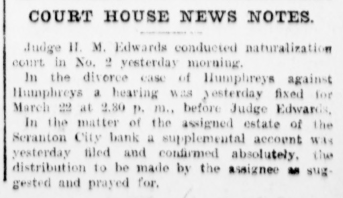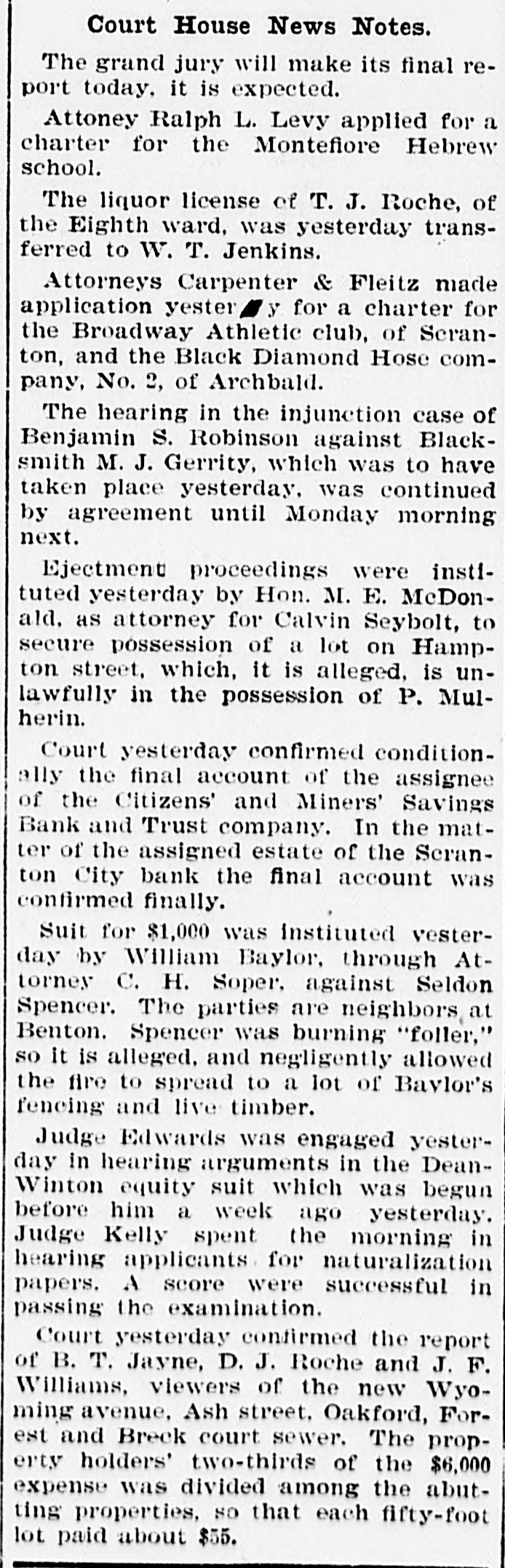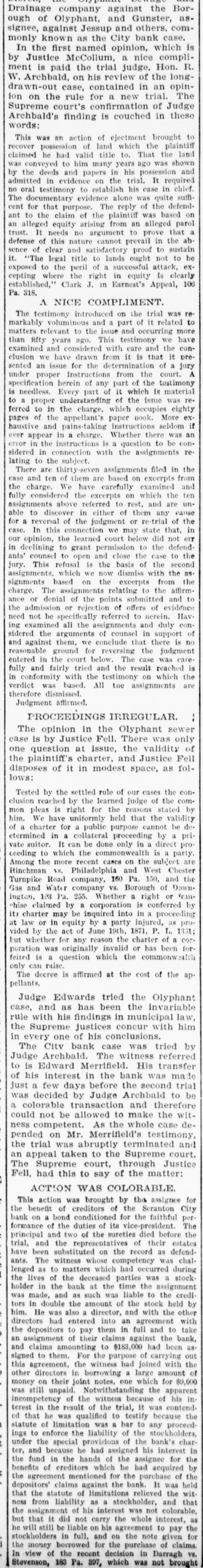 Drainage company against the Bor- ough of Olyphant, and Gunster, as- signee, against Jessup and others, com- monly known as the City bank case. In the first named opinion, which is by Justice McCollum, a nice compli- ment is paid the trial judge, Hon. R. W. Archbald, on his review of the long- drawn-out case, contained in an opin- ion on the rule for a new trial. The Supreme court's confirmation of Judge Archbald's finding is couched in these words: This was an action of ejectment brought to recover possession of land which the plaintiff claimed he had valid title to. That the land was conveyed to him many years ago was shown by the deeds and papers in his possession and admitted in evidence on the trial. It required no oral testimony to establish his case in chief. The documentary evidence alone was quite suffi- cent for that purpose. The reply of the defend- ant to the claim of the plaintiff was based on an alleged equity arising from an alleged parol trust. It needs no argument to prove that a defense of this nature cannot prevail in the ab- sence of clear and satisfactory proof to sustain it. "The legal title to lands ought not to be exposed to the peril of a successful attack, ex- cepting where the right in equity is clearly established," Clark J. in Earnest's Appeal, 106 Pa. 318. # A NICE COMPLIMENT. The testimony introduced on the trial was re- markably voluminous and a part of it related to matters relevant to the issue and occurring more than fifty years ago. This testimony we have examined and considered with care and the con- clusion we have drawn from it is that it pre- sented an issue for the determination of a jury under proper instructions from the court. A specification herein of any part of the testimony is needless. Every part of it which is material to a proper understanding of the issue was re- ferred to in the charge, which occupies eighty pages of the appellant's paper book. More ex- haustive and pains-taking instructions seldom if ever appear in a charge. Whether there was an error in the instructions is a question to be con- sidered in connection with the assignments re- lating to the subject. There are thirty-seven assignments filed in the case and ten of them are based on excerpts from the charge. We have carefully examined and fully considered the excerpts on which the ten assignments above referred to rest, and are un- able to discover in either of them any cause for a reversal of the judgment or re-trial of the case. In this connection we may state that, in our opinion, the learned court below did not err in declining to grant permission to the defend- ants' counsel to open and close the case to the jury. This refusal is the basis of the second assignments, which we now dismiss with the as- signments based on the excerpts from the charge. The assignments relating to the affirm- ance or denial of the points submitted and to the admission or rejection of offers of evidence need not be specifically referred to nerein. Hav- ing examined all the assignments and duly con- sidered the arguments of counsel in support of and against them, we conclude that there is no reasonable ground for reversing the judgment entered in the court below. The case was care- fully and fairly tried and the result reached is in conformity with the testimony on which the verdict was based. All the assignments are therefore dismissed. Judgment affirmed. # PROCEEDINGS IRREGULAR. The opinion in the Olyphant sewer case is by Justice Fell. There was only one question at issue, the validity of the plaintiff's charter, and Justice Fell disposes of it in modest space, as fol- lows: Tested by the settled rule of our cases the con- clusion reached by the learned judge of the com- mon pleas is right for the reasons stated by him. We have uniformly held that the validity of a charter for a public purpose cannot be de- etermined in a collateral proceeding by a pri- vate suitor. It can be done only in a direct pro- ceeding to which the commonwealth is a party. Among the more recent cases on the subject are Hinchman vs. Philadelphia and West Chester Turnpike Road company, 160 Pa. 150, and the Gas and Water company vs. Borough of Down- ington, 183 Pa. 255. Whether a right or fran- chise claimed by a corporation is conferred by its charter may be inquired into in a proceeding at law or in equity by a party injured, as pro- vided by the act of June 19th, 1871, P. L. 1331; but whether for any reason the charter of a cor- poration was originally invalid or has been for- feited is a question which the commonwealth only can raise. The decree is affirmed at the cost of the ap- pellants. Judge Edwards tried the Olyphant case, and as has been the invariable rule with his findings in municipal law, the Supreme justices concur with him in every one of his conclusions. The City bank case was tried by Judge Archbald. The witness referred to is Edward Merrifield. His transfer of his interest in the bank was made just a few days before the second trial was decided by Judge Archbald to be a colorable transaction and therefore could not be allowed to make the wit- ness competent. As the whole case de- pended on Mr. Merrifield's testimony, the trial was abruptly terminated and an appeal taken to the Supreme court. The Supreme court, through Justice Fell, had this to say of the matter: # ACTION WAS COLORABLE. This action was brought by the assignee for the benefit of creditors of the Scranton City bank on a bond conditioned for the faithful per- formance of the duties of its vice-president. The principal and two of the sureties died before the trial, and the representatives of their estates have been substituted on the record as defend- ants. The witness whose competency was chal- lenged as to matters which had occurred during the lives of the deceased parties was a stock- holder in the bank at the time the assignment was made, and as such was liable to the credi- tors in double the amount of the stock held by him. He was 