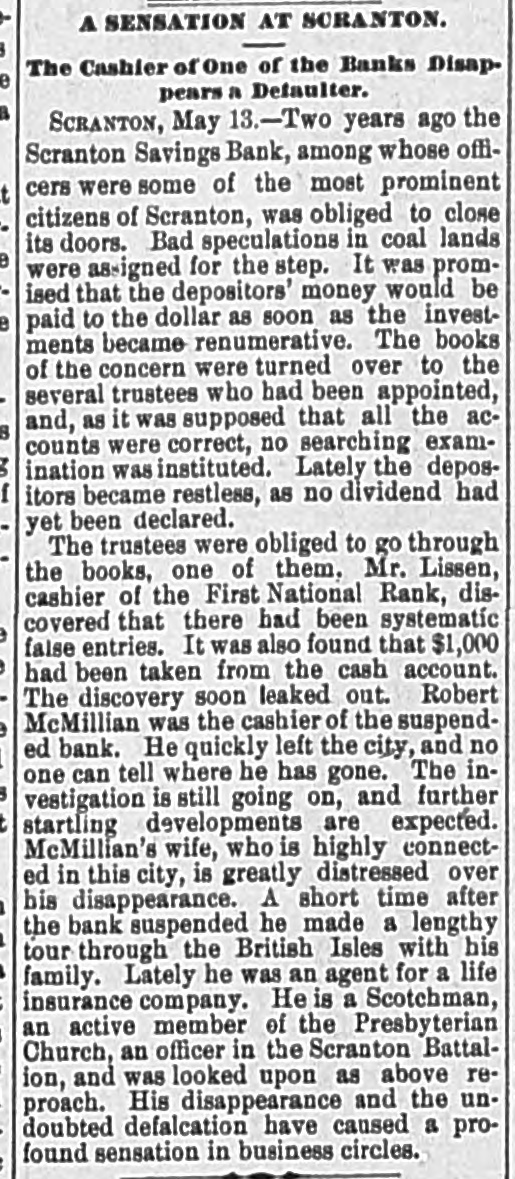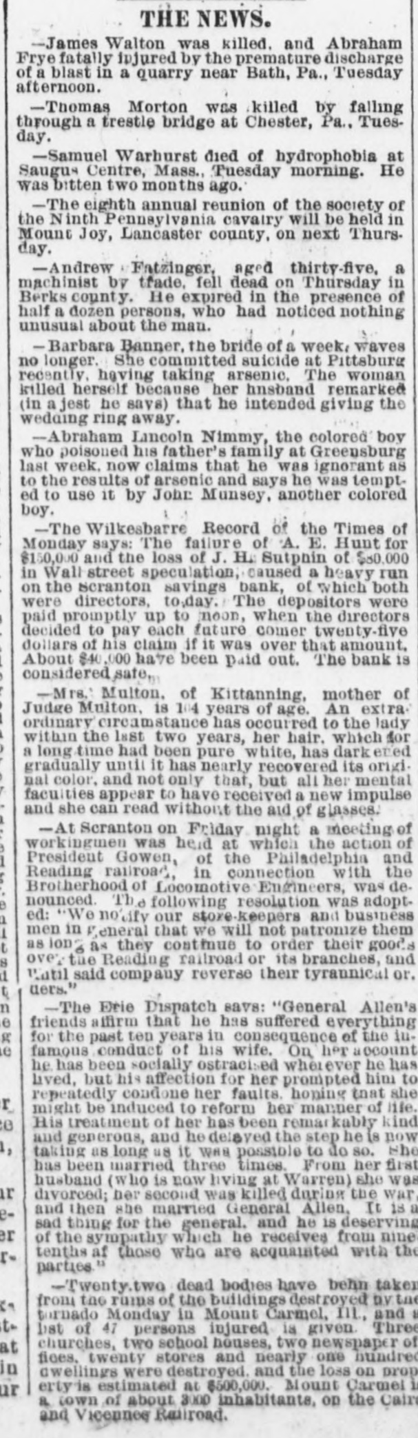 THE NEWS. -James Walton was killed. and Abraham Frye fatally injured by the premature discharge of a blast in a quarry near Bath, Pa., Tuesday afternoon. -Thomas Morton was killed by falling through a trestle bridge at Chester, Pa., Tuesday. -Samuel Warburst died of hydrophobia at Saugus Centre, Mass., Tuesday morning. He was bitten two months ago. -The eighth annual reunion of the society of the Ninth Pennsylvania cavairy will be held in Mount Joy, Lancaster county. on next Thurs. day. -Andrew Fatzinger, aged thirty-five, a machinist by trade, fell dead on Thursday in Berks county. He expired in the presence of half a dozen persons. who had noticed nothing unusual about the man. -Barbara Banner, the bride of a week waves no longer. She committed suicide at Pittsburg recently, having taking arsenic, The woman killed herself because her hnsband remarked (in a jest he says) that he intended giving the wedaing ring away. -Abraham Lancoin Nimmy, the colored boy who poisoned his father's family at Greensburg last week. now claims that he was ignorant as to the results of arsenic and says he was tempt. ed to use it by John Munsey, another colored boy. -The Wilkesbarre Record of the Times of Monday says: The failure of A. E. Hunt for $150,000 and the loss of J. H. Sutphin of $80.000 in Wall street speculation, caused a heavy run on the Scranton savings bank, of which both were directors, to,day. The depositors were paid promptly up to noon, when the directors decided to pay each future comer twenty-five dollars of his claim if it was over that amount, About $40 1.000 have been paid out. The bank 18 considered safe. -Mrs. Multon. of Kittanning, mother of Judge Multon, is 104 years of age. An extraordinary circamstance has occurred to the lady within the last two years, her hair. which for a long time had been pure white, has dark ered gradually until it has nearly recovered its original color, and not only that, but all her mental faculties appear to have received a new impulse and she can read without the aid of glasses. -At Scranton on Friday night a meeting of workingmen was head at which the action of President Gowen, of the Philadelphia and Reading railroad in connection with the Brotherhood of Locomotive Engineers, was denounced. The following resolution was adopted: "We no ify our store-keepers and business men in general that we will not patronize them long as they continue to order their goods over tue Reading railroad or its branches, and Patil said company reverse their tyrannical or. uers." n -The Etile Dispatch savs: "General Allen's e friends affirm that he has suffered everything g for the past ten years in consequence of the iue famous conduct of his wife. On her account he has been socially ostracised wholever he has lived, but his affection for her prompted him to repeatedly condone her faults. honing that she r might be induced to reform her manner of life. His treatment of her has been remarkably kind e and generous, and he delayed the step he is now 1, taking as long us it WAS possible to do so. She has been married three times. From her first husband (who is now living at Warren) she was r divorced; her second was killed during the war and then she married General Allen, It 18 esad thing for the general. and he is deserving er of the sympathy which he receives from nine tenths af those who are acquainted with the rparties is -Twenty.t two dead bodies have behn taken from the runs of the buildings destroyed DV the in tornado Monday in Mount Carmel, III., and to list of 47 persons injured is given. Three churches, two school houses, two newspaper of at fices. twenty stores and nearly one hundred in awellings were destroyed. and the loss on Drop erty is estimated at $500,000. Mount Carmel ur a town of about 3000 inhabitants, on the Cair and Vicennee Railroad.