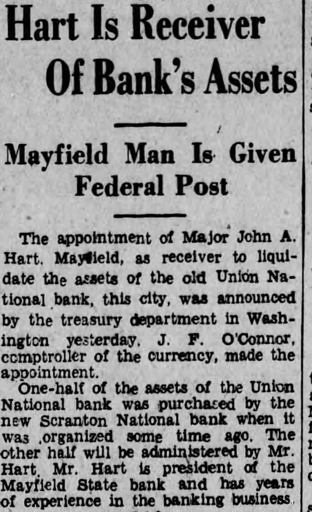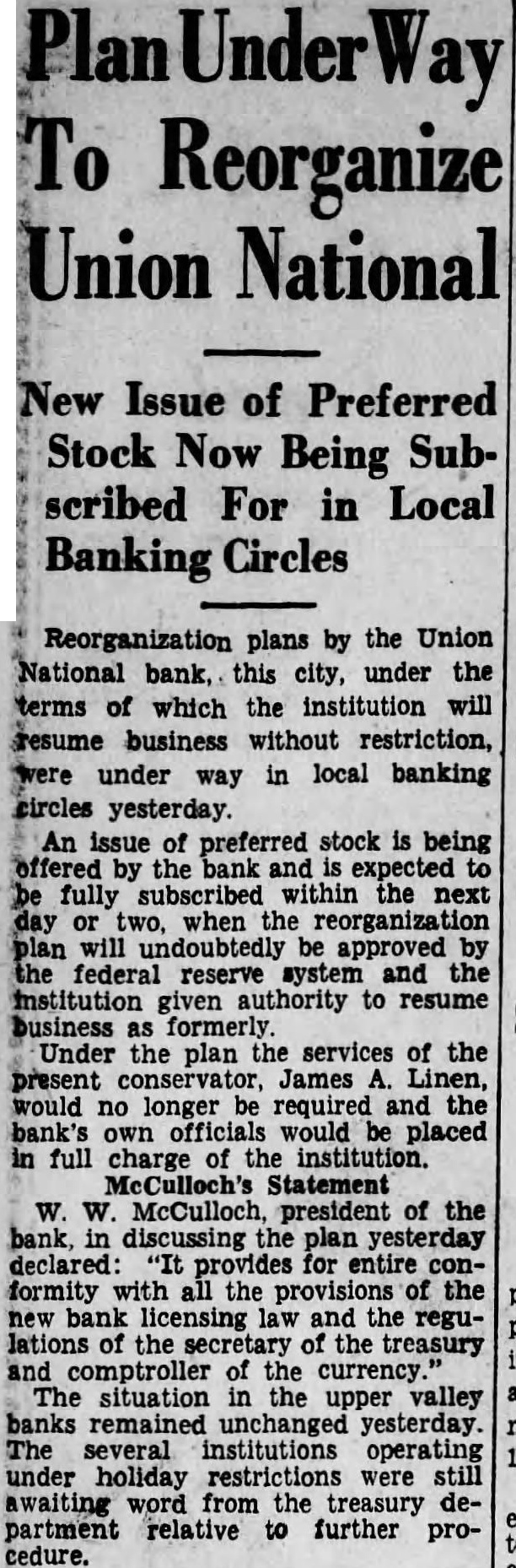 To Reorganize Union National New Issue of Preferred Stock Now Being Subscribed For in Local Banking Circles Reorganization plans by the Union National bank, this city, under the terms of which the institution will resume business without restriction, were under in local banking circles An issue preferred stock is being offered the expected fully subscribed within the next day two, when the reorganization will be approved federal reserve and the institution to resume business formerly. Under the plan the services of the present conservator, James Linen, would no longer be required and the own placed charge institution. McCulloch's Statement W. McCulloch, of the discussing plan yesterday declared: provides for entire formity with all the provisions the new law and the regulations of the treasury and the currency. situation the upper valley remained unchanged yesterday. several institutions operating holiday restrictions awaiting the treasury department relative to further procedure.