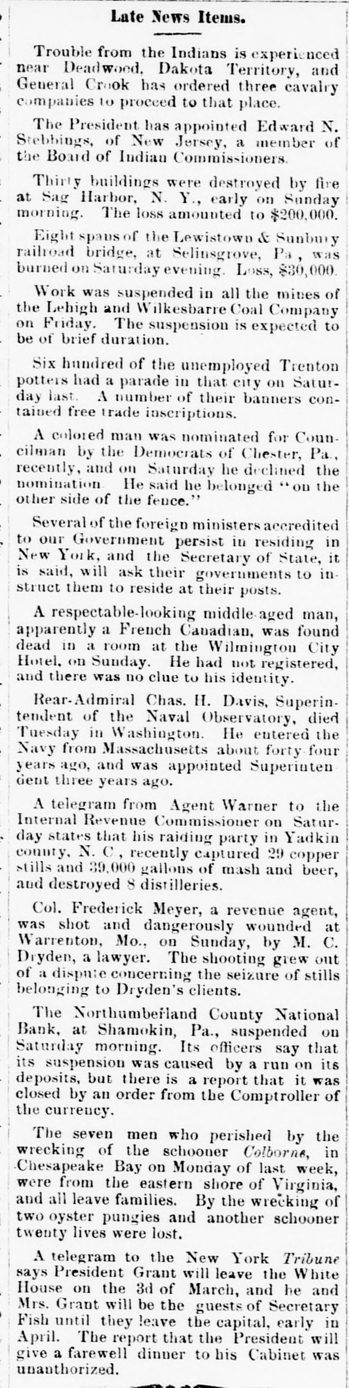 NEWS SUMMARY. e debt of the Methodist Publishing se, in Nashville, is $250,000. reene claims a 121 county darkey Next! 'S old, who wants to marry. ne treaty with Spain was ratified by Senate on the 10th. urkey and Servia have agreed upon is of peace. revolt is threatened in Constantile. x-President Lerdo, of Mexico, arrivn New York, on the 11th. he engineers on the Boston and Mia railroad have struck. [ardi Gras was celebrated in Mem3 and New Orleans in grand style. WO murderers were hanged at Port pacco, Md., last Saturday, both cold. everal vessels, with their ciew3 and were lost the week, sengers, first Bay. of last storm on Chesepeake he Northumberland county National nk at Shomokin, Pa., closed its doors iday. A large savings and trust comby of the same village failed the day fore. saac W. Sitler, a druggist, has been Id the action of the grand in y, to answer Philadelphia, for poisoning a lato death with muratic acid, by misse in compounding a prescription. Steam street cars have been introduced one of the lines Philadelphia, longest the city-Market street-being comletely fitted out with them. The of William Sterris & Co., imorters of 598 store laces, Broadway, New finwas robbed last week of their ork, stock. Loss estimated at over $25,00. One thousand two hundred and fiftyine of the coun7, have S. C., taxpayers paid $3,409.95 of Anderson of their ixes to the Hampton Government. .bout one hundred of this number were olored men. A man calling himself J. A. Burgett, vas in Lebanon n of the arrested charge swindling. last Saturday, He had windled a number of Springfield merchauts. The United States Commissioners Court attacked by men, in was armed and disNorth Carclina, the other day, persed. The armed men belong to a gang of illicit distillers. Caroline Lambert, aged 101 years, was burned to last had some kerosene on dropped death, Monday. her clothing, She which was accidentally ignited, burning her to a crisp-Ex. murdered man was found in Obion near Paducah on iver, A Junction, the Northwestern road. He had a bullet ole through his forehead, and one through his breast. He was not identiied. The Supreme Court of Utah Territory as overruled the objections made to the conviction of John D. Lee, the Mounain Meadow murderer, and has ordered he Lower Court to fix another day for he execution. The Cashier of the First National Bank of Franklin, Ind., who was a defaulter, nd who disappeared last week, was a room Cound, Saturday, lying in back condiear the bank, in an exhausted ion. He was insane. An election has been called for the 13th of March, in the ninth Congressional District of Georgia, to fill the vacancy caused by the election ot Hill to the Senate. Walls, a brakeman on the Nash and ville, John Chattanooga St. Louis railway, was so badly crushed while coupling the cars at Stevenson, on the 13th, that he died a few hours afterwards. The Fayetteville Observer chronicles the death of Mr. Larry Dempsey, a citizen of that county, aged 109 years. A lot of Ohioans, of ample means and enterprise, propose to establish glass works at Chattanooga. The Brownsville Bee has been revived after a suspension of about 12 months. W. Ivie Westbrook, editor and proprietor.