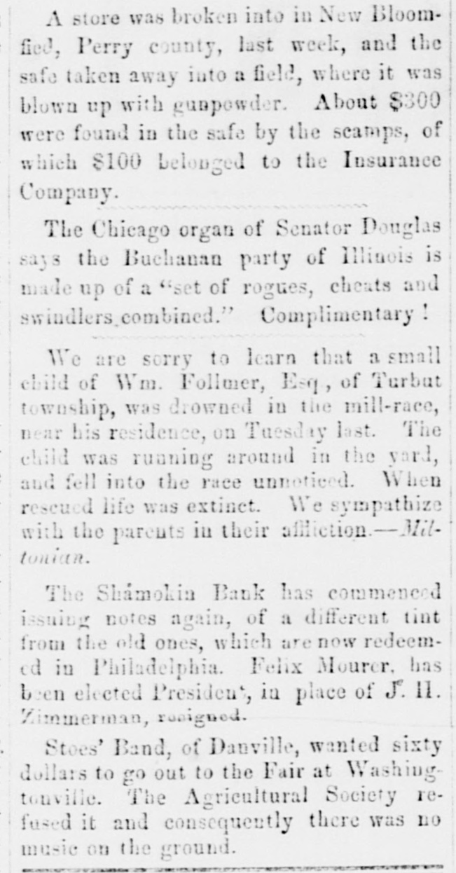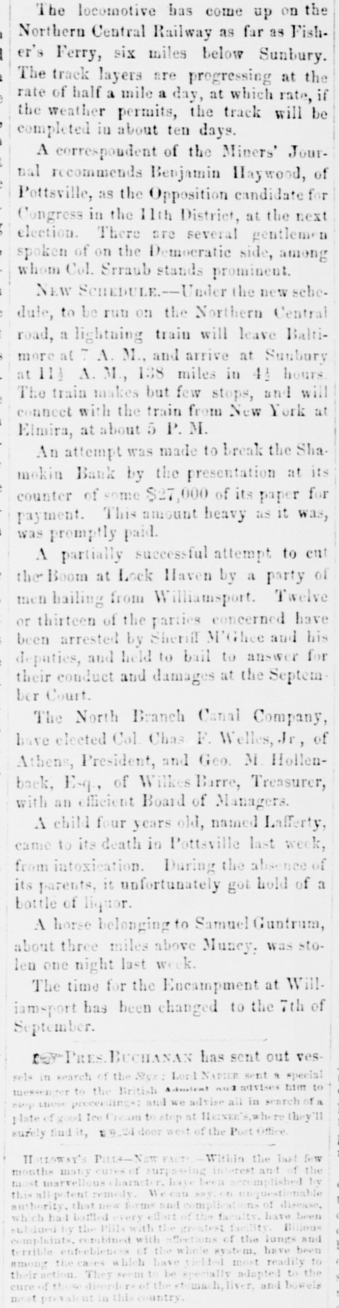 The locomotive has come up on the Northern Central Railway as far as Fisher's Ferry, six miles below Sunbury. The track layers are progressing at the rate of half a mile a day, at which rate, if the weather permits, the track will be completed in about ten days. A correspondent of the Miners' Journal recommends Benjamin Haywood, of Pottsville, as the Opposition candidate for Congress in the 11th District, at the next election. There are several gentlemen spoken of on the Democratic side, among whom Col. Srraub stands prominent. New SCHEDULE.-Under the new schedule, to be run on the Northern Central road, a lightning train will leave Baltimore at 7 A. M., and arrive at Sunbury at 111 A. M., 138 miles in 41 hours The train makes but few stops, and will connect with the train from New York at Elmira, at about 5 P. M. An attempt was made to break the Shamokin Bank by the presentation at its counter of some $27,000 of its paper for payment. This amount heavy as it was, was promptly paid. A partially successful attempt to cut the Boom at Lock Haven by a party of men hailing from Williamsport. Twelve or thirteen of the parties concerned have been arrested by Sheriff M'Ghee and his deputies, and held to bail to answer for their conduct and damages at the Septem. ber Court. The North Branch Canal Company, have elected Col. Chas F. Welles, Jr, of Athens, President, and Geo. M. Hollenback, Esq., of Wilkes Barre, Treasurer, with an efficient Board of Managers. A child four years old, named Lafferty, came to its death in Pottsville last week, from intoxication. During the absence of its parents, it unfortunately got hold of a bottle of liquor. A horse belonging to Samuel Guntrum, about three miles above Muney, was stolen one night last week. The time for the Encampment at Williamsport has been changed to the 7th of September. PRES.BUCHANAN has sent out vessels in search of the Styr: Lord NAPIER sent a special messenger to the British Admiral and advises him to stop these proceedings: and we advise all in scarch of a plate of good Ice Cream to stop at HEINER'S they'll surely find it, $9.21 door west of the Post Office. IT ILLOWAY'S PILLS-NEW FACTS Within the last few months many cures of surpassing interest and of the most marvellous character, haye been accomplished by this all potent remedy. We can say on unquestionable authority, that new forms and complications of disease, which had baffled every effort of the faculty, have been subdued by the Pills with the greatest facility. Billous complaints, combined with affections of the lungs and terrible enfeebleness of the whole system, have been among the cases which have yielded most readily to their action. They seem to be specially adapted to the cure of those disord of the stomach, liver, and bowels most prevaten in this country.