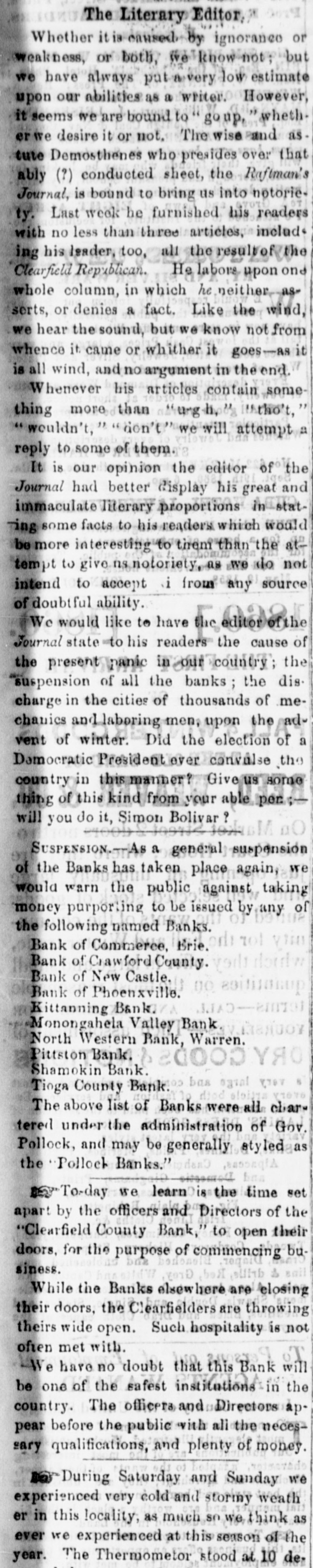 Whether it is caused by ignorance or weakness, or both, We know not; but we have always put a very low estimate upon our abilities as a writer. However, it seems we are bound to" goup, whether we desire it or not. The wise and as tute Demosthenes who presides over that ably (?) conducted sheet, the Raftman's Journal, is bound to bring us into notoriety. Last week he furnished his readers with no less than three articles, includs ing his leader, too, all the result of the Clearfield Republican. He labors upon one whole column, in which he neither asserts, or denies a fact. Like the wind, we hear the sound, but we know not from whence it. came or whither it goes-as it is all wind, and no argument in the end. Whenever his articles contain something more than Murg h, "tho't, " wouldn't, don't we will attempt a reply to some of them It is our opinion the editor of the Journal had better display his great and immaculate literary proportions in stating some facts to his readers which would be more interesting to them than the at tempt to give ns notoriety as we do not intend to accept i from any source of doubtful ability. We would like to have the editor of the Journal state to his readers the cause of the present panic in our country; the suspension of all the banks the dis. charge in the cities of thousands of mechanics and laboring men, upon the advent of winter. Did the election of a Democratic President ever convulse the country in this manner? Give us some thing of this kind from your able per. will you do it, Simon Bolivar SUSPENSION As a general suspension of the Banks has taken place again, we would warn the public against taking money purporting to be issued by any of the following named Banks. Bank of Commerce, Brie. Bank of Crawford County. Bank of New Castle. Bank of Phoenxville. Kittanning Bank. Monongahela Valley Bank North Western Bank, Warren. Pittston Bank. Shamokin Bank. Tioga County Bank. bas The above list of Banks were all chare tered under the administration of Gov Pollock, and may be generally styled as the Pollock Banks." To-day we learn is the time set apart by the officers and Directors of the Clearfield County Bank," to open their doors, for the purpose of commencing bu siness. While the Banks elsewhere are elosing their doors, the Clearfielders are throwing theirs wide open. Such hospitality is not often met with. We have no doubt that this Bank will be one of the safest institutions in the country. The officers and Directors appear before the public with all the necessary qualifications, and plenty of money. During Saturday and Sunday we experienced very cold and stormy weath er in this locality, as much so we think as ever we experienced at this season of the year The Thermome stood at 10 de