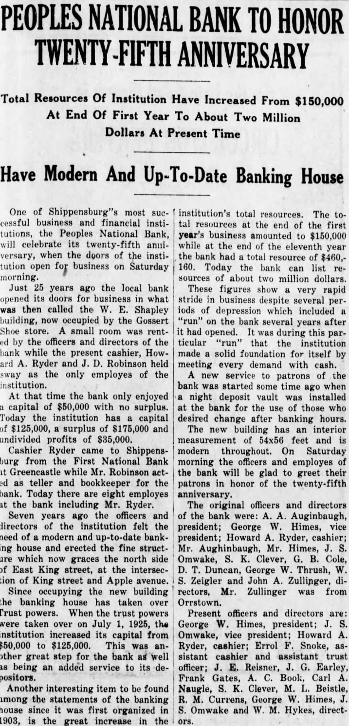 BANK TO ANNIVERSARY Total Resources Of Institution Have Increased From $150,000 At End Of First Year To About Two Million Dollars At Present Time Have Modern And Banking House One of Shippensburg"s most successful business and financial institutions, the Peoples National Bank, will celebrate its anniversary, when the doors of the institution open business on Saturday morning. Just 25 years ago the local bank opened its doors for business in what was then called the W. E. Shapley building, now occupied by the Gossert Shoe store. A small room was rentby the officers and directors of the bank while the present cashier, Howard Ryder and Robinson held sway as the only employes of the institution. At that time the bank only enjoyed capital of $50,000 with no surplus. Today the institution has capital surplus of $175,000 and undivided profits of $35,000. Cashier Ryder came to Shippensburg from the First National Bank Greencastle while Mr. Robinson actas teller and bookkeeper for the bank. Today there are eight employes the bank including Mr. Ryder. Seven years ago the officers and directors of the institution felt the need of modern and bankhouse and erected the fine structwhich now graces the north side of East King street, the intersection of King street and Apple avenue. Since occupying the new building the banking house has taken over Trust powers. When the trust powers taken over on July 1925, the institution increased its capital from $50,000 to $125,000. This was another great step for the bank as being an added service to its depositors. Another interesting item to be found among the statements of the banking house since was first organized in 1903, is the great increase in the institution's total The resources. resources at the end of the first year's business amounted to $150,000 while at the end of the eleventh year the bank had total resource of $460,160. Today the bank can list sources of about two million dollars. These figures show very rapid stride business despite several periods of depression which included "run" on the bank several years after had opened. during this particular "run" that the institution made solid foundation for itself meeting every demand with cash. A new service patrons of the bank was started some time ago when night deposit vault was installed the bank for the use of those who desired change after banking hours. The new building has an interior measurement of 54x56 feet and modern throughout. On Saturday morning the officers and employes of the bank will be glad to greet their patrons in honor of the anniversary. The original officers and directors of the bank were: Auginbaugh, president; George W. Himes, vice president; Howard Ryder, cashier; Mr. Aughinbaugh, Mr. Himes, Omwake, K. Clever, B. Cole, Duncan, George Thrush, Zeigler and John Zullinger, diMr. Zullinger was from Orrstown. Present officers and directors George W. Himes, president; Omwake, vice president; Howard Ryder, cashier; Errol Snoke, sistant cashier and assistant trust officer; Reisner, Earley, Frank Gates, C. Book, Carl Naugle, Clever, M. Beistle, Currens, George W. Himes, Omwake and Hykes, direct-
