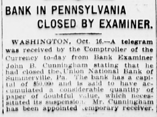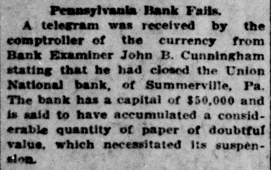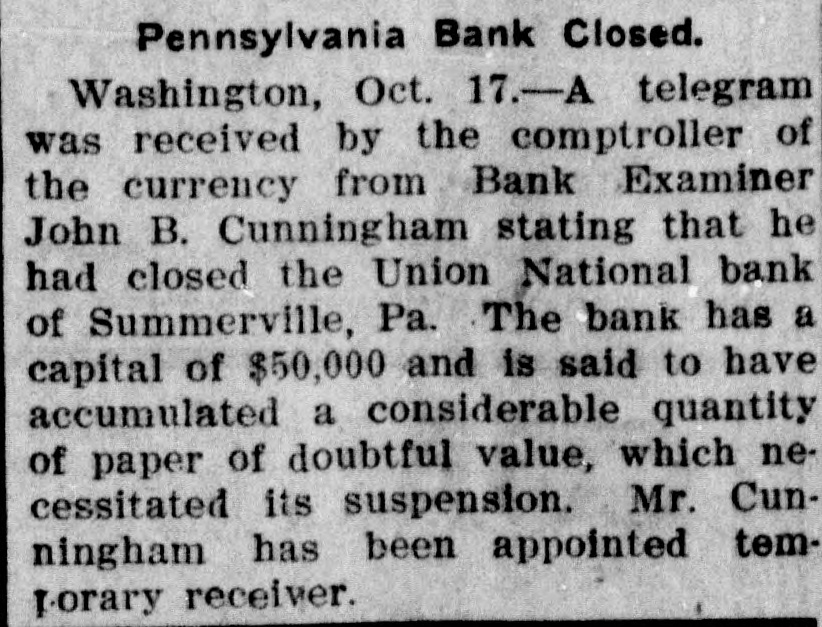 A telegram was received by the Comptroller of the Currency ... stating that he had closed the Union National Bank of Summerville, Pa. ... said to have accumulated a considerable quantity of paper of doubtful value, which necessitated its suspension.