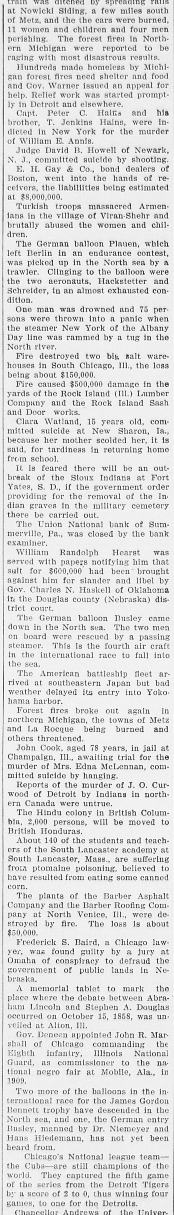 was no c at Nowicki Siding, a few miles south of Metz, and the the cars were burned, 11 women and children and four men perishing. The forest fires in Northern Michigan were reported to be raging with most disastrous results. Hundreds made homeless by Michigan forest fires need shelter and food and Gov. Warner issued an appeal for help. Relief work was started promptly in Detroit and elsewhere. Capt. Peter C. Hains and his brother, T. Jenkins Hains, were indicted in New York for the murder of William E. Annis. Judge David B. Howell of Newark, N. J., committed suicide by shooting. E. H. Gay & Co., bond dealers of Boston, went into the hands of receivers, the liabilities being estimated at $8,000,000. Turkish troops massacred Armenians in the village of Viran-Shehr and brutally abused the women and children. The German balloon Plauen, which left Berlin in an endurance contest, was picked up in the North sea by a trawler. Clinging to the balloon were the two aeronauts, Hackstetter and Schreider, in an almost exhausted condition. One man was drowned and 75 persons were thrown into a panic when the steamer New York of the Albany Day line was rammed by a tug in the North river. Fire destroyed two big salt ware. houses in South Chicago, Ill., the loss being about $150,000. Fire caused $500,000 damage in the yards of the Rock Island (III.) Lumber Company and the Rock Island Sash and Door works. Clara Watland, 15 years old, committed suicide at New Sharon, Ia., because her mother scolded her, it is said, for tardiness in returning home from school. It is feared there will be an outbreak of the Sioux Indians at Fort Yates, S. D., if the government order providing for the removal of the Indian graves in the military cemetery there be carried out. The Union National bank of Summerville, Pa., was closed by the bank examiner. William Randolph Hearst was served with papers notifying him that suit for $600,000 had been brought by Gov. against Charles him for N. Haskell slander of and Oklahoma libel in the Douglas county (Nebraska) district court. The German balloon Busley came men on were a down board in the North rescued sea. The by two passing steamer. This is the fourth air craft in the international race to fall into the sea. The American battleship fleet arrived at southeastern Japan but bad weather delayed its entry into Yokohama harbor. Forest fires broke out again in northern Michigan, the towns of Metz and La Rocque being burned and others threatened. John Cook, aged 78 years, in jail at Champaign Ill., awaiting trial for the murder of Mrs. Edna McLennan, committed suicide by hanging. Reports of the murder of J. O. Curwood of Detroit by Indians in northern Canada were untrue. The Hindu colony in British Columbia, 2,000 persons, will be moved to British Honduras. About 140 of the students and teachers at are South of the Lancaster, South Lancaster Mass., academy suffering from ptomaine poisoning, believed to have resulted from eating some canned corn. The plants of the Barber Asphalt Company and the Barber Roofing Company at North Venice, Ill., were destroyed by fire. The loss is about $50,000. Frederick S. Baird, a Chicago lawyer, was found guilty by a jury at Omaha of conspiracy to defraud the government of public lands in Nebraska. A memorial tablet to mark the place where the debate between Abraham Lincoln and Stephen A. Douglas occurred on October 15, 1858, was unveiled at Alton, III. Gov. Deneen appointed John R. Mar shall of Chicago commanding the Eighth infantry, Illinois National Guard, as commissioner to the national negro fair at Mobile, Ala., in 1909. Two more of the balloons in the in ternational race for the James Gordon Bennett trophy have descended in the North sea, and one, the German entry Busley, manned by Dr. Niemeyer and Hans Hiedemann, has not yet been heard from. Chicago's National league teamthe Cubs-are still champions of the world. They captured the fifth game of the series from the Detroit Tigers by a score of 2 to 0, thus winning four games, to one for the Detroits. Chancellor Andrews of the Univer-
