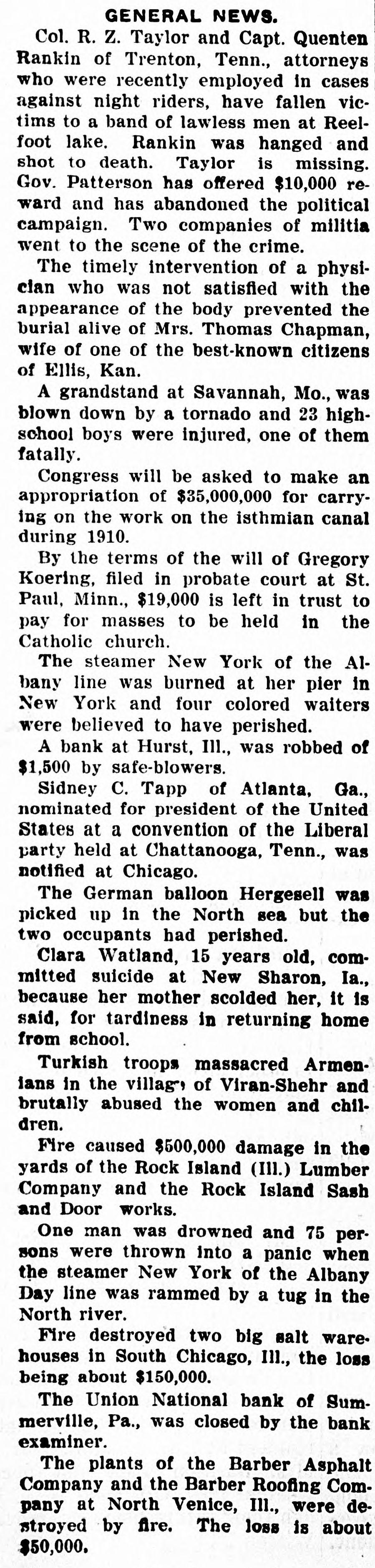 GENERAL NEWS. Col. R. Z. Taylor and Capt. Quenten Rankin of Trenton, Tenn., attorneys who were recently employed in cases against night riders, have fallen victims to a band of lawless men at Reelfoot lake. Rankin was hanged and shot to death. Taylor is missing. Gov. Patterson has offered $10,000 reward and has abandoned the political campaign. Two companies of militia went to the scene of the crime. The timely intervention of a physician who was not satisfied with the appearance of the body prevented the burial alive of Mrs. Thomas Chapman, wife of one of the best-known citizens of Ellis, Kan. A grandstand at Savannah, Mo., was blown down by a tornado and 23 highschool boys were injured, one of them fatally. Congress will be asked to make an appropriation of $35,000,000 for carrying on the work on the isthmian canal during 1910. By the terms of the will of Gregory Koering, filed in probate court at St. Paul, Minn., $19,000 is left in trust to pay for masses to be held in the Catholic church. The steamer New York of the Albany line was burned at her pier in New York and four colored waiters were believed to have perished. A bank at Hurst, Ill., was robbed of $1,500 by safe-blowers. Sidney C. Tapp of Atlanta, Ga., nominated for president of the United States at a convention of the Liberal party held at Chattanooga, Tenn., was notified at Chicago. The German balloon Hergesell was picked up in the North sea but the two occupants had perished. Clara Watland, 15 years old, committed suicide at New Sharon, Ia., because her mother scolded her, it is said, for tardiness in returning home from school. Turkish troops massacred Armenians in the village, of Viran-Shehr and brutally abused the women and children. Fire caused $500,000 damage in the yards of the Rock Island (III.) Lumber Company and the Rock Island Sash and Door works. One man was drowned and 75 persons were thrown into a panic when the steamer New York of the Albany Day line was rammed by a tug in the North river. Fire destroyed two big salt ware. houses in South Chicago, Ill., the loss being about $150,000. The Union National bank of Summerville, Pa., was closed by the bank examiner. The plants of the Barber Asphalt Company and the Barber Roofing Company at North Venice, III., were destroyed by fire. The loss is about $50,000.