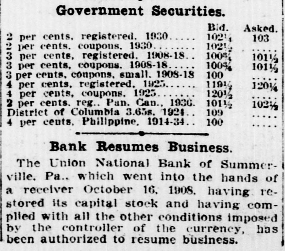 Government Securities. Bid. Asked. 1021 2 per cents. registered. 1930 103 1021 2 per cents. coupons. 1930 100% 3 per cents, registered. 1908-18.. 101½ 100% 3 per cents, coupons. 1908-18 1011/2 3 per cents, coupons, small. 1908-18 100 1191 4 per cents, registered. 1925 120½ 1201 4 per cents, coupons. 1925 2 per cents. reg.. Pan. Can., 1936. 101½ 102½ District of Columbia 3.65s. 1924.. 109 4 per cents, Philippine, 1914-34. 100 Bank Resumes Business. The Union National Bank of Summerville. Pa.. which went into the hands of a receiver October 16. 1908. having restored its capital stock and having complied with all the other conditions imposed by the controller of the currency, has been authorized to resume business.