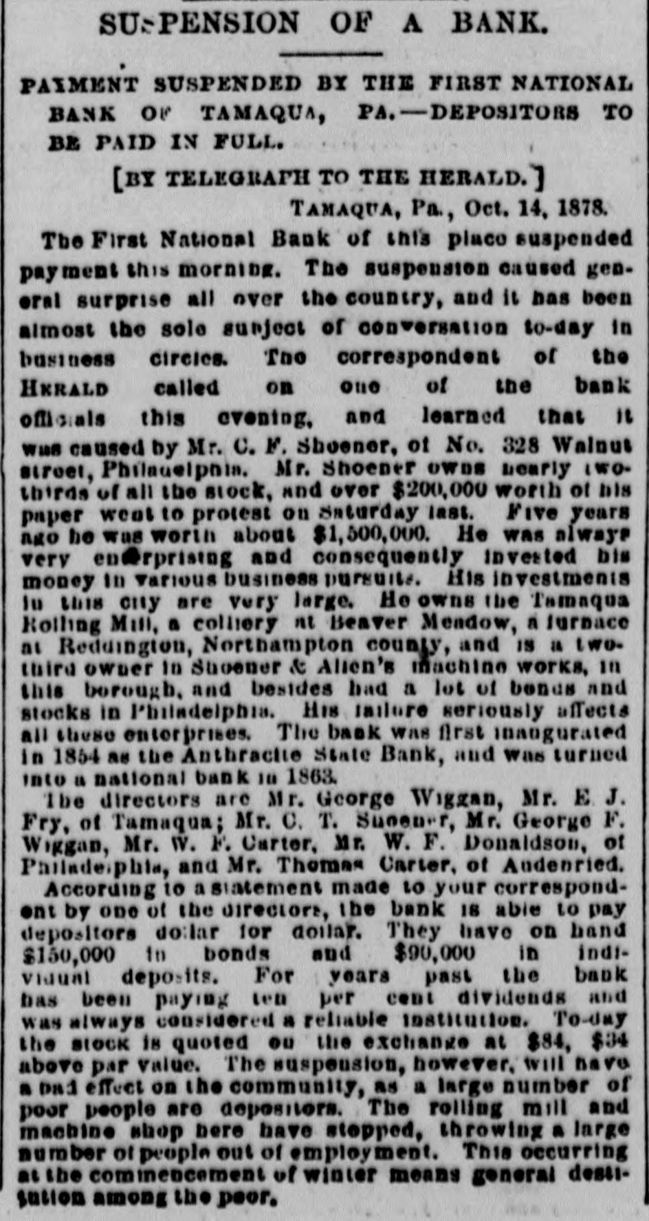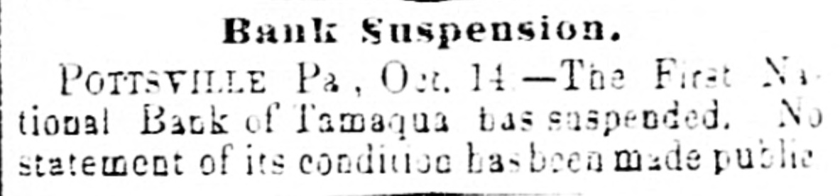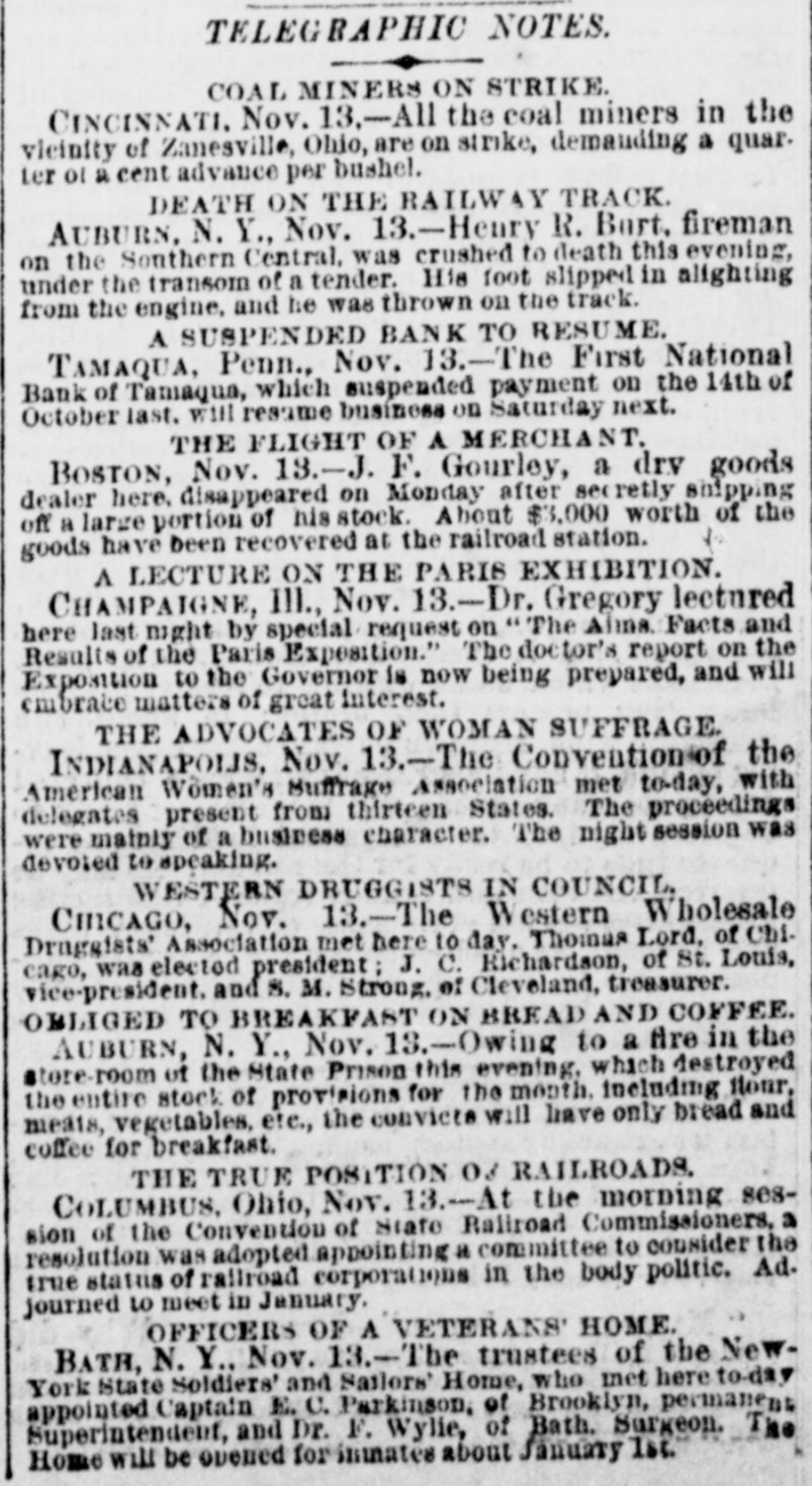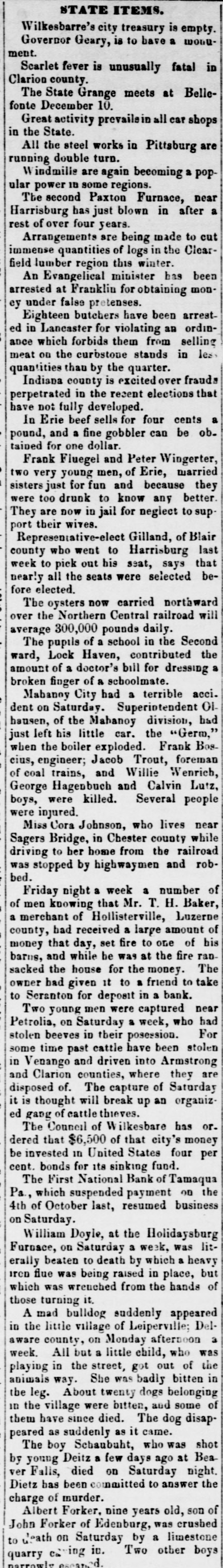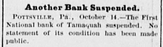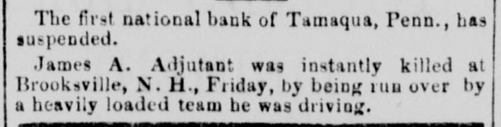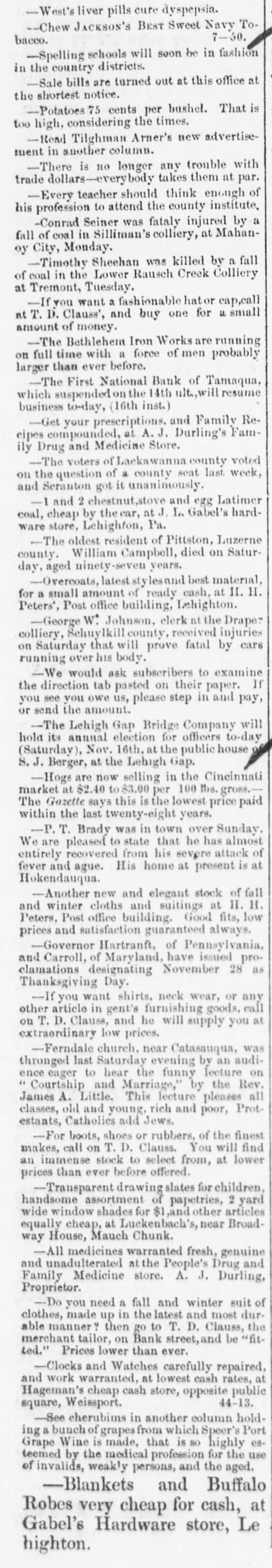 -West's liver pills cure dyspepsia. --Chew JACKSON'S BEST Sweet Navy To7-50. bacco. -Spelling schools will soon be in fashion in the country districts. -Sale bills are turned out at this office at the shortest notice. -Potatoes 75 cents per bushel. That is too high, considering the times. -Read Tilghman Arner's new advertisement in another column. -There is no longer any trouble with trade dollars-everybody takes them at par. -Every teacher should think enough of his profession to attend the county institute. -Conrad Seiner was fataly injured by a fall of coal in Silliman's colliery, at Mahanoy City, Monday. -Timothy Sheehan was killed by a fall of coal in the Lower Rausch Creek Colliery at Tremont, Tuesday. -If you want a fashionable hato cap,call at T. D. Clauss', and buy one for a small amount of money. -The Bethlehem Iron Works are running on full time with a force of men probably larger than ever before. -The First National Bank of Tamaqua, which suspended the 14th ult.,will resume business to-day, (16th inst.) -Get your prescriptions, and Family Recipes compounded, at A. J. Durling's Family Drug and Medicine Store. -The voters of Lackawanna county voted on the question of a county seat last week, and Scranton got it unanimously. -1 and 2 chestnut,stove and egg Latimer coal, cheap by the car, at J. L. Gabel's hardware store, Lehighton, Pa. -The oldest resident of Pittston, Luzerne county. William Campbell, died on Saturday, aged ninety-seven years. -Overcoats, latest stylesand best material, for a small amount of ready eash, at H. H. Peters', Post office building, Lehighton. -George w: Johnson, clerk at the Draper colliery, Schuylkill county, received injuries on Saturday that will prove fatal by cars running over his body. -We would ask subscribers to examine the direction tab pasted on their paper. If you see you owe us, please step in and pay, or send the amount. -The Lehigh Gap Bridge Company will hold its annual election for officers to-day (Saturday), Nov. 16th, at the public house S. J. Berger, at the Lehigh Gap. -Hogs are now selling in the Cincinnati market at $2.40 to $3.00 per 100 lbs. gross.The Gazette says this is the lowest price paid within the last twenty-eight years. -P. T. Brady was in town over Sunday. We are pleased to state that he has almost entirely recovered from his severe attack of fever and ague. His home at present is at Hokendauqua. -Another new and elegant stock of fall and winter cloths and suitings at H. H. Peters, Post office building. Good fits, low prices and satisfaction guaranteed always. -Governor Hartranft, of Pennsylvania, and Carroll, of Maryland, have issued proclamations designating November 28 as Thanksgiving Day. -If you want shirts, neck wear, or any other article in gent's furnishing goods, call on T. D. Clauss, and he will supply you at extraordinary low prices. -Ferndale church, near Catasauqua, was thronged last Saturday evening by an audience eager to hear the funny lecture on " Courtship and Marriage," by the Rev. James A. Little. This lecture pleases all classes, old and young, rich and poor, Protestants, Catholics add Jews. -For boots, shoes or rubbers, of the finest makes, call on T. D. Clauss. You will find an immense stock to select from, at lower prices than ever before offered. -Transparent drawing slates for children, handsome assortment of papetries, 2 yard wide window shades for $1 and other articles equally cheap, at Luckenbach's, near Broadway House, Mauch Chunk. -All medicines warranted fresh, genuine and unadulterated at the People's Drug and Family Medicine store. A. J. Durling, Proprietor. -Do you need a fall and winter suit of clothes, made up in the latest and most durable manner ? then go to T. D. Clauss, the merchant tailor, on Bank street, and be "fitted." Prices lower than ever. -Clocks and Watches carefully repaired, and work warranted, at lowest cash rates, at Hageman's cheap cash store, opposite public 44-13. square, Weissport. -See cherubims in another column holding a bunch of grapes from which Speer's Port Grape Wine is made, that is so highly esteemed by the medical profession for the use of invalids, weakly persons, and the aged. -Blankets and Buffalo Robes very cheap for cash, at Gabel's Hardware store, Le highton.