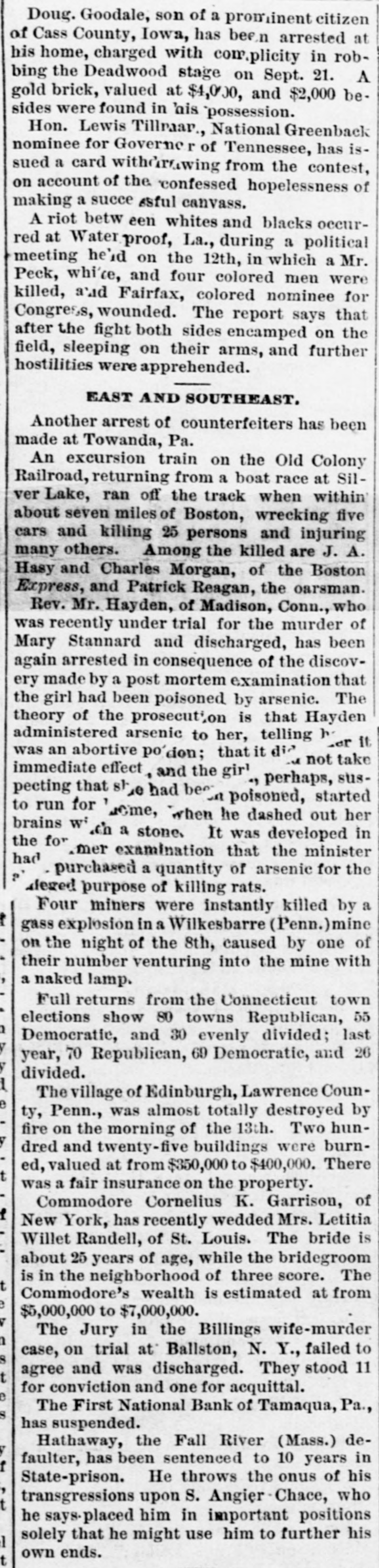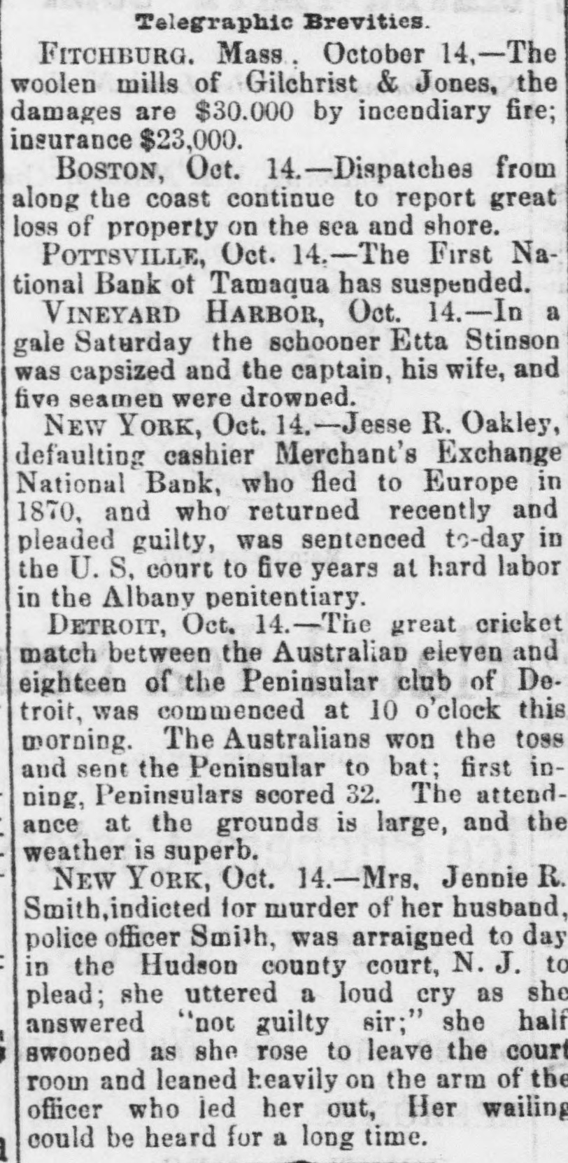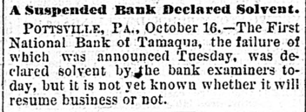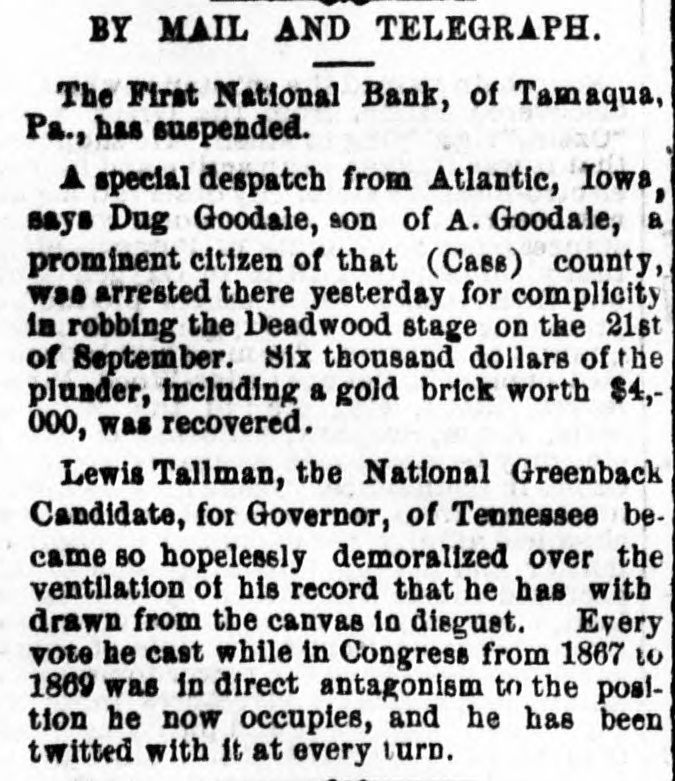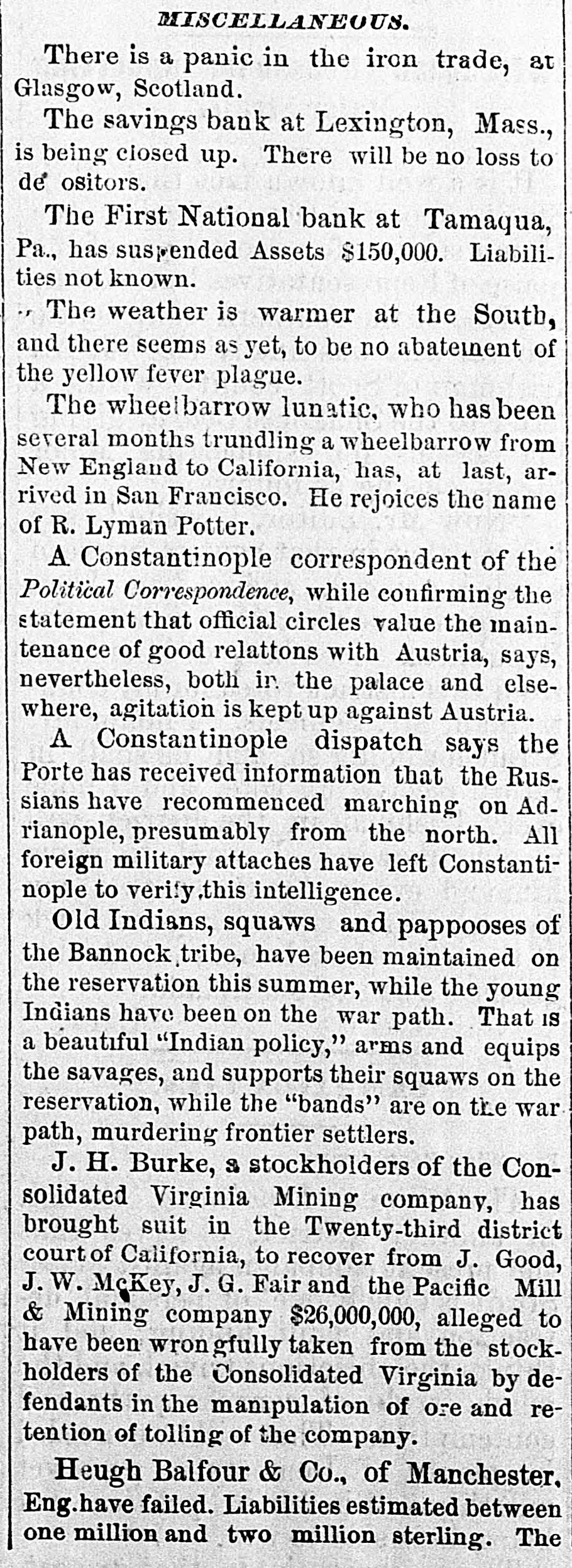 -West's liver pills cure dyspepsia. --Chew JACKSON'S BEST Sweet Navy To7-50. bacco. -Spelling schools will soon be in fashion in the country districts. -Sale bills are turned out at this office at the shortest notice. -Potatoes 75 cents per bushel. That is too high, considering the times. -Read Tilghman Arner's new advertisement in another column. -There is no longer any trouble with trade dollars-everybody takes them at par. -Every teacher should think enough of his profession to attend the county institute. -Conrad Seiner was fataly injured by a fall of coal in Silliman's colliery, at Mahanoy City, Monday. -Timothy Sheehan was killed by a fall of coal in the Lower Rausch Creek Colliery at Tremont, Tuesday. -If you want a fashionable hato cap,call at T. D. Clauss', and buy one for a small amount of money. -The Bethlehem Iron Works are running on full time with a force of men probably larger than ever before. -The First National Bank of Tamaqua, which suspended the 14th ult.,will resume business to-day, (16th inst.) -Get your prescriptions, and Family Recipes compounded, at A. J. Durling's Family Drug and Medicine Store. -The voters of Lackawanna county voted on the question of a county seat last week, and Scranton got it unanimously. -1 and 2 chestnut,stove and egg Latimer coal, cheap by the car, at J. L. Gabel's hardware store, Lehighton, Pa. -The oldest resident of Pittston, Luzerne county. William Campbell, died on Saturday, aged ninety-seven years. -Overcoats, latest stylesand best material, for a small amount of ready eash, at H. H. Peters', Post office building, Lehighton. -George w: Johnson, clerk at the Draper colliery, Schuylkill county, received injuries on Saturday that will prove fatal by cars running over his body. -We would ask subscribers to examine the direction tab pasted on their paper. If you see you owe us, please step in and pay, or send the amount. -The Lehigh Gap Bridge Company will hold its annual election for officers to-day (Saturday), Nov. 16th, at the public house S. J. Berger, at the Lehigh Gap. -Hogs are now selling in the Cincinnati market at $2.40 to $3.00 per 100 lbs. gross.The Gazette says this is the lowest price paid within the last twenty-eight years. -P. T. Brady was in town over Sunday. We are pleased to state that he has almost entirely recovered from his severe attack of fever and ague. His home at present is at Hokendauqua. -Another new and elegant stock of fall and winter cloths and suitings at H. H. Peters, Post office building. Good fits, low prices and satisfaction guaranteed always. -Governor Hartranft, of Pennsylvania, and Carroll, of Maryland, have issued proclamations designating November 28 as Thanksgiving Day. -If you want shirts, neck wear, or any other article in gent's furnishing goods, call on T. D. Clauss, and he will supply you at extraordinary low prices. -Ferndale church, near Catasauqua, was thronged last Saturday evening by an audience eager to hear the funny lecture on " Courtship and Marriage," by the Rev. James A. Little. This lecture pleases all classes, old and young, rich and poor, Protestants, Catholics add Jews. -For boots, shoes or rubbers, of the finest makes, call on T. D. Clauss. You will find an immense stock to select from, at lower prices than ever before offered. -Transparent drawing slates for children, handsome assortment of papetries, 2 yard wide window shades for $1 and other articles equally cheap, at Luckenbach's, near Broadway House, Mauch Chunk. -All medicines warranted fresh, genuine and unadulterated at the People's Drug and Family Medicine store. A. J. Durling, Proprietor. -Do you need a fall and winter suit of clothes, made up in the latest and most durable manner ? then go to T. D. Clauss, the merchant tailor, on Bank street, and be "fitted." Prices lower than ever. -Clocks and Watches carefully repaired, and work warranted, at lowest cash rates, at Hageman's cheap cash store, opposite public 44-13. square, Weissport. -See cherubims in another column holding a bunch of grapes from which Speer's Port Grape Wine is made, that is so highly esteemed by the medical profession for the use of invalids, weakly persons, and the aged. -Blankets and Buffalo Robes very cheap for cash, at Gabel's Hardware store, Le highton.