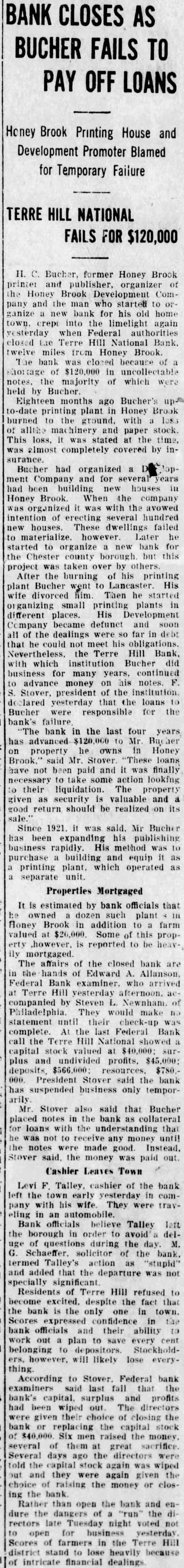 BANK CLOSES AS BUCHER FAILS TO PAY OFF LOANS Honey Brook Printing House and Development Promoter Blamed for Temporary Failure TERRE HILL NATIONAL FAILS H. Bucher, former Honey Brook printer publisher, organizer the Honey Brook Development pany and the man who started ganize bank for his old home town. into the limelight again yesterday when Federal closed Terre Hill National Bank. miles Honey Brook. bank because $120,000 in majority of which held by Bucher. Eighteen months ago Bucher's upto-date plant Honey Brook burned ground. with allthe paper stock. This loss, stated the time, was almost completely covered by insurance. Bucher had organized ment Company and for been building new houses Honey Brook When the company with the avowed intention of erecting several hundred houses. These dwellings failed to materialize. however. Later started to organize new bank for the Chester county borough this project was taken over by others. After the burning his printing plant Bucher Lancaster. His divorced him Then he organizing small printing plants in different places. His Development Company became defunct soon all of the dealings so far that not meet his the Terre Hill Bank. with which institution Bucher did business for many years. continued advance money Stover, president of the institution that loans Bucher were responsible for the bank's failure bank in the last four years Mr on property owns in Honey Brook.' said Mr. Stover "These loans not been paid and was finally necessary take some action looking their liquidation. The property given security valuable and good return should be realized on its Since 1921. was said. Mr Bucher been expanding publishing business rapidly. His method was purchase building and equip as printing plant. which operated as separate unit. Properties Mortgaged is estimated by bank officials that dozen such plant Honey Brook in addition farm valued at $20,000 Some propreported to be ily mortgaged The affairs of the closed bank the hands of Edward Allanson, Federal Bank examiner. who arrived Terre Hill yesterday afternoon companied by Steven Philadelphia They would make statement their complete. At the last Federal Bank the Terre Hill National capital stock valued $40,000 plus undivided profits, $45,000: deposits $566,000 resources. $780.President Stover the bank has suspended business only temporStover also said that Bucher placed notes bank collateral loans with the understanding that not to receive any money unti! the notes made good Instead. Stover said. the money was paid out. Cashier Leaves Town Levi Talley. cashier of the bank left the town early yesterday company with his They were travin Bank Talley left the borough order during the day. Schaeffer. solicitor the bank. termed Talley's action "stupid" and added that the departure was not specially Residents Terre Hill refused excited. despite the fact bank the one only bank officials and their ability work plan to every belonging however, will likely lose thing According to Stover. Federal bank last that bank's capital, surplus and profits had wiped The given their choice of closing bank the stock Six men raised the money. several them great Several the directors capital stock again wiped they were again given the raising the money or clos ing the bank Rather than open the bank and dure the dangers the rectors late Tuesday night voted open business yesterday Scores farmers in the Terre Hill stand lose heavily because intricate financial dealings
