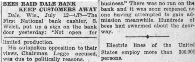 BEES RAID DALE BANK KEEP CUSTOMERS AWAY Dale, Wis., July First National bank cashier, Welch, put up sign on the bank door yesterday: "Not open for limited production His outspoken opposition to their views, Chairman Legge accused, was due to politically reasons. business." There was no run on the bank and was soon reopened, no one having attempted to gain admission meanwhile. Hundreds of bees had swarmed about the doorway. Electric lines of the United States employ more than 300,000 persons.
