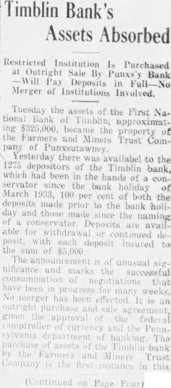 Timblin Bank's Assets Absorbed Restricted Institution Is Purchased at Outright Sale By Punxs'y Bank Pay Deposits Merger of Institutions Involved. Tuesday the assets of the First National Bank Timblin, approximatproperty of the Farmers and Miners Trust Company of Yesterday there availabel to the 1275 depositors of the Timblin bank, which been in the hands of conservator since the bank holiday March 1933, 100 per cent of both the deposits made prior to the bank holiday and those made since the conservator. Deposits naming availfor continued with each deposit insured to of The of unusual nificance and marks the successful that have been progress weeks. No merger been effected. outright purchase and given approval federal comptroller currency and the Pennbanking. The assets Timblin bank Farmers and Trust Company first instance in this Page Four)