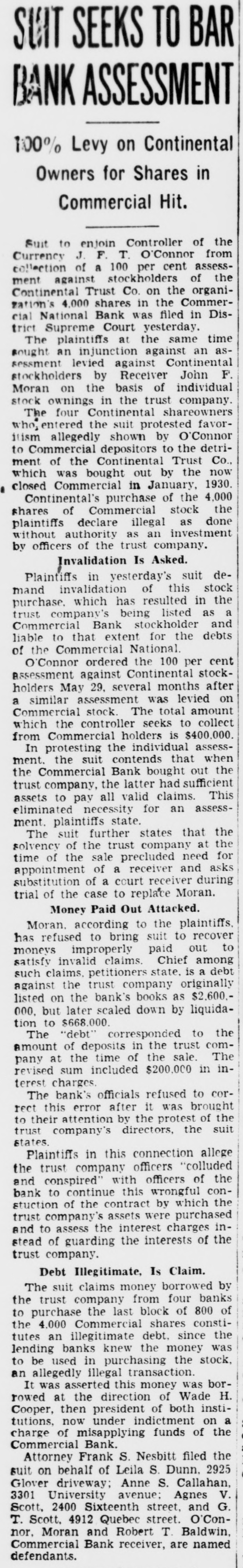 SUT SEEKS TO BAR BANK ASSESSMENT 100% Levy on Continental Owners for Shares in Commercial Hit. Suit to enjoin Controller of the Currency J. F. T. O'Connor from A per Trust on Continental ment collection against of stockholders 100 Co. cent the of organi- assess- the zation's 4,000 shares in the Commercial National Bank was filed in District Supreme Court yesterday. The plaintiffs at the same time sought an injunction against an assessment levied against Continental stockholders by Receiver John F. Moran on the basis of individual stock ownings in the trust company. The four Continental shareowners who,entered the suit protested favoritism allegedly shown by O'Connor to Commercial depositors to the detriment of the Continental Trust Co., which was bought out by the now closed Commercial in January, 1930. a Continental's purchase of the 4,000 shares of Commercial stock the plaintiffs declare illegal as done without authority as an investment by officers of the trust company. Invalidation Is Asked. Plaintiffs in yesterday's suit demand invalidation of this stock purchase. which has resulted in the trust company's being listed as a Commercial Bank stockholder and liable to that extent for the debts of the Commercial National O'Connor ordered the 100 per cent assessment against Continental stockholders May 29, several months after a similar assessment was levied on Commercial stock. The total amount which the controller seeks to collect from Commercial holders is $400,000. the assessment. In protesting the suit contends individual that when the Commercial Bank bought out the trust company, the latter had sufficient assets to pay all valid claims. This eliminated necessity for an assessment. plaintiffs state. states the of the trust company time the sale solvency The of suit further precluded that need at the for of a asks of a court during substitution appointment receiver receiver and trial of the case to replace Moran. Money Paid Out Attacked. Moran. according to the plaintiffs. has to suit recover moneys refused improperly bring paid to out to invalid a the trust company satisfy such against claims, petitioners claims. state, Chief originally is among debt listed on the bank's books as $2,600.000, but later scaled down by liquidation to $668.000. The "debt" corresponded to the Amount of deposits in the trust company at the time of the sale. The revised sum included $200,000 in interest charges. The bank's officials refused to correct this error after it was brought to their attention by the protest of the trust company's directors, the suit states. Plaintiffs in this connection allege the trust company officers "colluded and conspired' with officers of the bank to continue this wrongful constuction of the contract by which the assets were the and trust to company's assess interest charges purchased instead of guarding the interests of the trust company. Debt Illegitimate, Is Claim. The suit claims money borrowed by the trust company from four banks to the last the purchase 4.000 Commercial block shares of consti- 800 of tutes an illegitimate debt. since the lending banks knew the money was to be used in purchasing the stock, an allegedly illegal transaction. It was asserted this money was borrowed at the direction of Wade H. Cooper, then president of both institutions, now under indictment on a charge of misapplying funds of the Commercial Bank. Attorney Frank S. Nesbitt filed the suit on behalf of Leila S. Dunn. 2925 Glover driveway; Anne S. Callahan, 3301 University avenue: Agnes V. Scott. 2400 Sixteenth street, and G. T. Scott, 4912 Quebec street. O'Connor. Moran and Robert T Baldwin, Commercial Bank receiver, are named defendants.