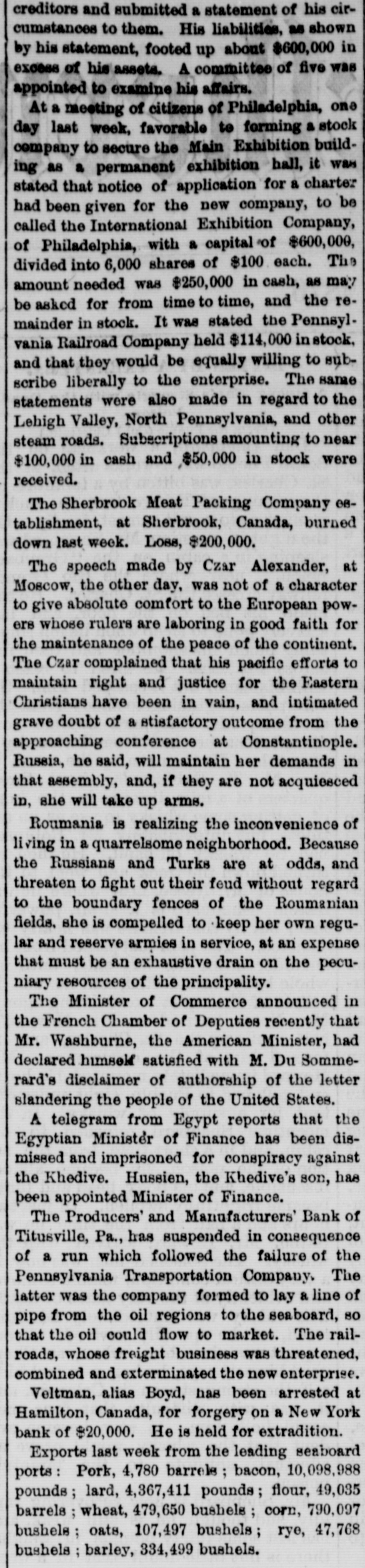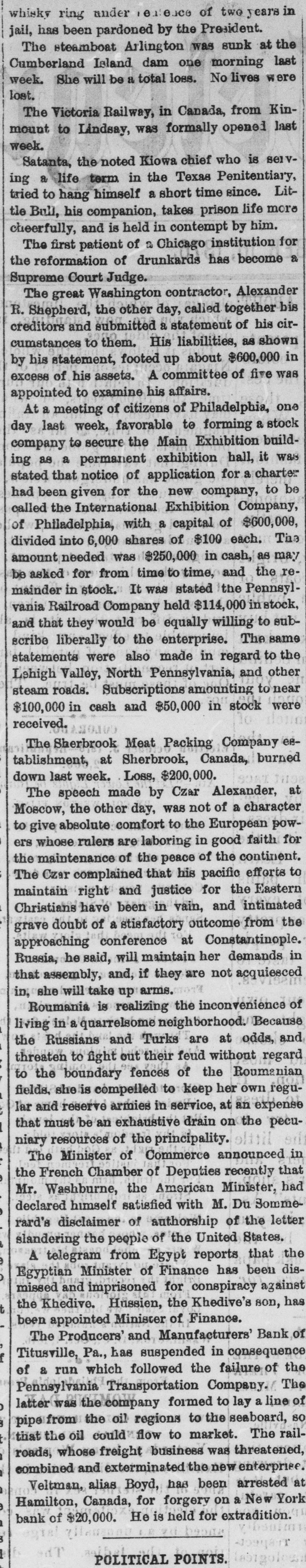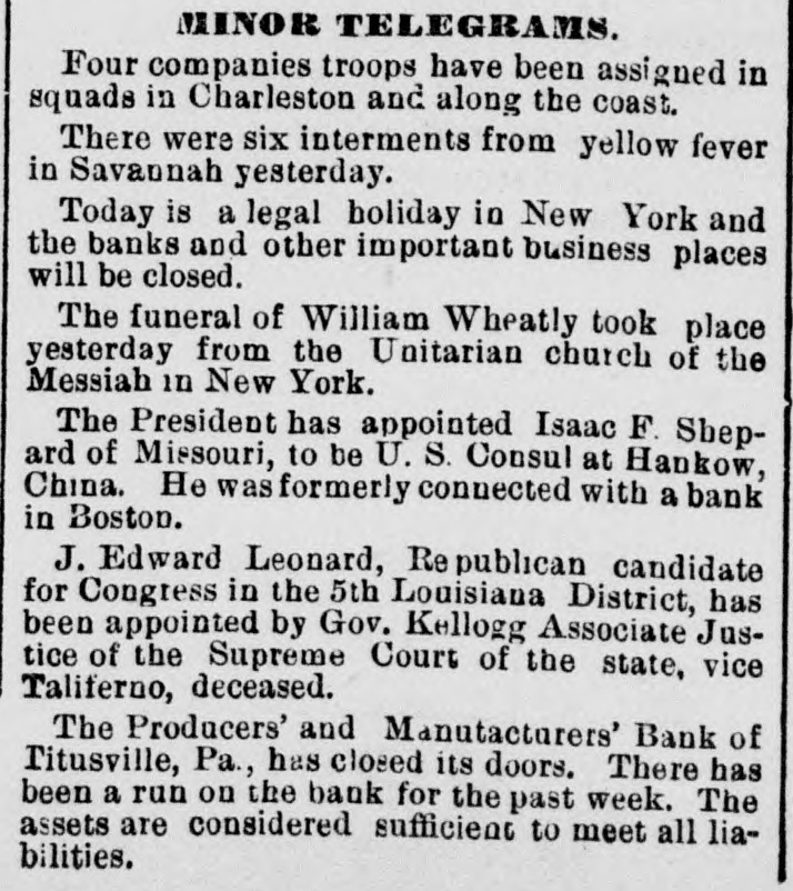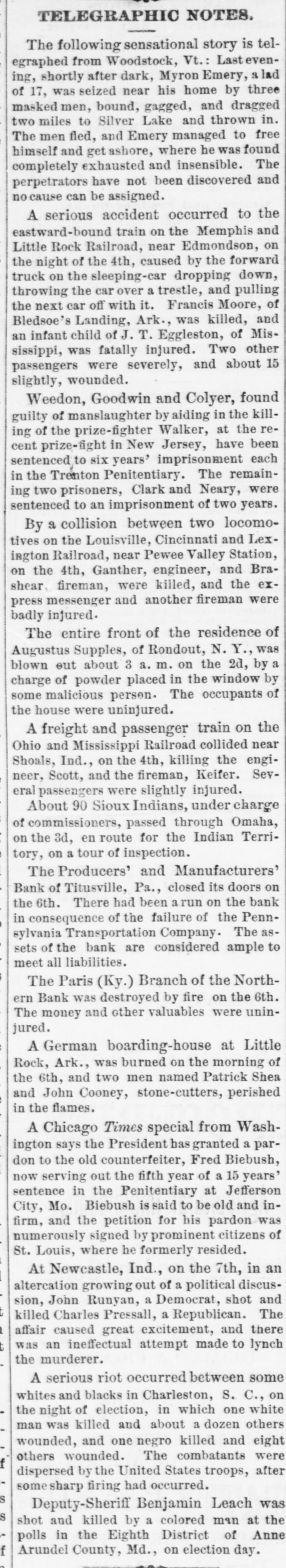 TELEGRAPHIC NOTES. The following sensational story is telegraphed from Woodstock, Vt.: Last evening, shortly after dark, Myron Emery, alad of 17, was seized near his home by three masked men, bound, gagged, and dragged two miles to Silver Lake and thrown in. The men fled, and Emery managed to free himself and get ashore, where he was found completely exhausted and insensible. The perpetrators have not been discovered and no cause can be assigned. A serious accident occurred to the eastward-bound train on the Memphis and Little Rock Railroad, near Edmondson, on the night of the 4th, caused by the forward truck on the sleeping-car dropping down, throwing the car over a trestle, and pulling the next car off with it. Francis Moore, of Bledsoe's Landing, Ark., was killed, and an infant child of J. T. Eggleston, of Mississippi, was fatally injured. Two other passengers were severely, and about 15 slightly, wounded. Weedon, Goodwin and Colyer, found guilty of manslaughter by aiding in the killing of the prize-fighter Walker, at the recent prize-fight in New Jersey, have been sentenced to six years' imprisonment each in the Trenton Penitentiary. The remaining two prisoners, Clark and Neary, were sentenced to an imprisonment of two years. By a collision between two locomotives on the Louisville, Cincinnati and Lexington Railroad, near Pewee Valley Station, on the 4th, Ganther, engineer, and Brashear, fireman, were killed, and the express messenger and another fireman were badly injured. The entire front of the residence of Augustus Supples, of Rondout, N.Y., was blown out about 3 a. m. on the 2d, by a charge of powder placed in the window by some malicious person. The occupants of the house were uninjured. A freight and passenger train on the Ohio and Mississippi Railroad collided near on the 4th, Shoals, Ind., killing the engineer, Scott, and the fireman, Keifer. Several passengers were slightly injured. About 90 Sioux Indians, under charge of commissioners, passed through Omaha, on the 3d, en route for the Indian Territory, on a tour of inspection. The Producers' and Manufacturers' Bank of Titusville, Pa., closed its doors on the 6th. There had been arun on the bank in consequence of the failure of the Pennsylvania Transportation Company. The assets of the bank are considered ample to meet all liabilities. The Paris (Ky.) Branch of the Northern Bank was destroyed by fire on the 6th. The money and other valuables were uninjured. A German boarding-house at Little Rock, Ark., was burned on the morning of the 6th, and two men named Patrick Shea and John Cooney, stone-cutters, perished in the flames. A Chicago Times special from Washington says the President has granted a pardon to the old counterfeiter, Fred Biebush, now serving out the fifth year of a 15 years' sentence in the Penitentiary at Jefferson City, Mo. Biebush is said to be old and infirm, and the petition for bis pardon was numerously signed by prominent citizens of St. Louis, where he formerly resided. At Newcastle, Ind., on the 7th, in an altercation growing out of a political discussion, John Runyan, a Democrat, shot and killed Charles Pressall, a Republican. The affair caused great excitement, and there was an ineffectual attempt made to lynch the murderer. A serious riot occurred between some whites and blacks in Charleston, S. c., on the night of election, in which one white man was killed and about a dozen others wounded, and one negro killed and eight others wounded. The combatants were t dispersed by the United States troops, after somesharp firing had occurred. 3 Deputy-Sheriff Benjamin Leach was 3 shot and killed by a colored man at the polls in the Eighth District of Anne t Arundel County, Md., on election day.
