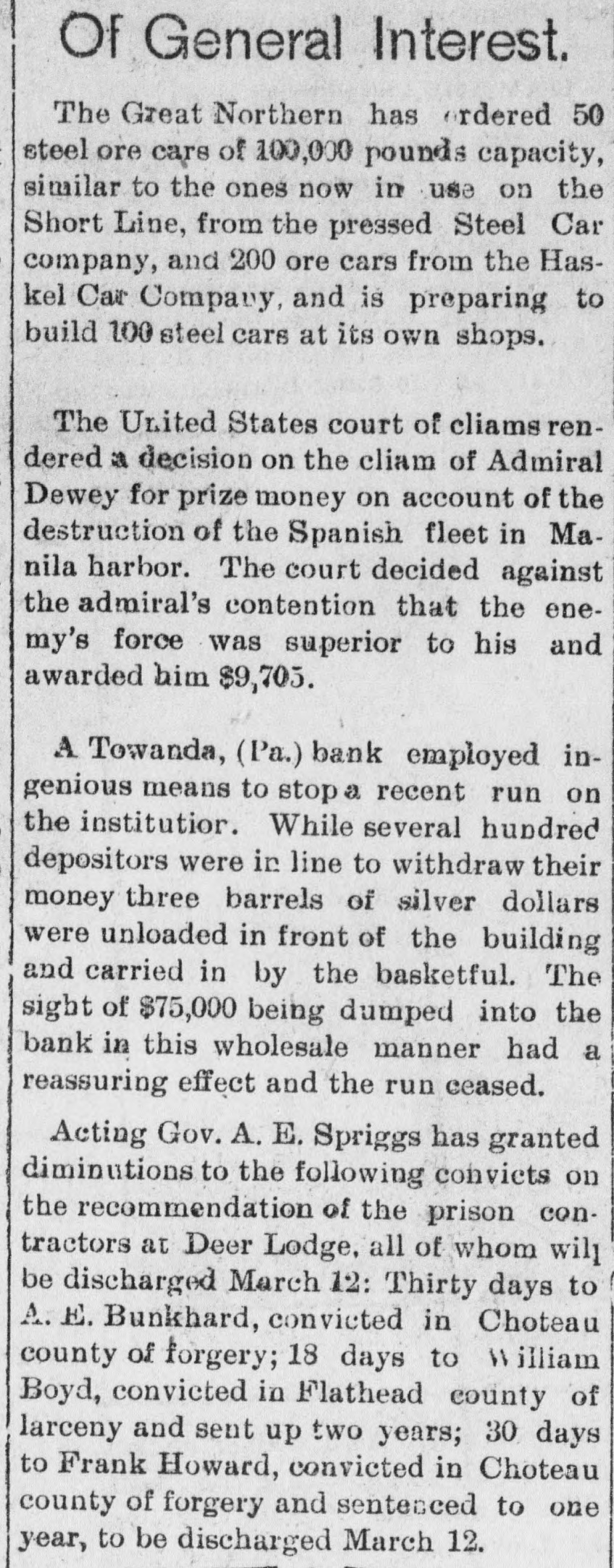 Of General Interest. The Great Northern has ordered 50 steel ore cars of 100,000 pounds capacity, similar to the ones now in use on the Short Line, from the pressed Steel Car company, and 200 ore cars from the Haskel Car Company, and is preparing to build 100 steel cars at its own shops. The United States court of cliams rendered a decision on the cliam of Admiral Dewey for prize money on account of the destruction of the Spanish fleet in Manila harbor. The court decided against the admiral's contention that the onemy's force was superior to his and awarded him $9,705. A Towanda, (Pa.) bank employed ingenious means to stop a recent run on the institutior. While several hundred depositors were in line to withdraw their money three barrels of silver dollars were unloaded in front of the building and carried in by the basketful. The sight of $75,000 being dumped into the bank in this wholesale manner had a reassuring effect and the run ceased. Acting Gov. A. E. Spriggs has granted diminutions to the following convicts on the recommendation of the prison contractors at Deer Lodge, all of whom will be discharged March 12: Thirty days to A. E. Bunkhard, convicted in Choteau county of forgery; 18 days to William Boyd, convicted in Flathead county of larceny and sent up two years; 30 days to Frank Howard, convicted in Choteau county of forgery and sentenced to one year, to be discharged March 12.