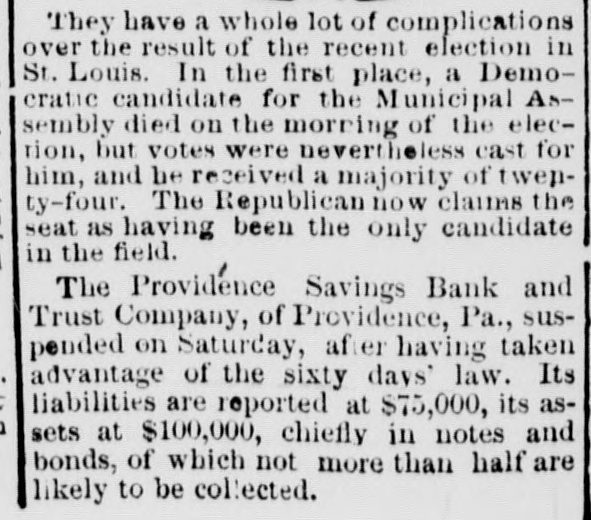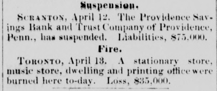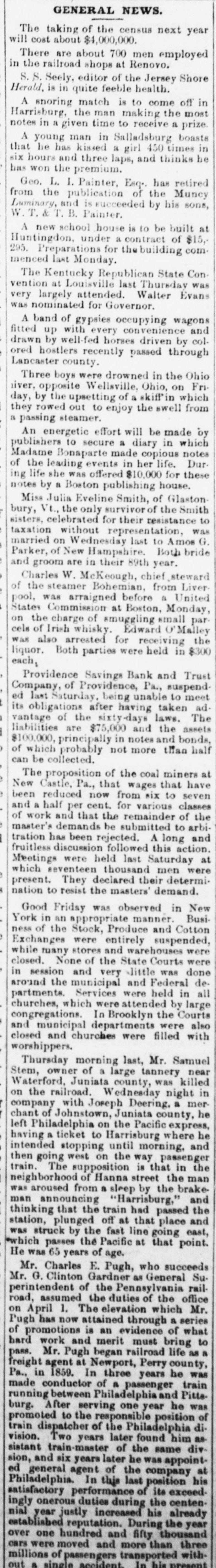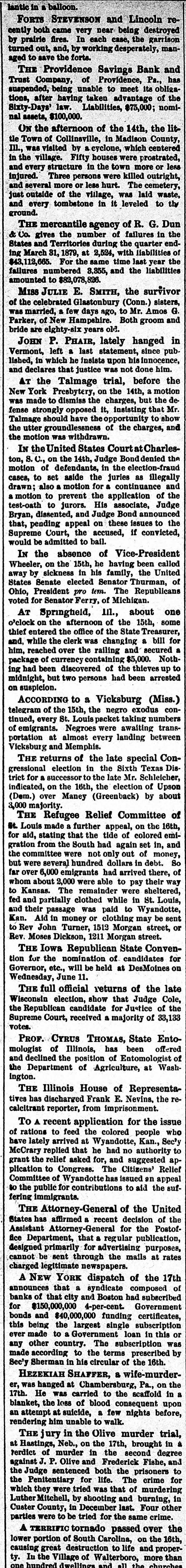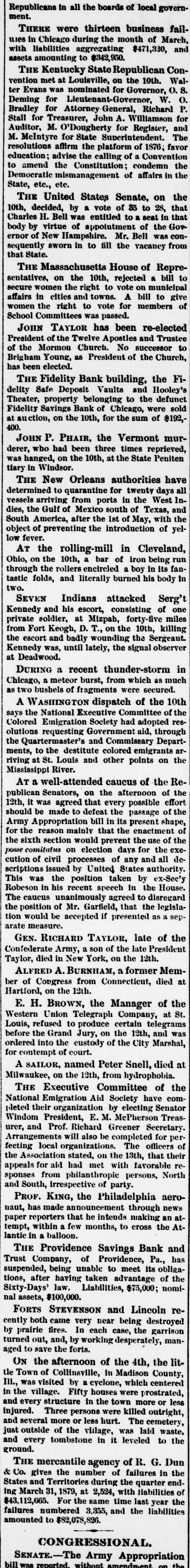 Republicans in all the boards of local government. THERE were thirteen business failuses in Chicago during the month of March, with liabilities aggregating $471,330, and assets amounting to $342,950. THE Kentucky State Republican Convention met at Louisville, on the 10th. Walter Evans was nominated for Governor, 0. S. Deming for Lieutenant-Governor, W. 0. Bradley for Attorney General, Richard P. Stall for Treasurer, John A. Williamson for Auditor, M. O'Dougherty for Register, and M. McIntyre for State Superintendent. The resolutions affirm the platform of 1876; favor education; advise the calling of a Convention to amend the Constitution; condemn the Democratic mismanagement of affairs in the State, etc., etc. THE United States Senate, on the 10th, decided, by a vote of 35 to 28, that Charles H. Bell was entitled to a seat in that body by virtue of appointment of the Governor of New Hampshire. Mr. Bell was consequently sworn in to fill the vacancy from that State. THE Massachusetts House of Representatives, on the 10th, rejected a bill to secure women the right to vote on municipal affairs in cities and towns. A bill to give women the right to vote for members of School Committees was passed. JOHN TAYLOR has been re-elected President of the Twelve Apostles and Trustee of the Mormon Church. No successor to Brigham Young, as President of the Church, has been elected. THE Fidelity Bank building, the Fidelity Safe Deposit Vaults and Hooley's Theater, property belonging to the defunct Fidelity Savings Bank of Chicago, were sold at auction, on the 10th, for the sum of $192,400. JOHN P. PHAIR, the Vermont murderer, who had been three times reprieved, was hanged, on the 10th, at the State Peniten tiary in Windsor. THE New Orleans authorities have determined to quarantine for twenty days all vessels arriving from ports in the West Indies, the Gulf of Mexico south of Texas, and South America, after the 1st of May, with the object of preventing the introduction of yellow fever. AT the rolling-mill in Cleveland, Ohio, on the 10th, a bar of iron being run through the rollers encircled a boy in its fantastic folds, and literally burned his body in two. SEVEN Indians attacked Serg't Kennedy and his escort, consisting of one private soldier, at Mizpah, forty-five miles from Fort Keogh, D. T., on the 10th, killing the escort and badly wounding the Sergeant. Kennedy was, until lately, the signal observer at Deadwood. DURING a recent thunder-storm in Chicago, a meteor burst, from which as much as two bushels of fragments were secured. A WASHINGTON dispatch of the 10th says the National Executive Committee of the Colored Emigration Society had adopted resolutions requesting Government aid, through the Quartermaster's and Commissary Departments, to the destitute colored emigrants arriving at St. Louis and other points on the Mississippi River. AT a well-attended caucus of the Republican Senators, on the afternoon of the 12th, it was agreed that every possible effort should be made to defeat the passage of the Army Appropriation bill in its present shape, for the reason mainly that the enactment of the sixth section would prevent the use of the posse comitatus on election days for the execution of civil processes of any and all descriptions issued by United States authority. This was the position taken by ex-Sec'y Robeson in his recent speech in the House. The caucus unanimously agreed to disregard the position of Mr. Garfield, that the legislation would be accepted if presented as a separate measure. GEN. RICHARD TAYLOR, late of the Confederate Army, a son of the late President Taylor, died in New York, on the 12th. ALFRED A. BURNHAM, a former Member of Congress from Connecticut, died at Hartford, on the 12th. E. H. BROWN, the Manager of the Western Union Telegraph Company, at St. Louis, refused to produce certain telegrams before the Grand Jury, on the 12th, and was ordered into the custody of the City Marshal, for contempt of court. A SAILOR, named Peter Snell, died at Milwaukee, on the 12th, from hydrophobia. THE Executive Committee of the National Emigration Aid Society have completed their organization by electing Senator Windom President, E. M. McPherson Treasurer, and Prof. Richard Greener Secretary. Arrangements will also be completed for perfeeting local organizations. The officers of the Association stated, on the 13th, that their appeals for aid had met with favorable responses from philanthropic persons, North and South, irrespective of party. PROF. KING, the Philadelphia aeronaut, has made announcement through news paper reporters that he intends making an attempt, within a few months, to cross the Atlantic in a balloon. THE Providence Savings Bank and Trust Company, of Providence, Pa., has suspended, being unable to meet its obligations, after having taken advantage of the Sixty-Days' law. Liabilities, $75,000; nominal assets, $100,000. FORTS STEVENSON and Lincoln recently both came very near being destroyed by prairie fires. In each case, the garrison turned out, and, by working desperately, managed to save the forts. ON the afternoon of the 4th, the little Town of Collinsville, in Madison County, III., was visited by a cyclone, which centered in the village. Fifty houses were prostrated, and every structure in the town more or less injured. Three persons were killed outright, and several more or less hurt. The cemetery, just outside of the village, was laid waste, and every tombstone in it leveled to the ground. THE mercantile agency of R. G. Dun & Co. gives the number of failures in the States and Territories during the quarter ending March 31, 1879, at 2,524, with liabilities of $43,112,665. For the same time last year the failures numbered 3,355, and the liabilities amounted to $82,078,826. CONGRESSIONAL. SENATE.-The Army Appropriation bill reported. without amendment the