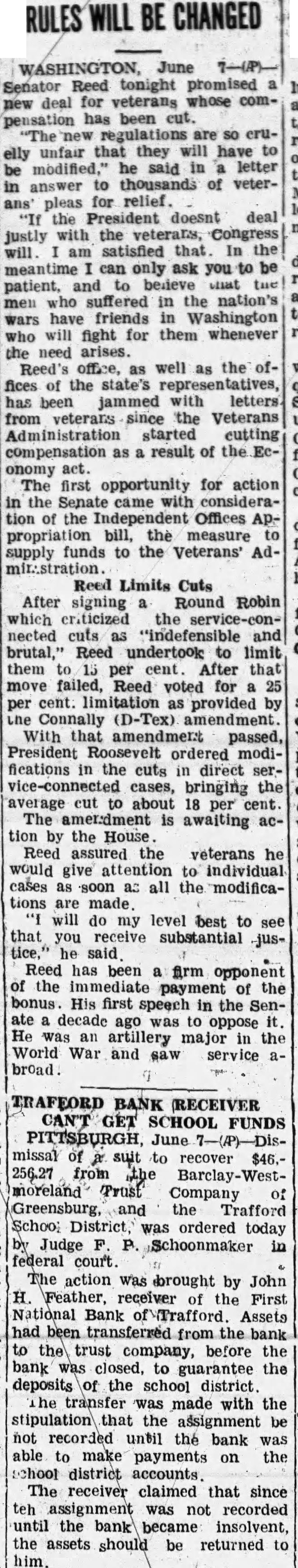 WASHINGTON, June 7-(P)Senator Reed tonight promised new deal for veterans whose compensation has been cut. new regulations are so cruunfair that they will have elly modified,' he said in letter be in answer to thousands of veterpleas for relief ans' "If the President doesnt deal justly with the veterans, Congress will am satisfied that In the meantime can only ask you to be patient, and to believe that tue men who suffered in the nation's wars have friends in Washington who will fight for them whenever the need arises. Reed's office, as well as the offices the state's has been jammed with letters from veterans since the Veterans Administration started cutting compensation as a result of the onomy act. The first opportunity for action in the Senate came with consideration the Independent Offices Appropriation bill, the measure to supply funds to the Veterans' AdReed Limits Cuts After signing Round Robin which criticized the service-connected cuts as "indefensible and brutal," Reed undertook to limit them per cent After that move failed, Reed voted for a 25 per cent. limitation as provided by the Connally (D-Tex) amendment. With that amendment passed, President Roosevelt ordered modifications in the cuts in direct service-connected cases, bringing the average cut to about 18 per cent The amerdment is awaiting action by the House Reed assured the veterans he would give attention to individual cases as soon as all the modifications are made will do my level best to see that you receive substantial jushe said Reed has been a firm opponent of the immediate payment of the bonus. His first speech in the Senate decade ago was to oppose it. He was an artillery major in the World War and saw service