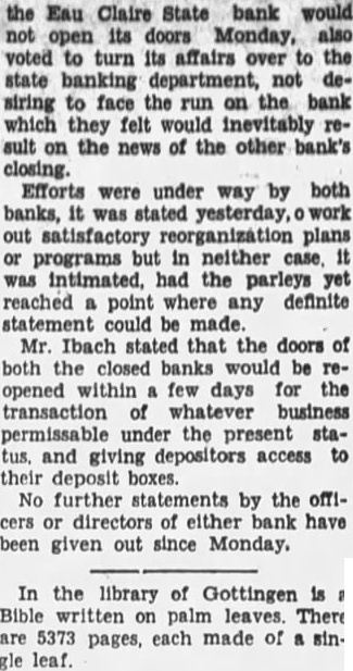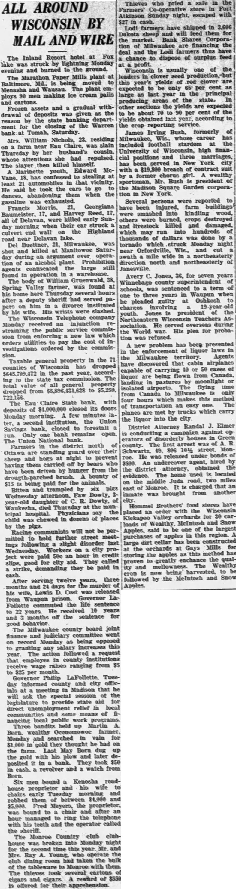 Inland Resort hotel at Fox The lake struck by lightning Monday was evening and burned to the ground. The Marathon Paper Mills plant Baltimore, Md., is being moved Menasha and Wausau. The plant 90 men making ice cream pails ploys cartons. and gradual withFrozen assets was given as the drawal of deposits the state departreason the closing of the Warren ment for bank Tomah, Saturday. Mrs. William Nichols, 23, residing farm near Eau Claire, was slain her husband's cousin, by whose Thursday attentions she had repulsed. The slayer then killed himself. Marinette youth, Edward MeVane, 18, has to stealing at 21 in that vicinity. least said he took the cars go He them when the dances, gasoline was exhausted. Morris, 21, Georgiana Francis Baumeister, and Harvey all of Delavan, were killed early Sunwhen their car struck day morning wall the Highland culvert road near Delavan lake. Del Buettner, 21, Milwaukee, was shot and killed at Manitowee Saturday during an argument over operation of an alcohol plant. Prohibition agents confiscated the large still found in operation in warehouse. The body of William Gruenwald, 38, Spring Valley farmer, was found at his here Thursday hours after deputy sheriff served pahim divorce instituted pers on wife. wrists were slashed. The Wisconsin Telephone company Monday received injunction straining the public service commission from enforcing new law which orders utilities to pay the cost of vestigations ordered by the commisTaxable general property in the counties Wisconsin has dropped in the past year. according to the tax The value of all general property total $5,896,431,628 to $5,250. dropped from Claire State bank. with The Eau closed its doors deposits of $4,000,000 Monday morning. few minutes lasecond institution. the Union Savings bank. closed to forestall Only one bank remains Union National Farmers in the district north of Ottawa standing guard over their sheep and hogs at night to prevent having them off by bears who have been driven by hunger from the brush. A bounty of $15 is being paid for the animals. Bitten and trampled by six pigs Faw Dowty, daughter of Dowty, Thursday the icipal hospital. Physicians say the child was chewed in dozens of places by the pigs. Racine communists will not be perhold further street meetmitted to ings slight disorder last Wednesday. Workers city prohour in credit ject were paid an for aid. They called slips, good city demanding they be paid in strike, cash. After serving twelve years, three months and 24 days for the murder Lewis D. Cost was released his wife, from Waupun prison. Governor LaFollette the life sentence He 10 years years. and months off the sentence for good behavior. The Milwaukee county board joint finance and judiciary went record Monday being opposed granting any salary increases this year. The action followed request that employes in county institutions receive wage raises ranging from $5 per month. Governor Philip LaFollette. Tuesday informed county and city officmeeting in Madison that he will ask the special session of the legislature to provide state aid for direct relief in local and of nancing local public work Three bandits held up Martin Born. farmer, and in vain for Monday in gold they he had the farm. Last May Born dug with plow later gold in bank. They took posited cash. revolver and watch from Born. Six men bound Kenosha readwife house proprietor chairs early Tuesday morning and robbed them of between $4,000 Fred Meyers, the proprietor, bound chair and after an was hour managed to ring the telephone with his teeth and the operator called the sheriff. The Monroe Country club clubhouse was broken into Monday night for time this year. Mr. and Mrs. Ray who operate the club dining room had taken the bulk the tableware Monroe with them. The thieves took several cartons cigars and reward of $550 cigars. offered for their